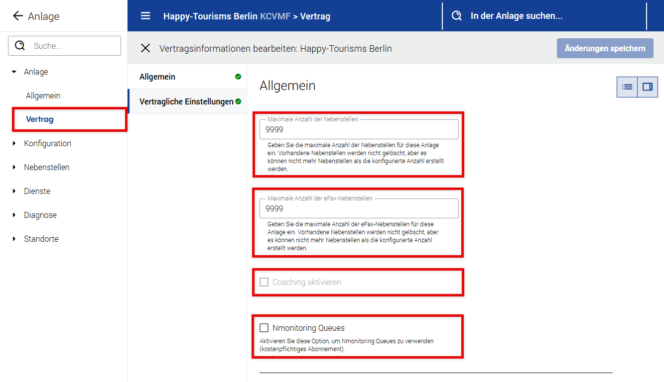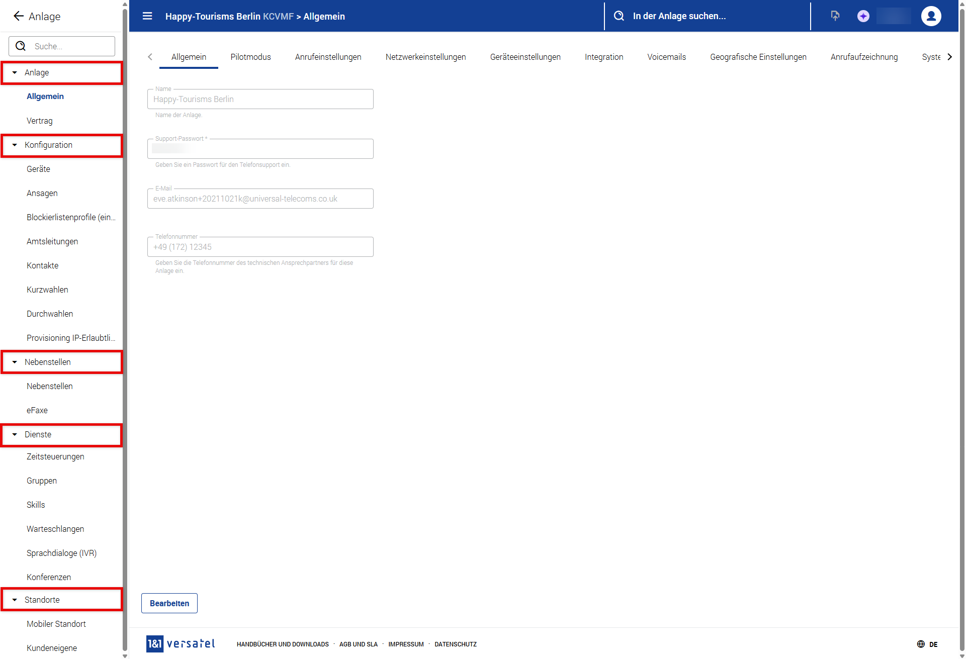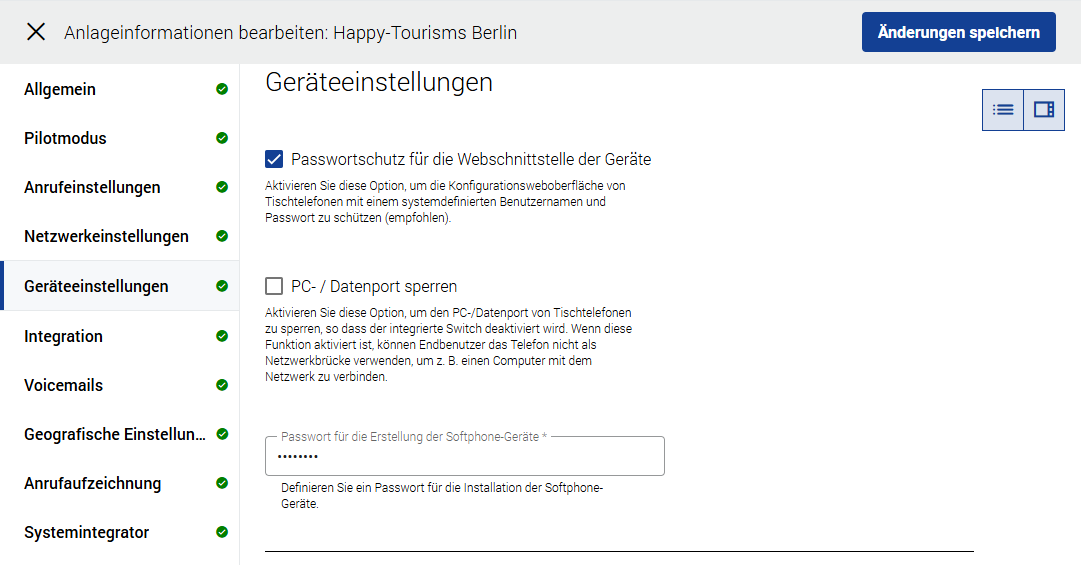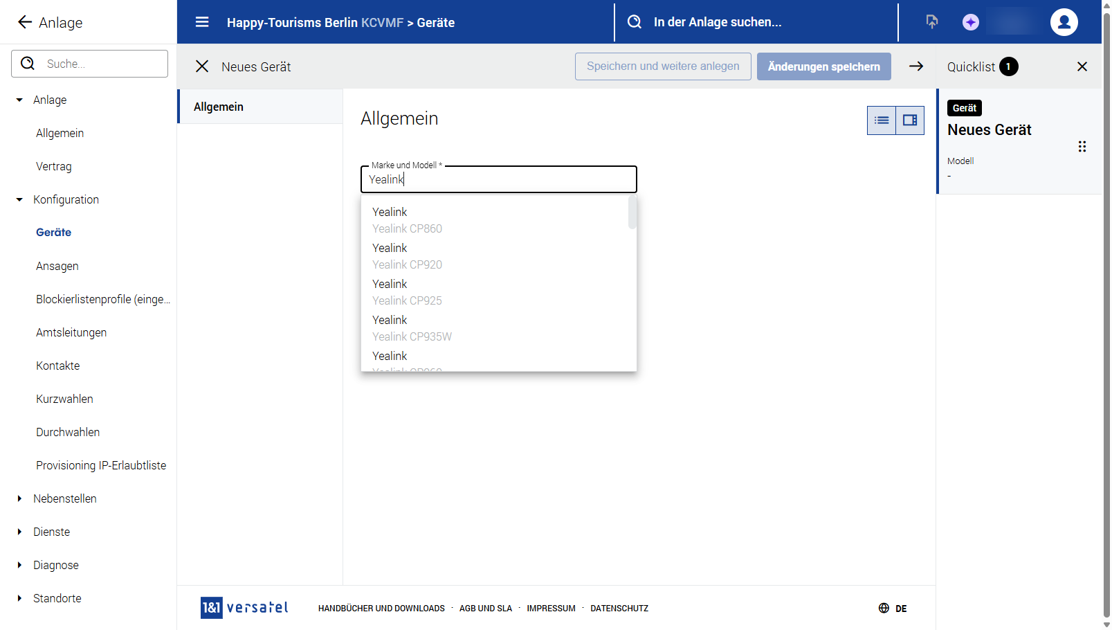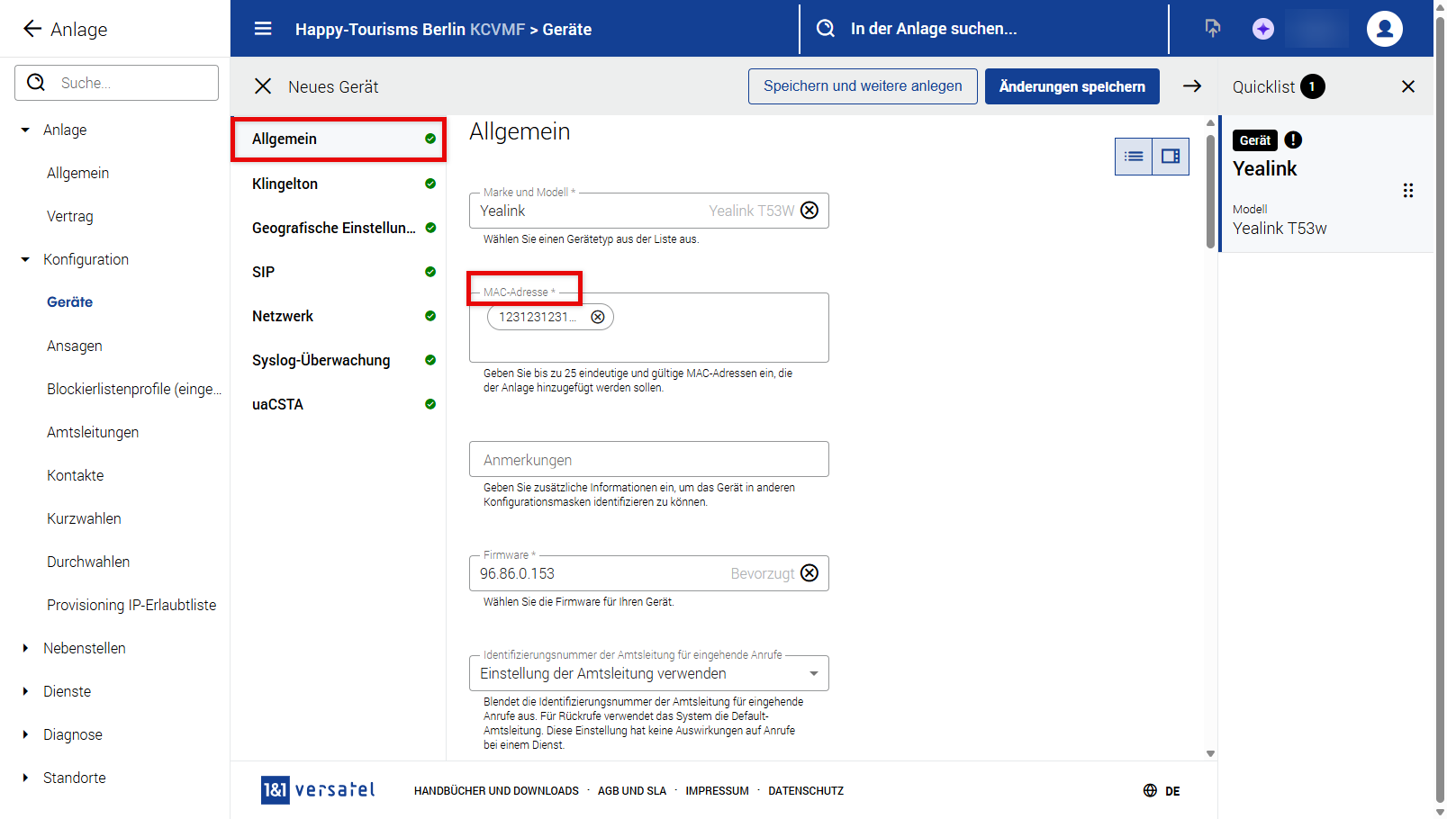 Konfiguration (Geräte, Ansagen, Blocklistenprofile für eingehende Anrufe, Amtsleitungen, Kontakte, Durchwahlen und Provisioning IP-Erlaubtliste)