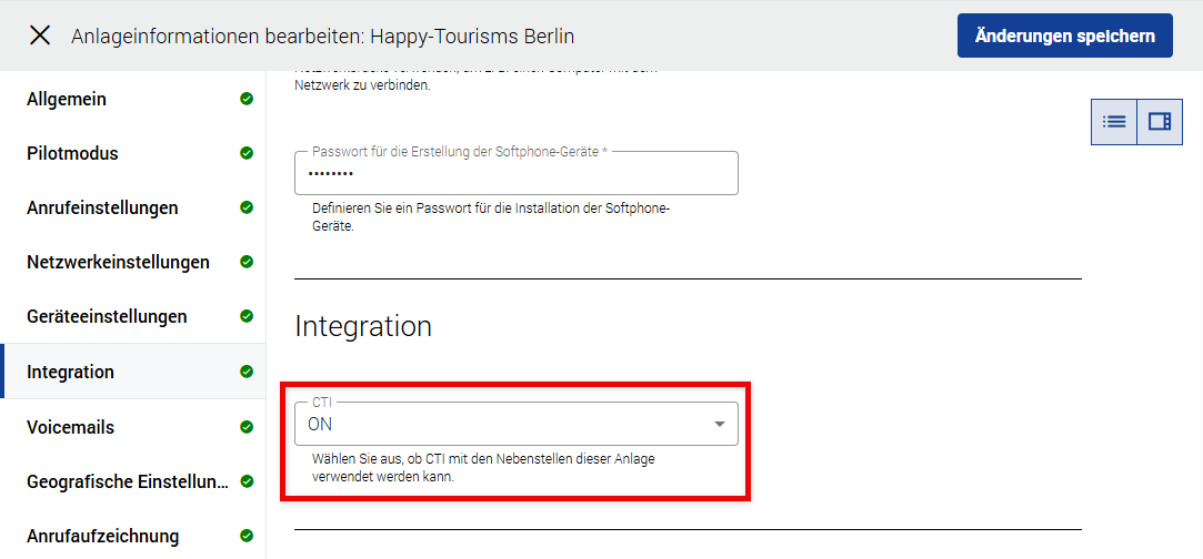 Unter Integration können Sie sehen, ob CTI an der Anlage aktiviert oder deaktiviert ist (schreibgeschützt). Um es auf einem Ziel zu aktivieren, muss diese Einstellung später unter Nebenstellen konfiguriert werden.