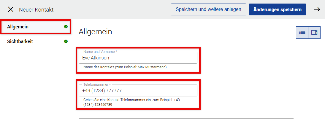 Name und Vorname | Weist dem Kontakt einen Namen zu. |