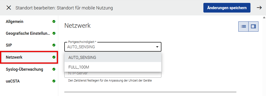 SIP-Transportprotokoll | Ermöglicht die Festlegung, über welches Transportprotokoll Geräte/Apps dieses Standorts kommunizieren. Bitte beachten Sie, dass TLS in der Regel eine kostenpflichtige Funktion ist, die pro Gerät berechnet wird. Bitte beachten Sie, dass beim Zurücksetzen dieser Einstellung alle vom Endbenutzer zertifizierten Geräte neu gebootet werden. |