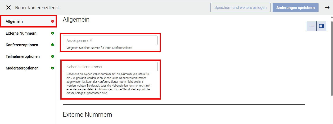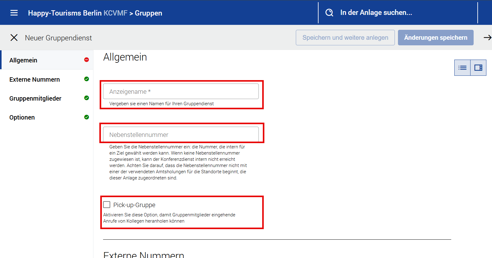 Anzeigename | Dies ist ein Pflichtfeld und kann bis zu 50 Zeichen lang sein. Es gelten die gleichen Regeln wie im Abschnitt Telefonnebenstellen. |