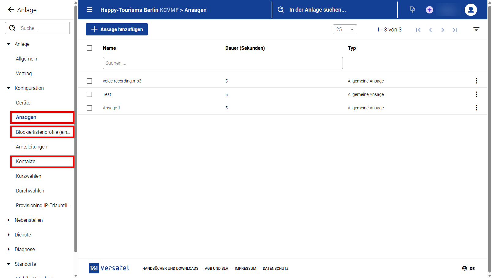 Unter Konfiguration > Ansagen können Sie eine Liste aller Ansagen einsehen, die an der Anlage hinzugefügt wurden. Bitte beachten Sie, dass Ansagen, die in anderen Bereichen der Konfiguration hochgeladen wurden, z. B. in einer Warteschlange oder einem Sprachdialogdienst, ebenfalls aufgelistet sind und in diesem Abschnitt verwaltet werden können.