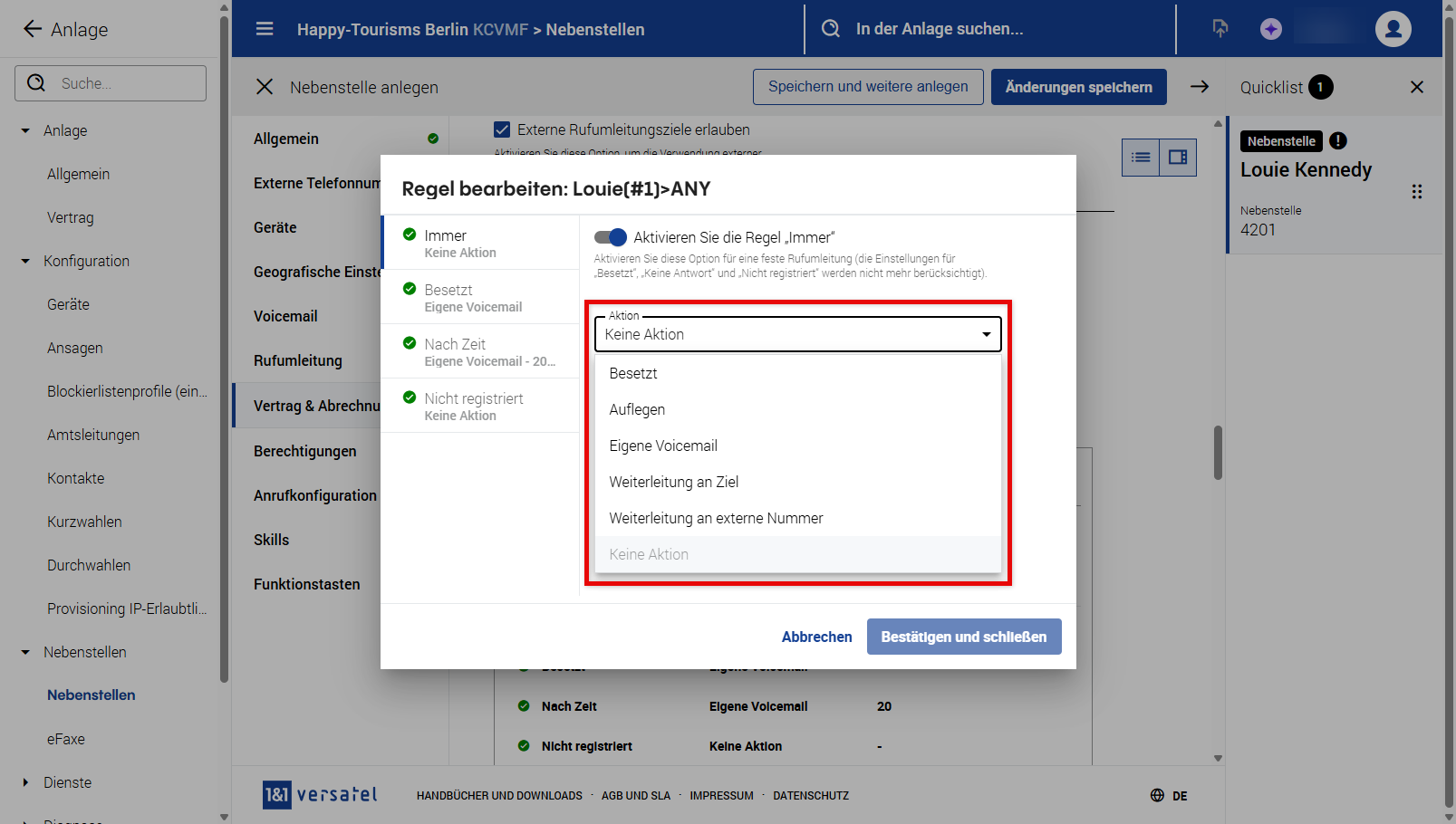 Nebenstelle | Weist eine interne Nebenstellennummer zu. Bitte beachten Sie, dass die Zuweisung einer Nebenstellennummer nicht zwingend erforderlich ist, sodass Sie dieses Feld auch frei lassen können. Wenn Sie sich für die Zuweisung einer Nebenstellennummer entscheiden, beachten Sie bitte, dass die gleichen Regeln gelten wie im Abschnitt Telefonnebenstellen. |