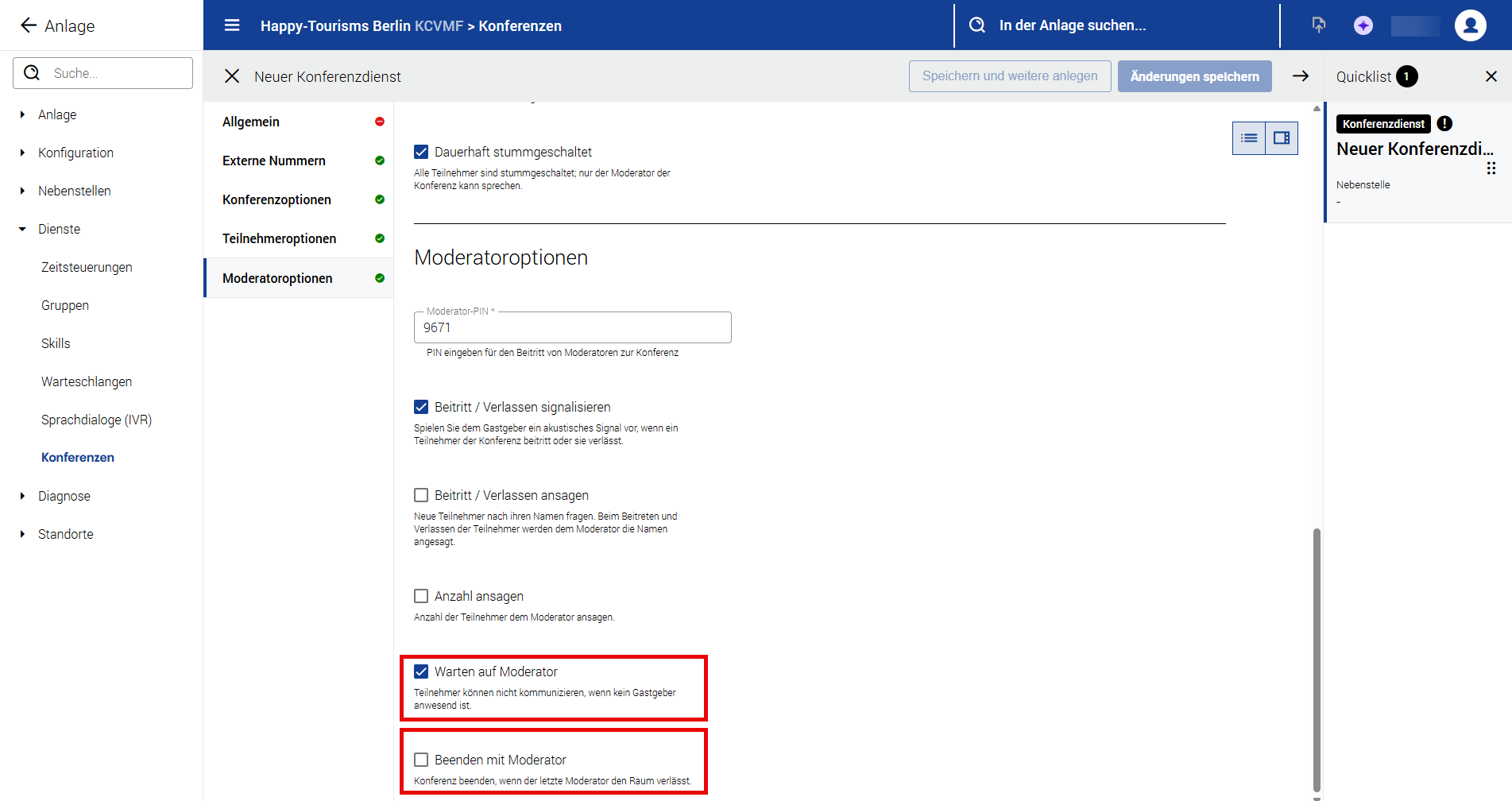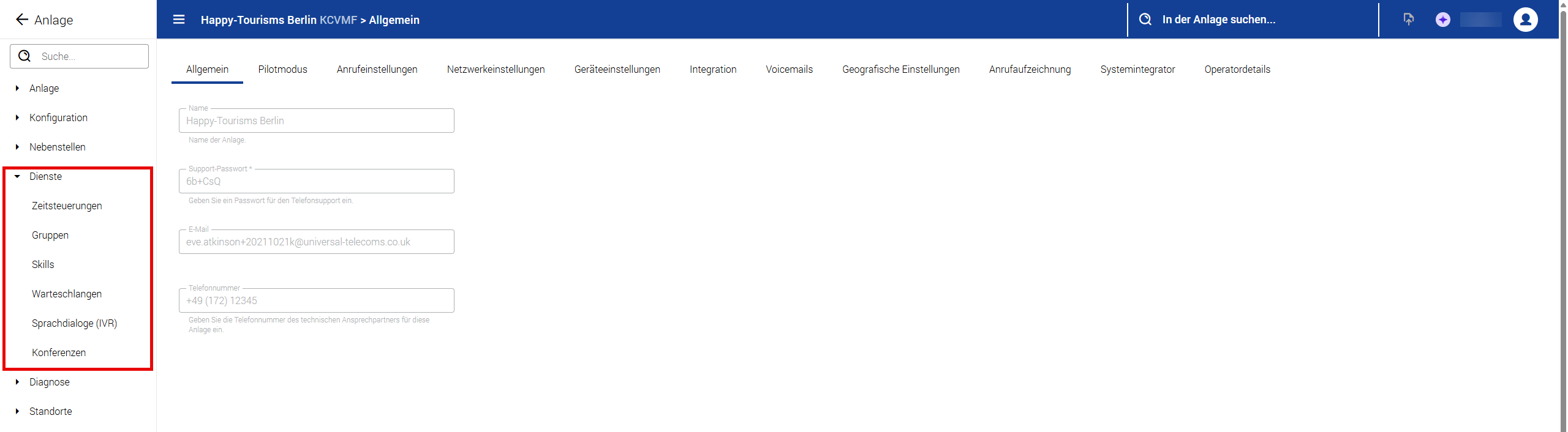 Dienste (Zeitsteuerung, Gruppen, Skills, Warteschlangen, Sprachdialoge IVRs und Konferenzen)