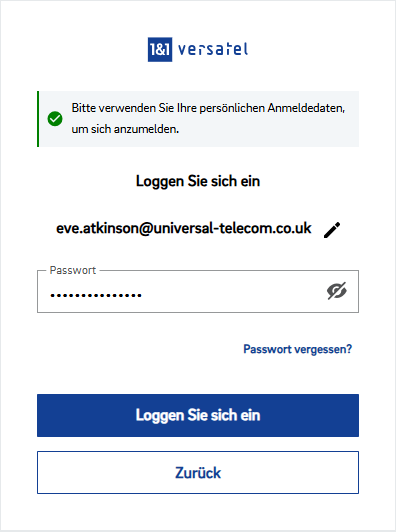Geben Sie Ihren Benutzernamen (Ihre E-Mail) und Ihr Passwort ein (das Ihnen von 1&1 Versatel zur Verfügung gestellt wurde).