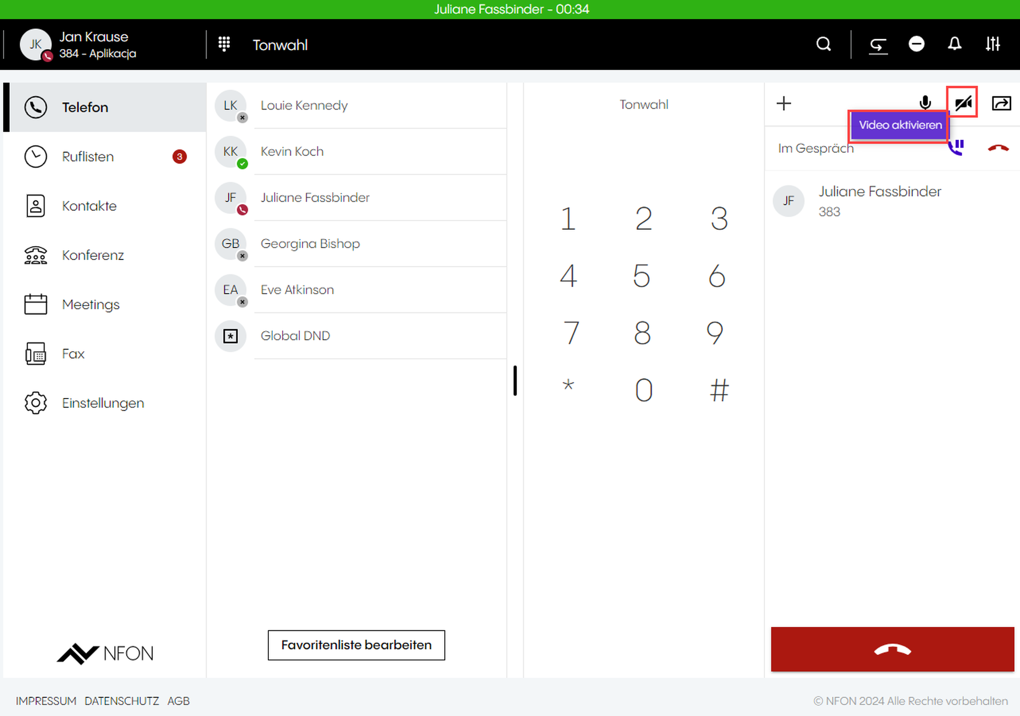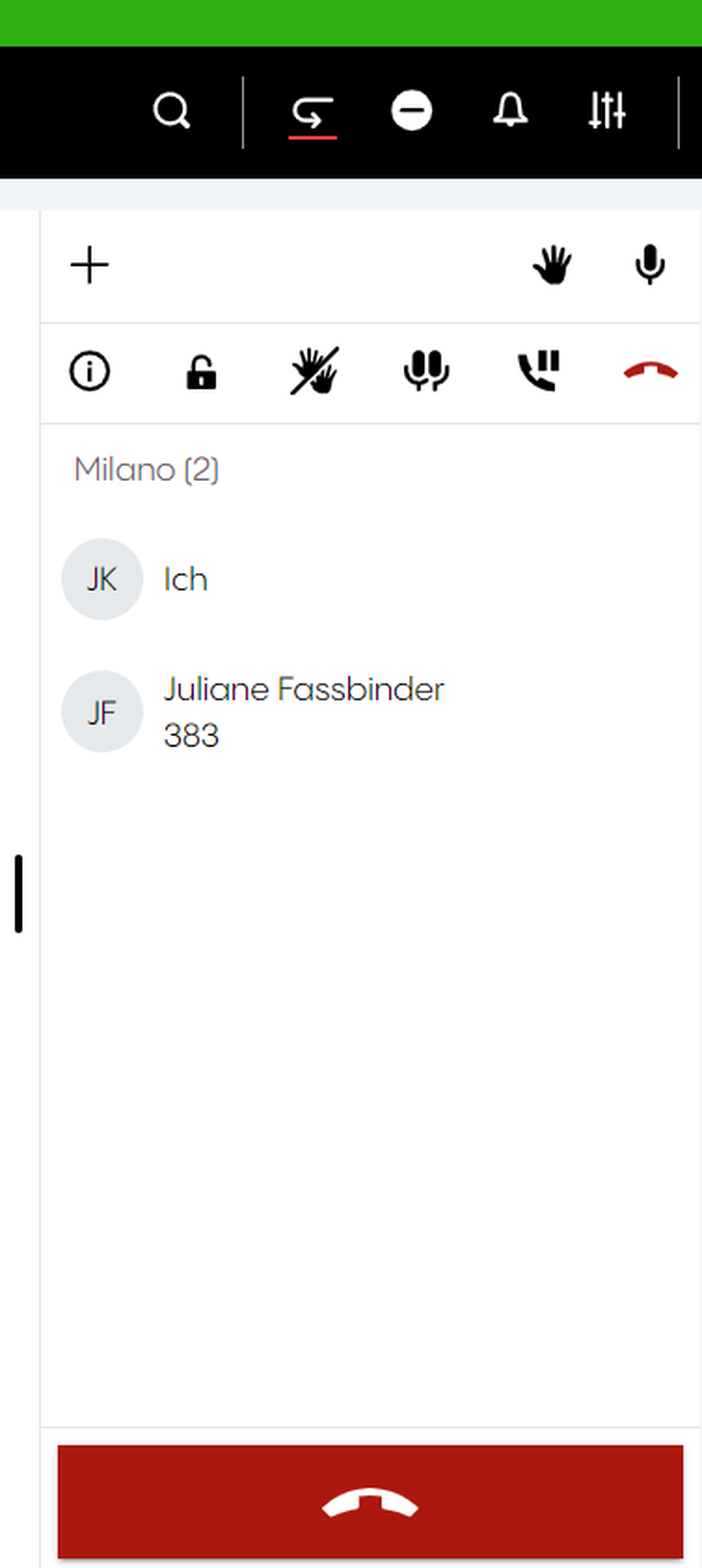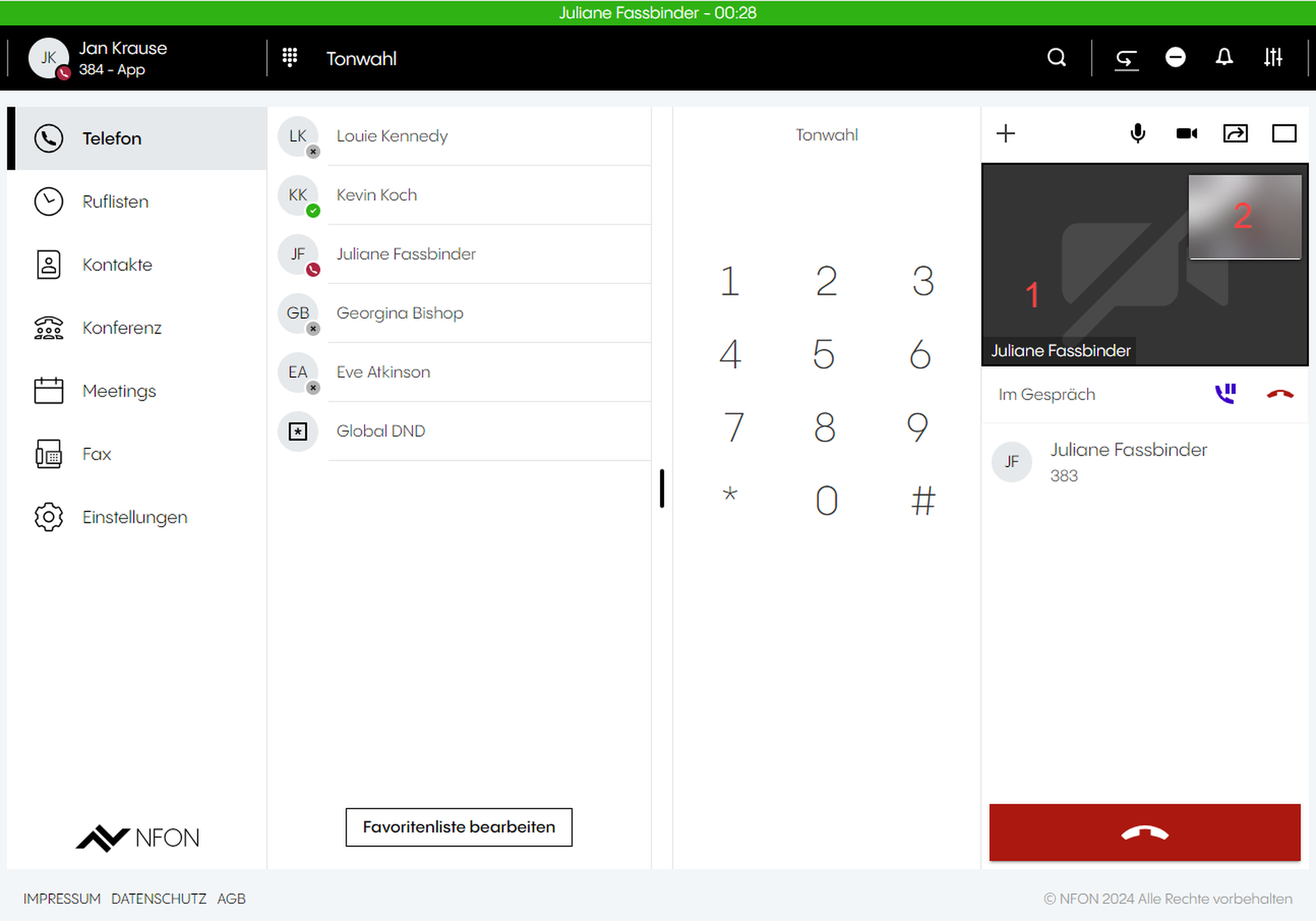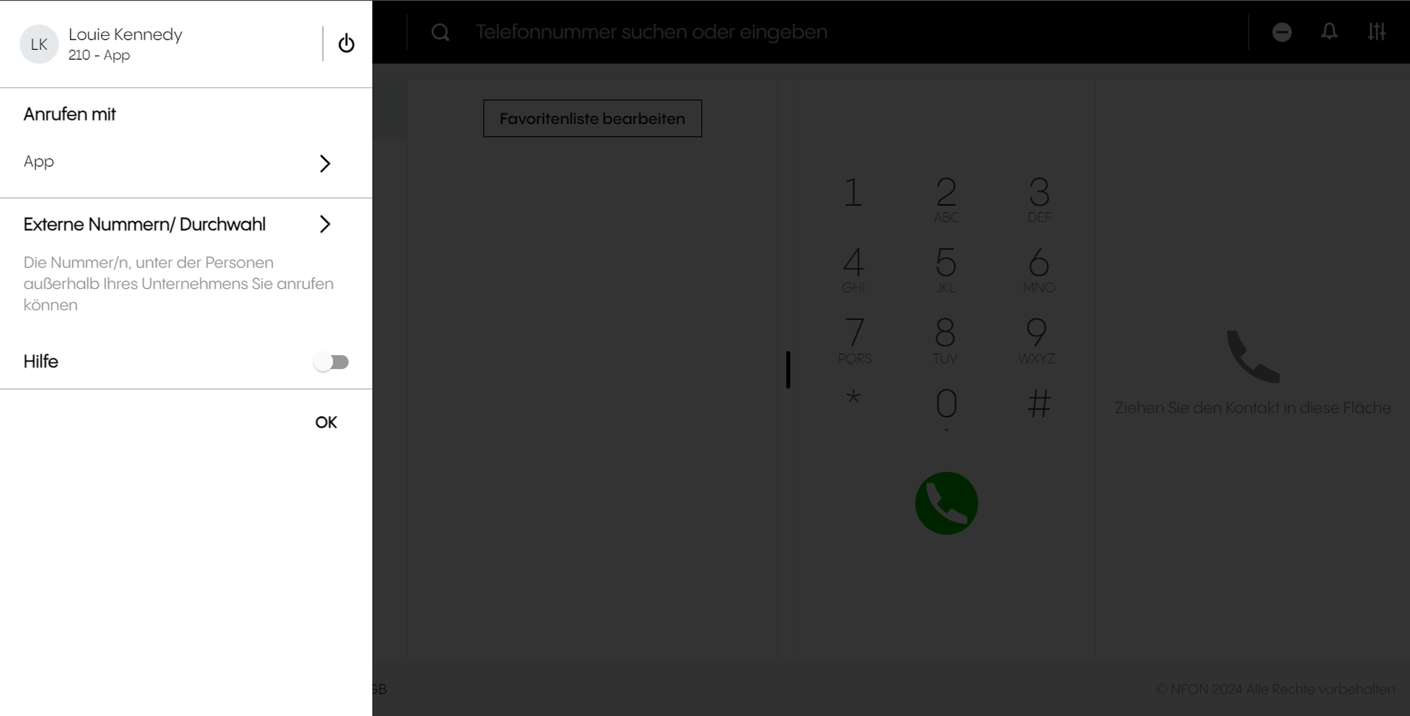Ist das App-Menü eingeklappt, sehen Sie oben links Ihren Namen und das ausgewählte Endgerät, mit dem Sie telefonieren.