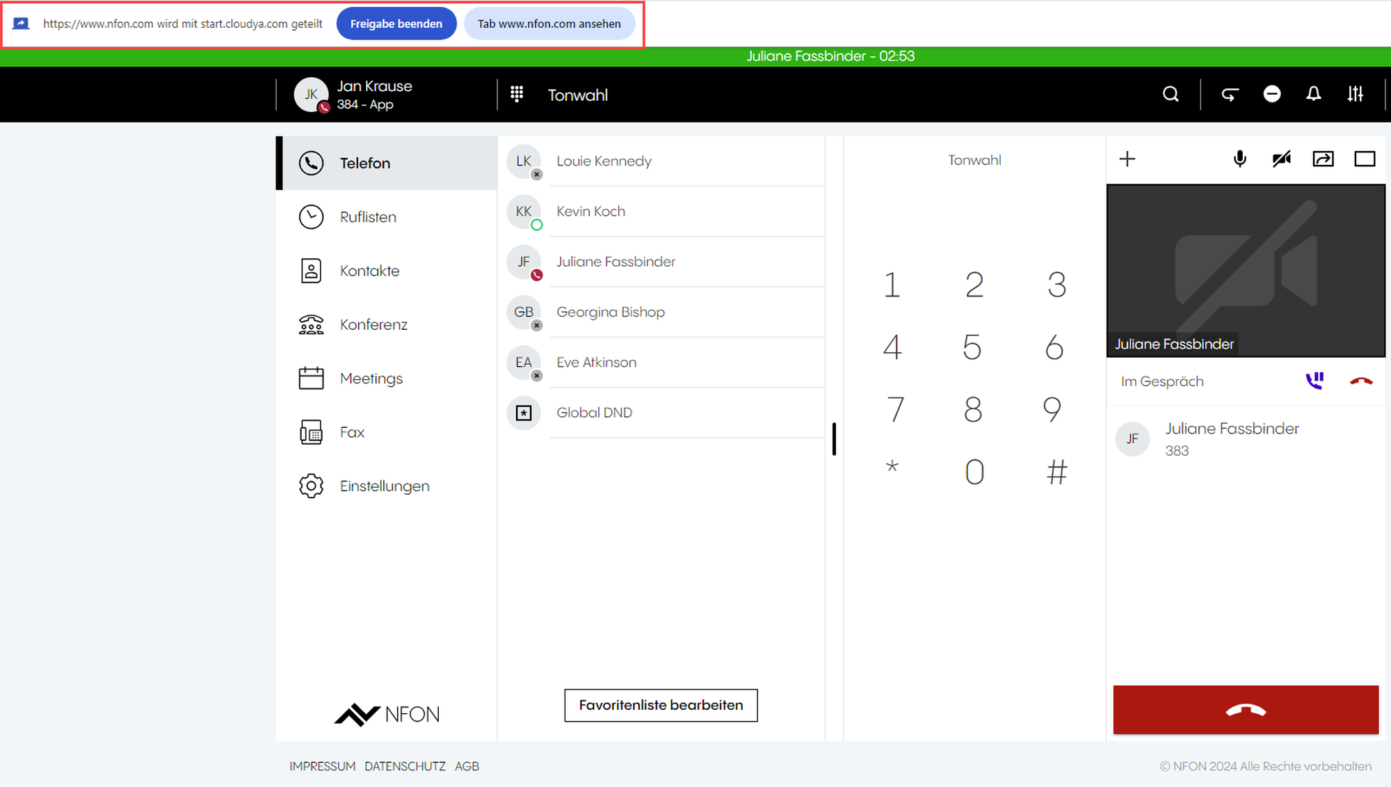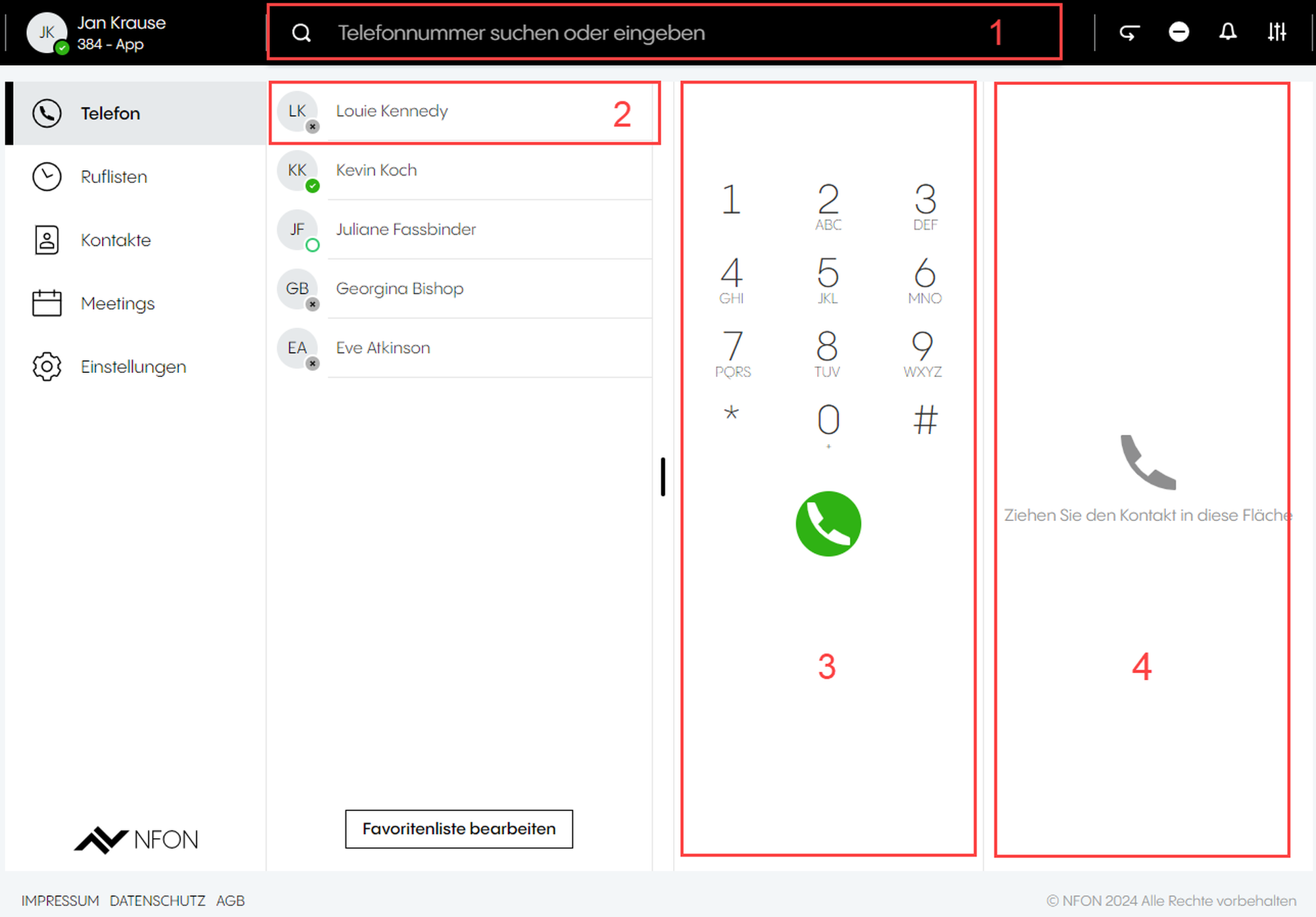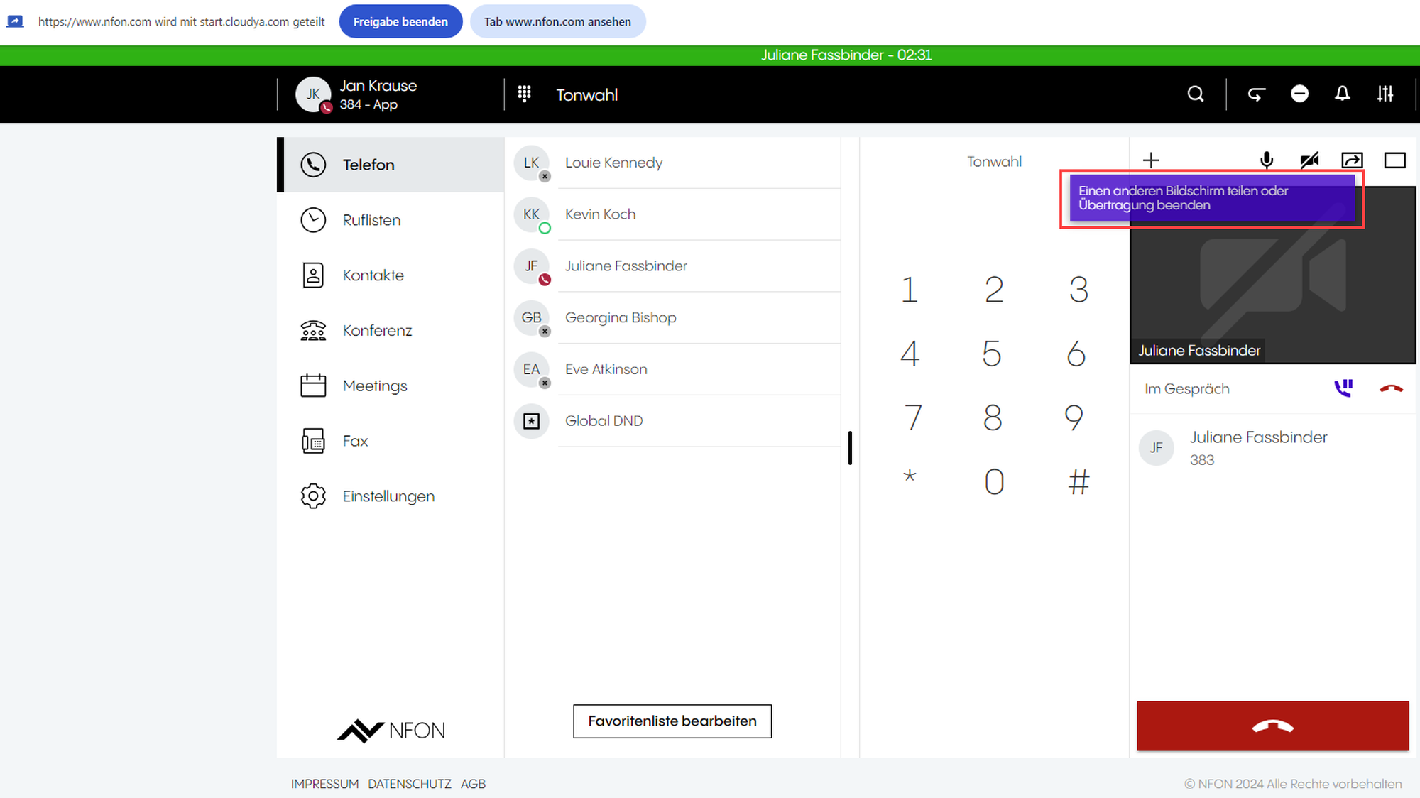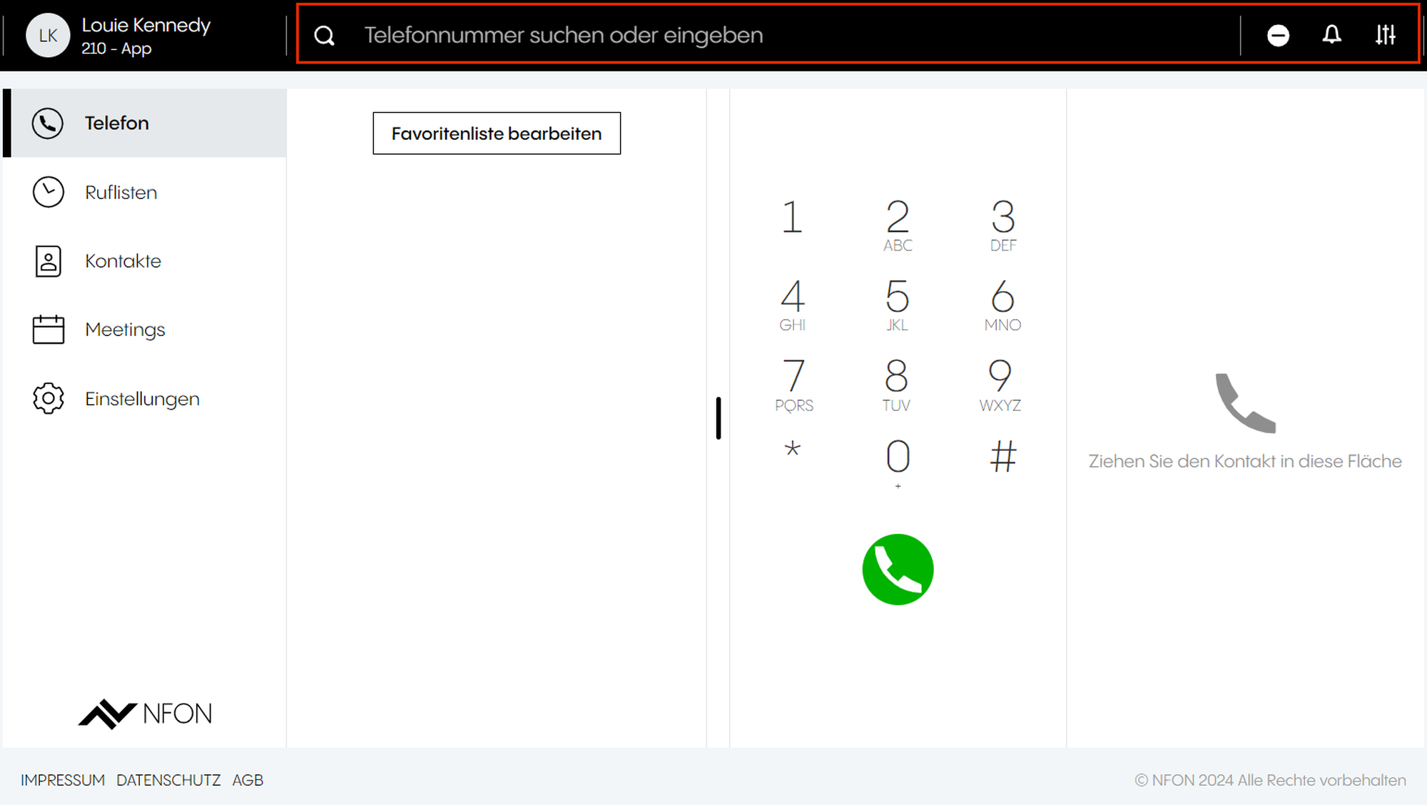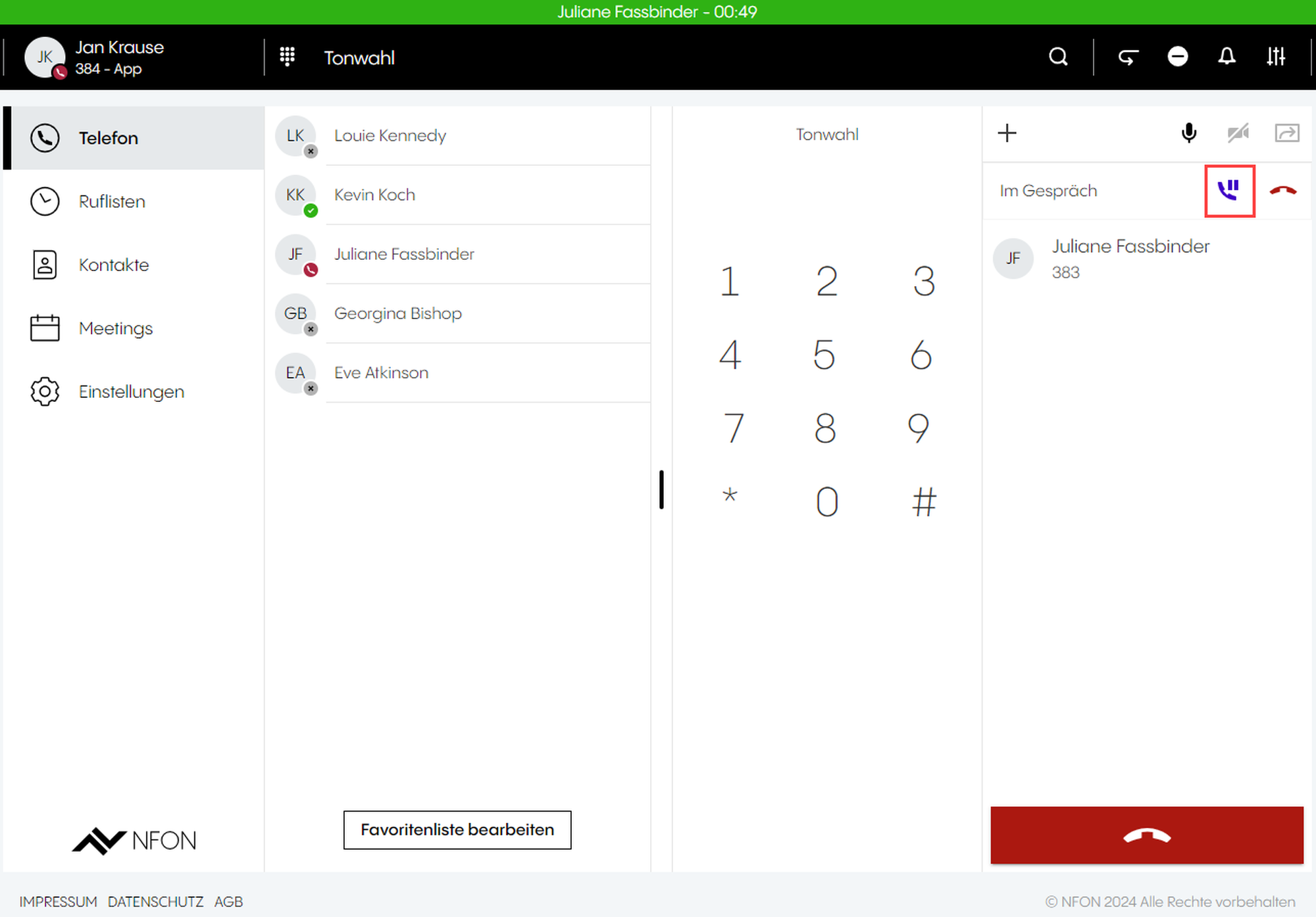 Ist das App-Menü eingeklappt, sehen Sie oben links Ihren Namen und das ausgewählte Endgerät, mit dem Sie telefonieren.