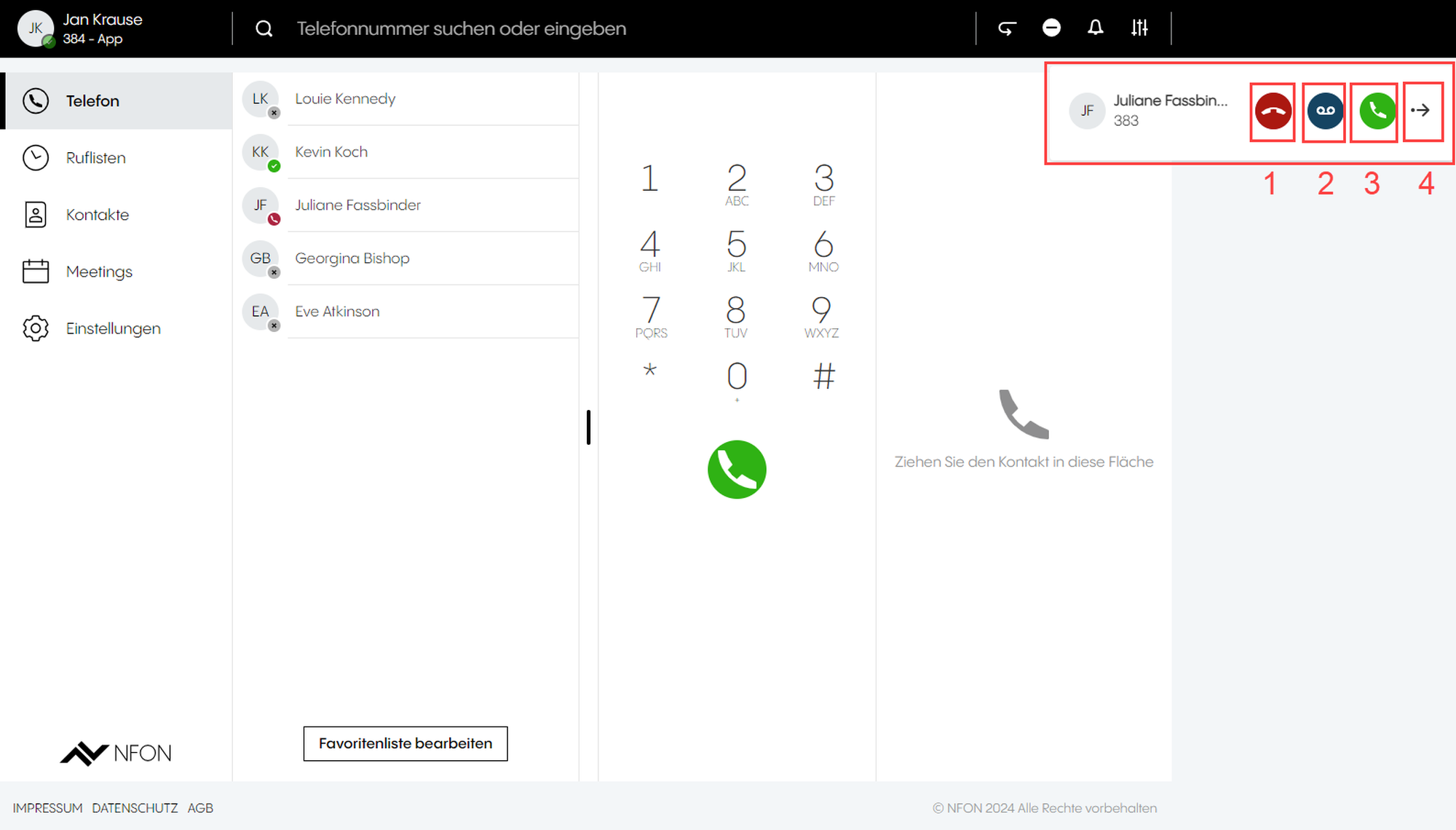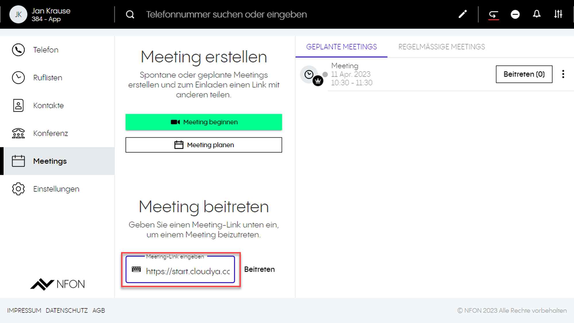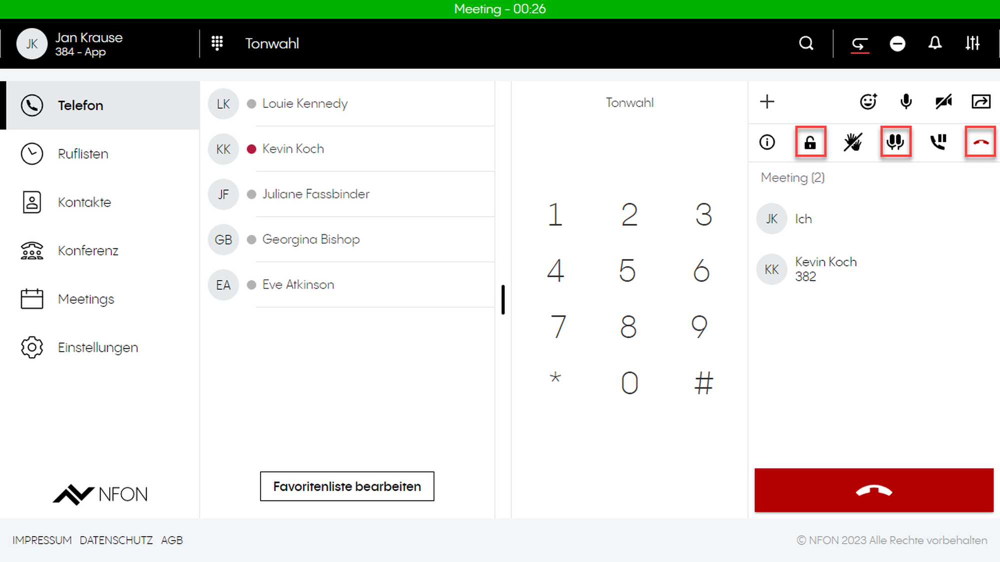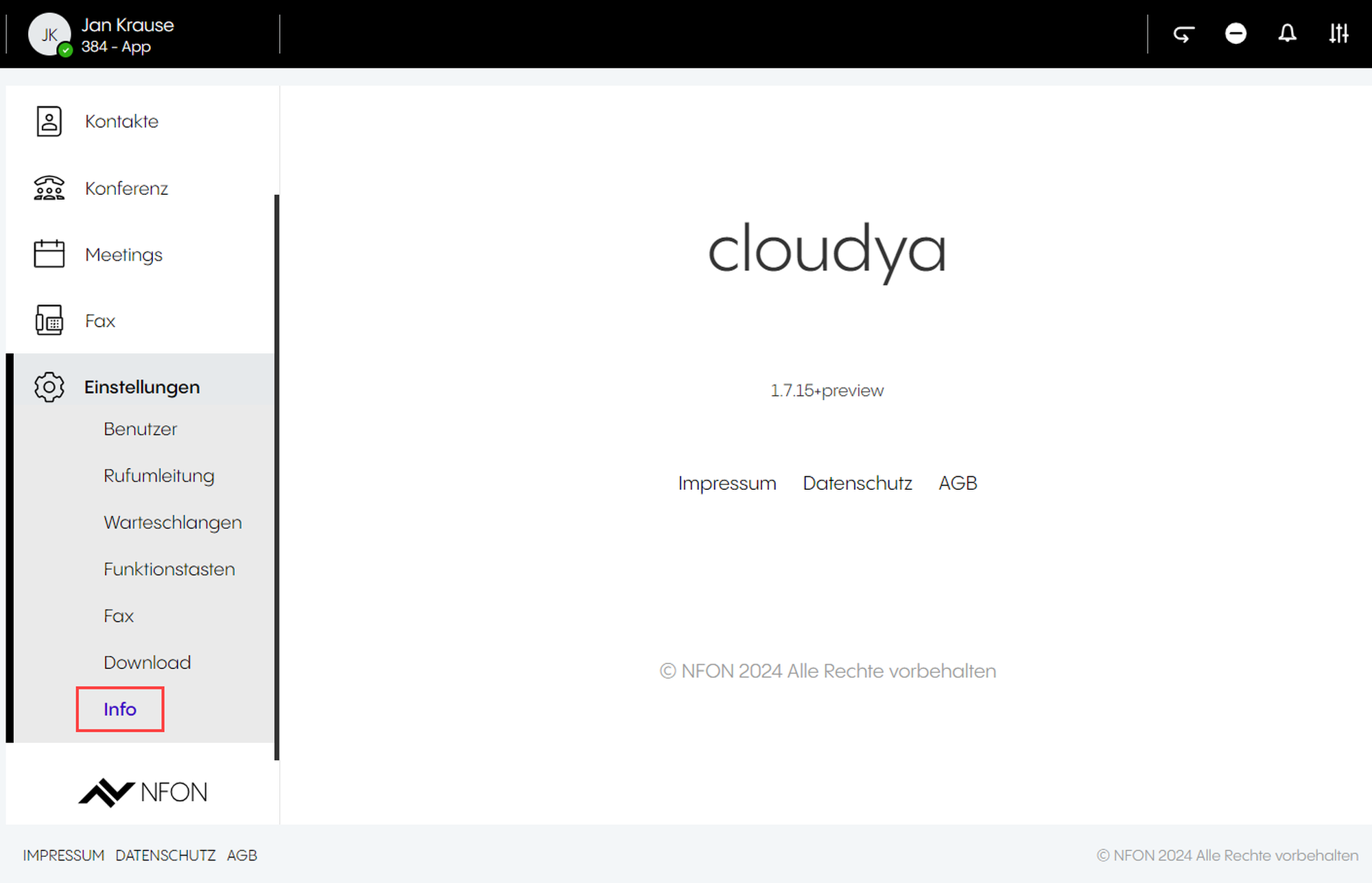 Ist das App-Menü eingeklappt, sehen Sie oben links Ihren Namen und das ausgewählte Endgerät, mit dem Sie telefonieren.
