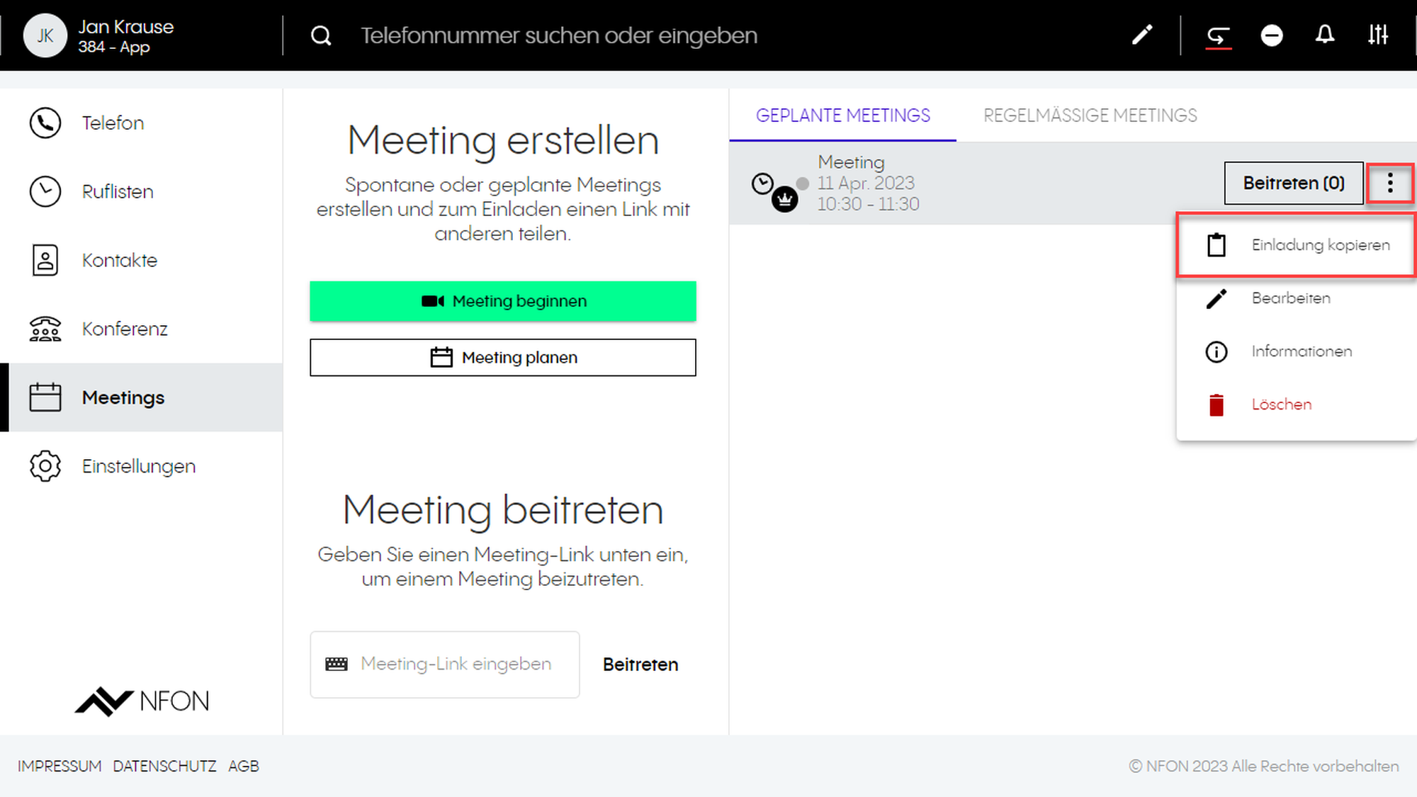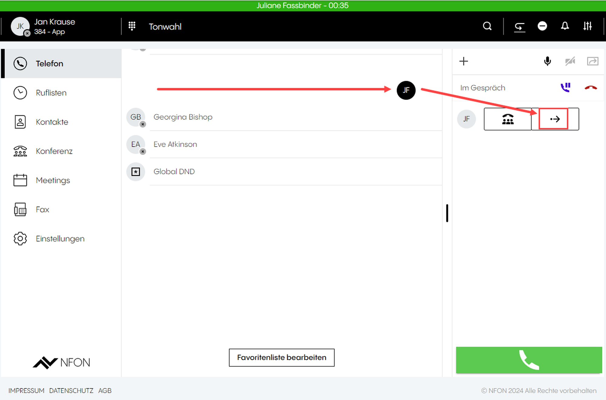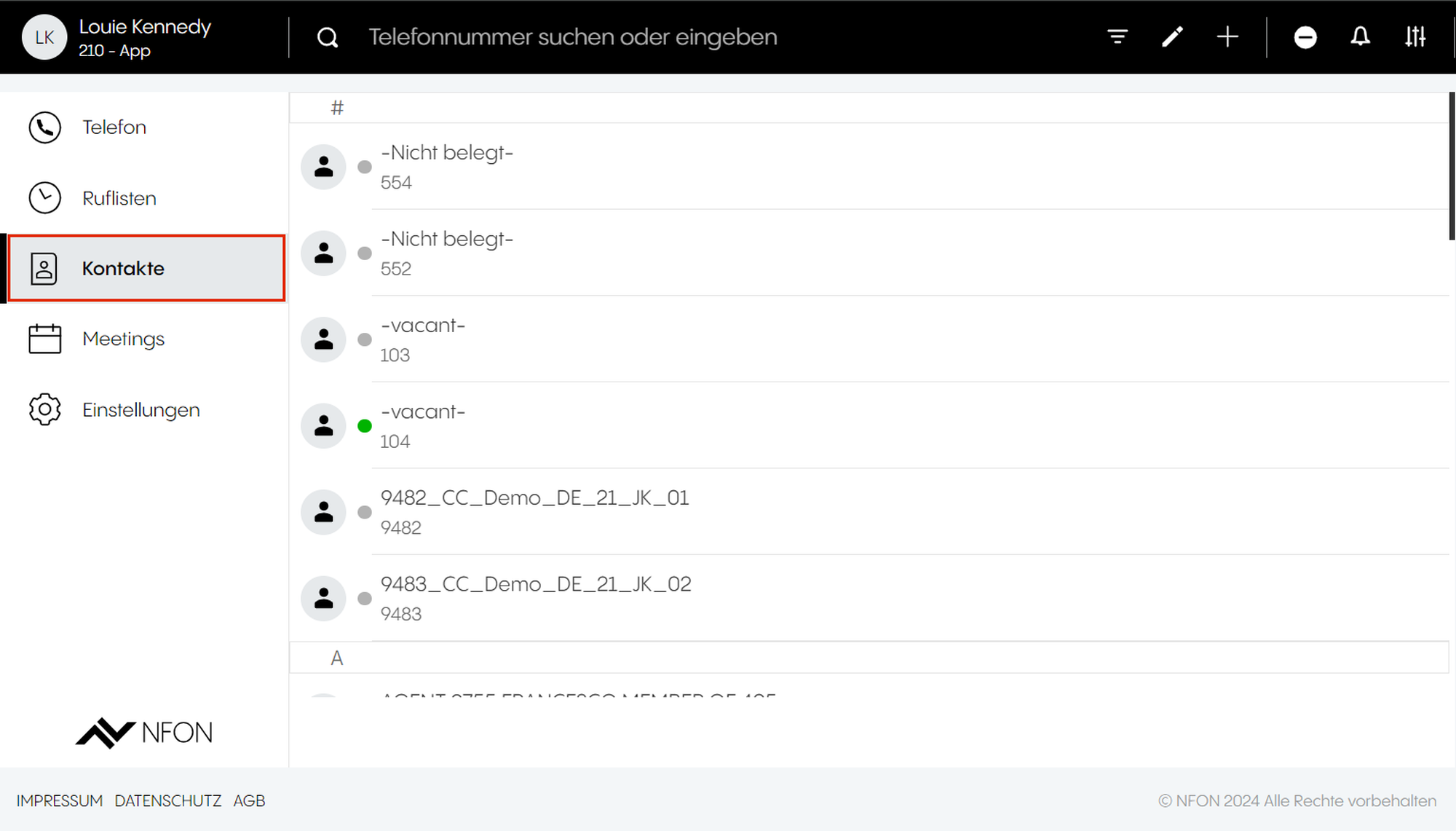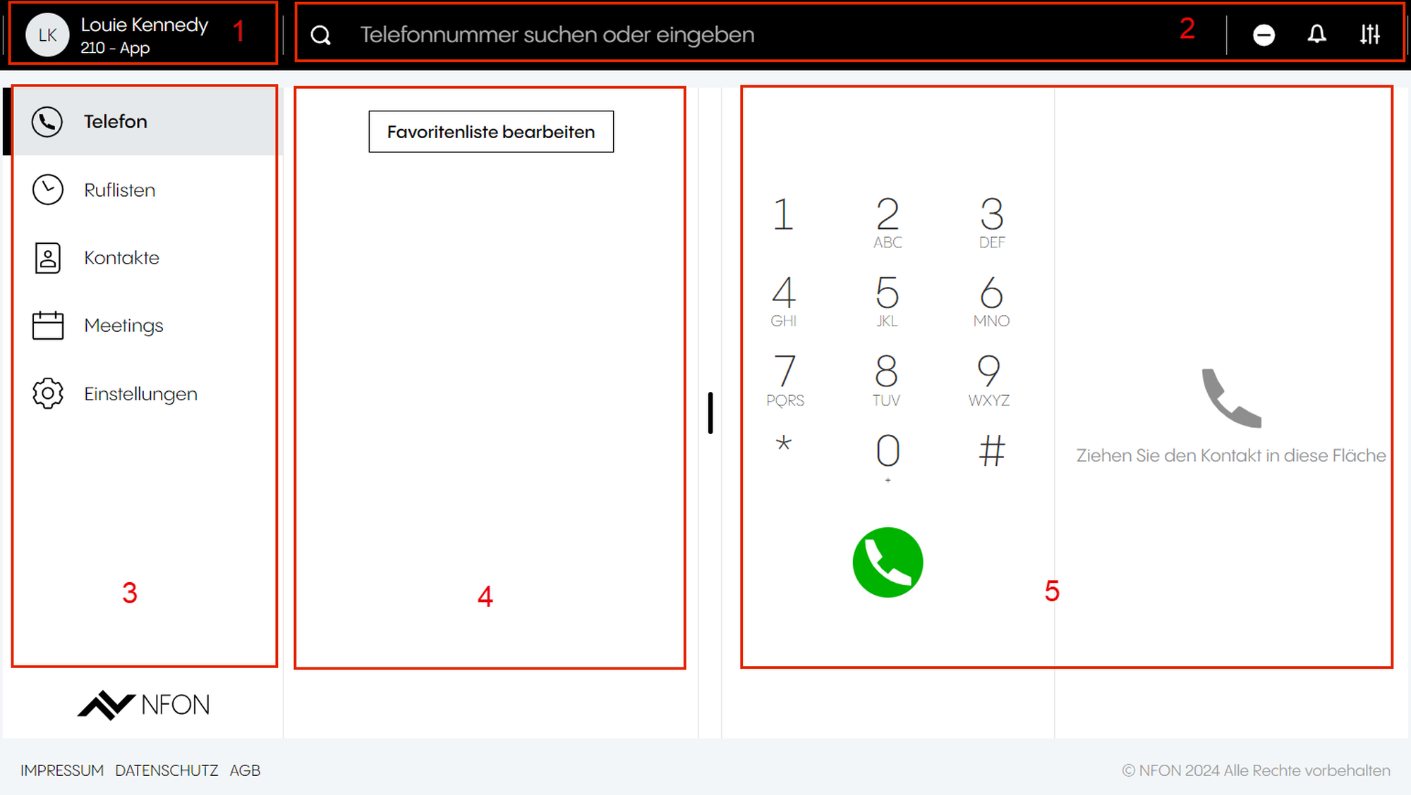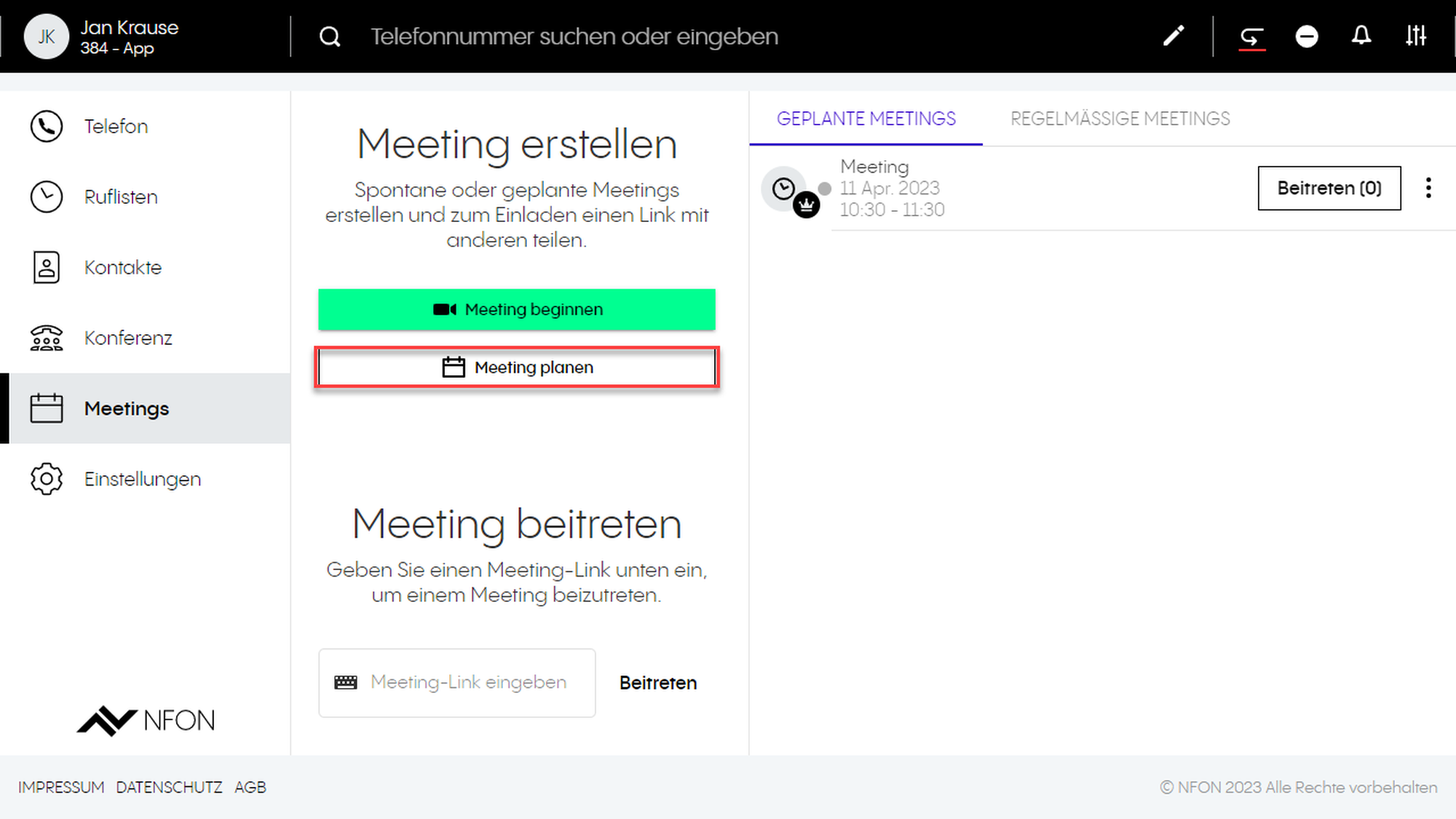 Ist das App-Menü eingeklappt, sehen Sie oben links Ihren Namen und das ausgewählte Endgerät, mit dem Sie telefonieren.