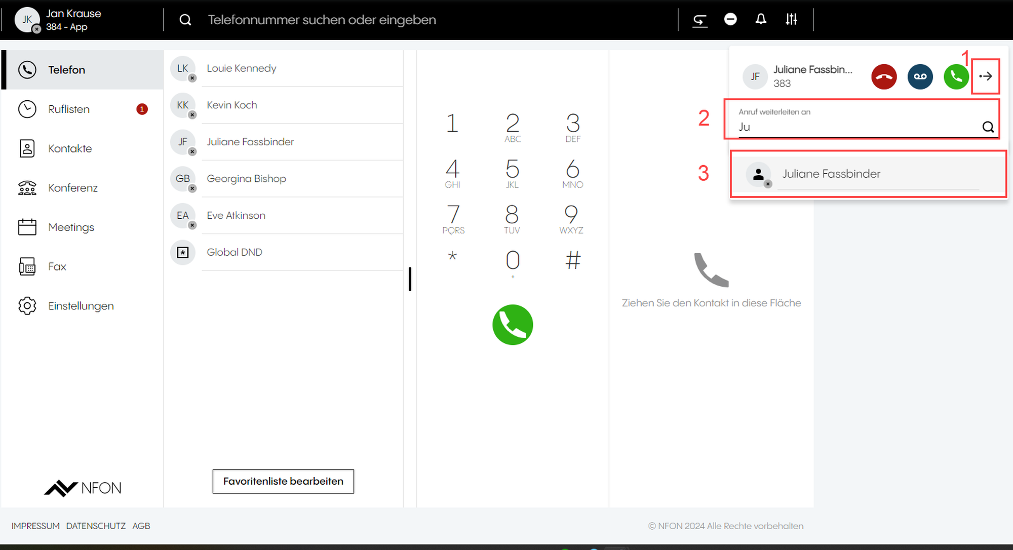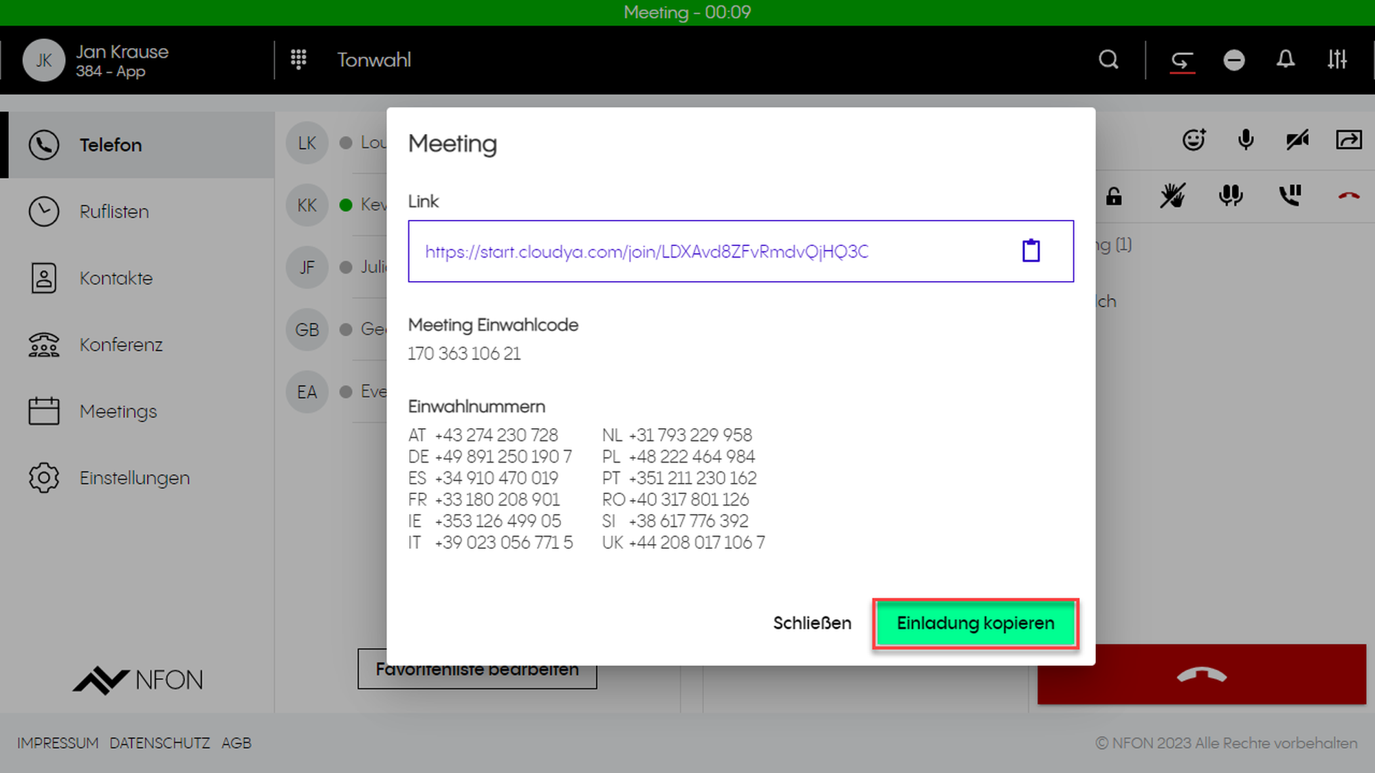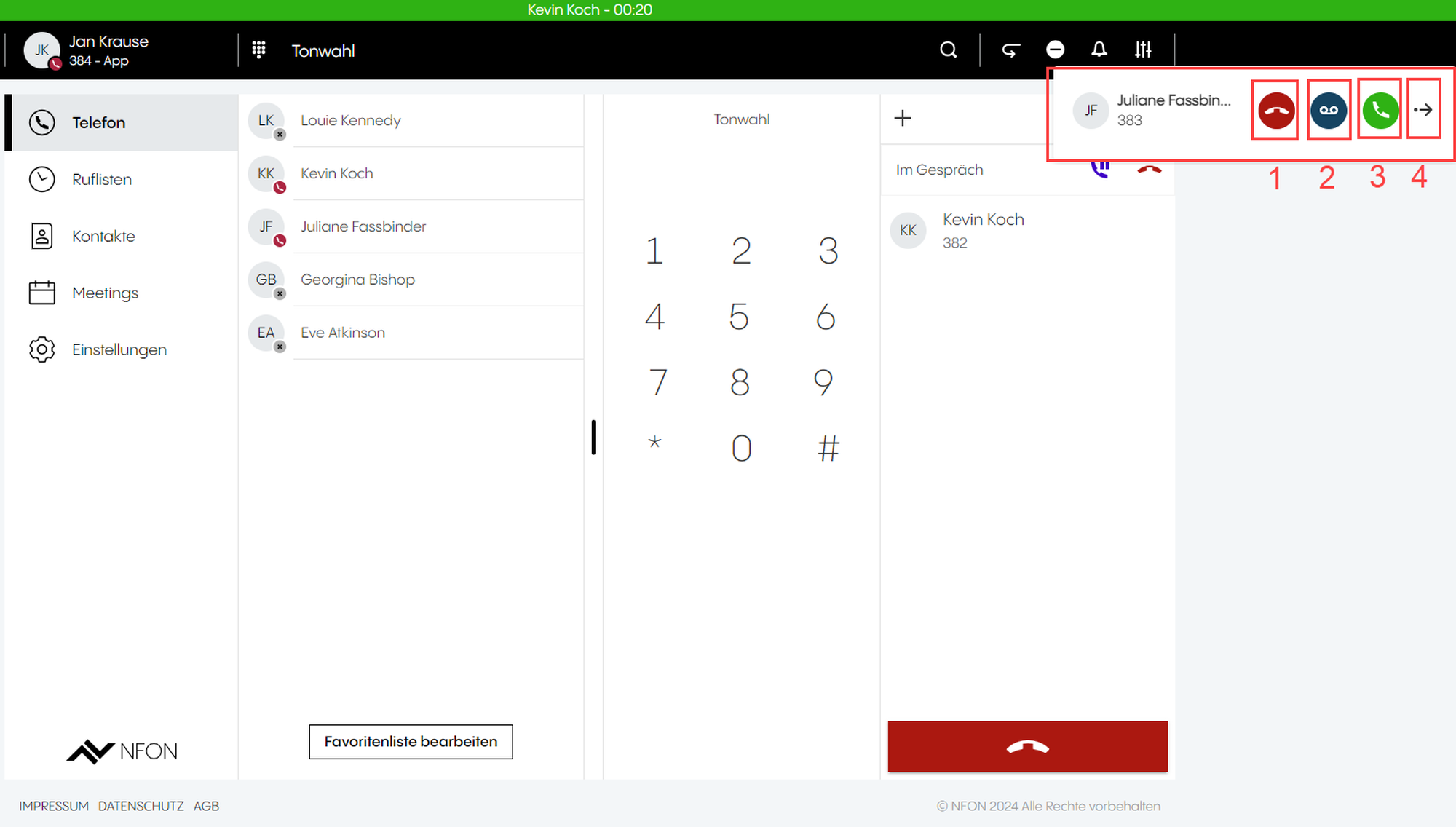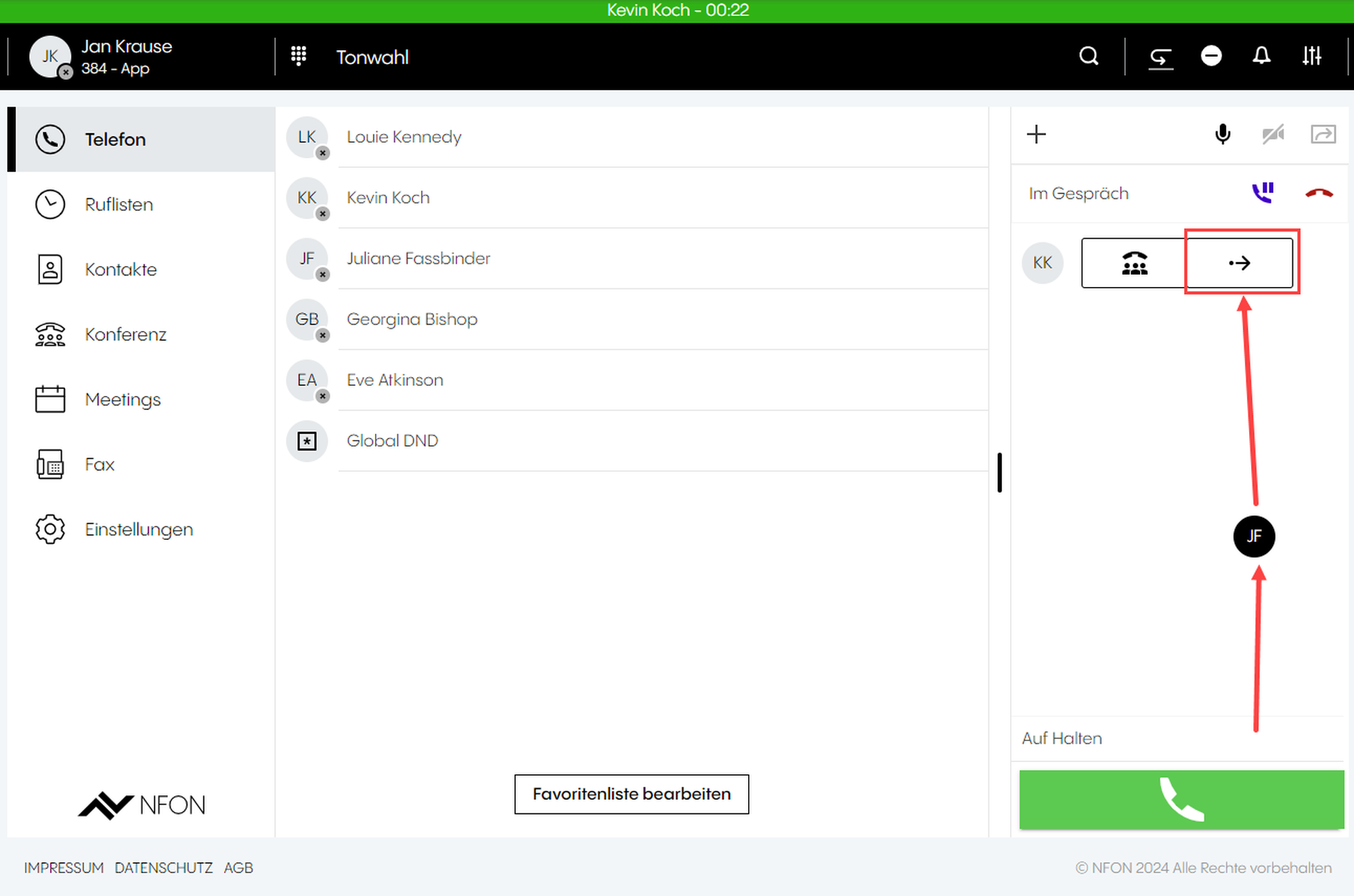Ist das App-Menü eingeklappt, sehen Sie oben links Ihren Namen und das ausgewählte Endgerät, mit dem Sie telefonieren.