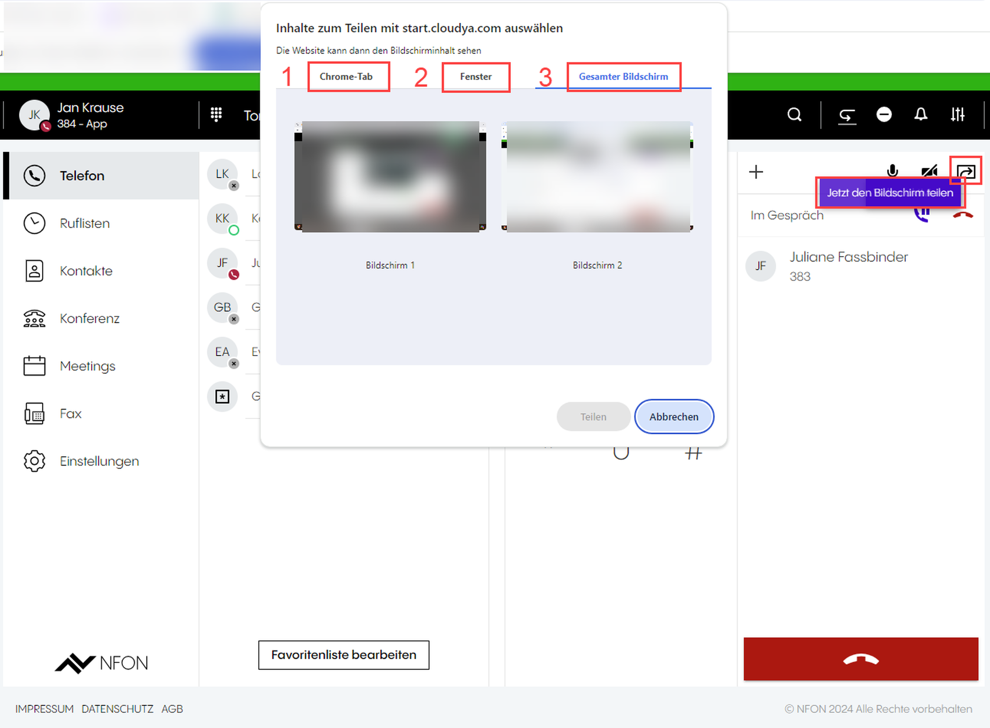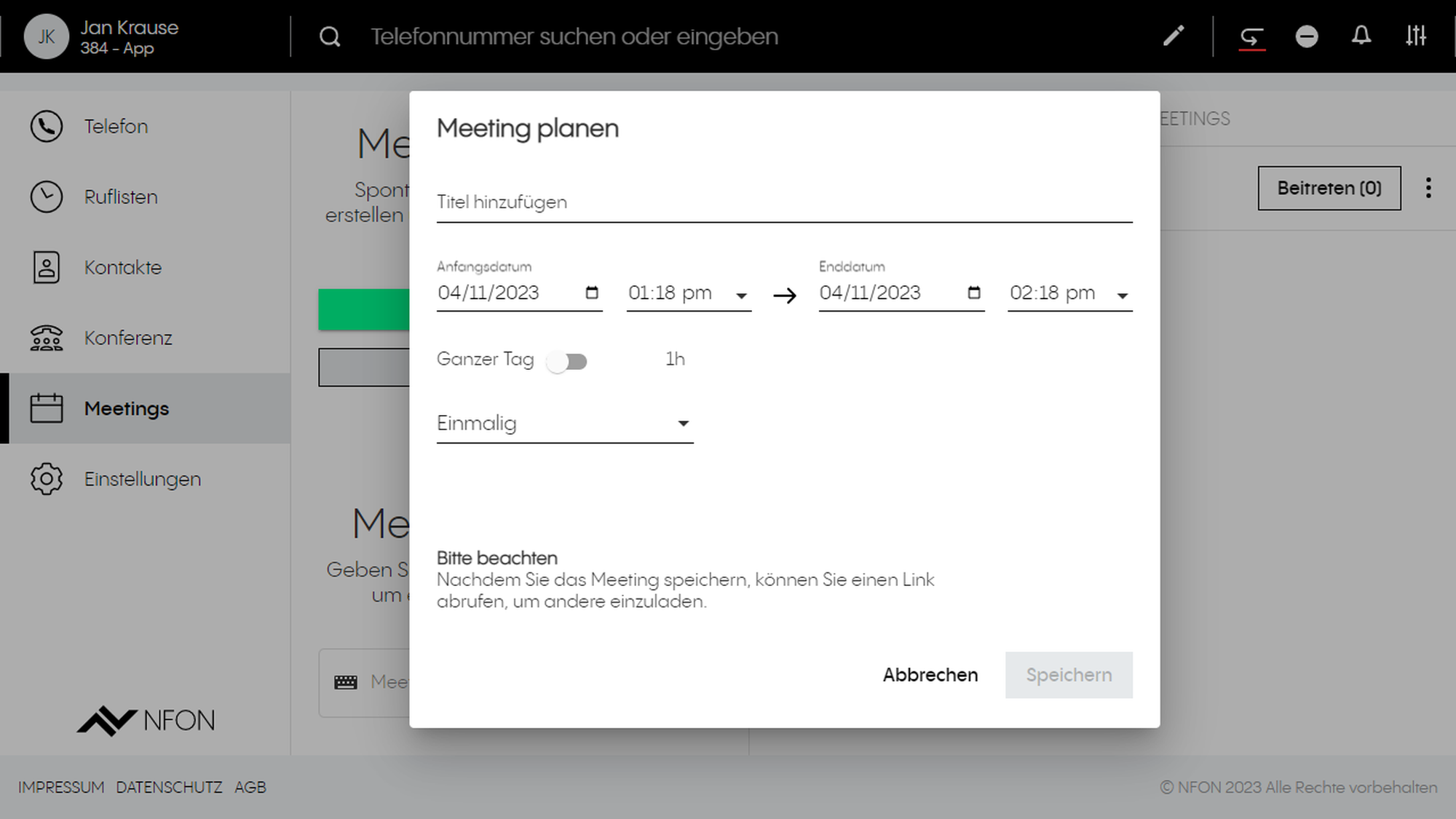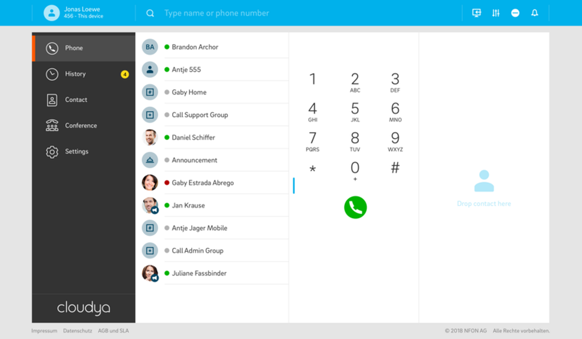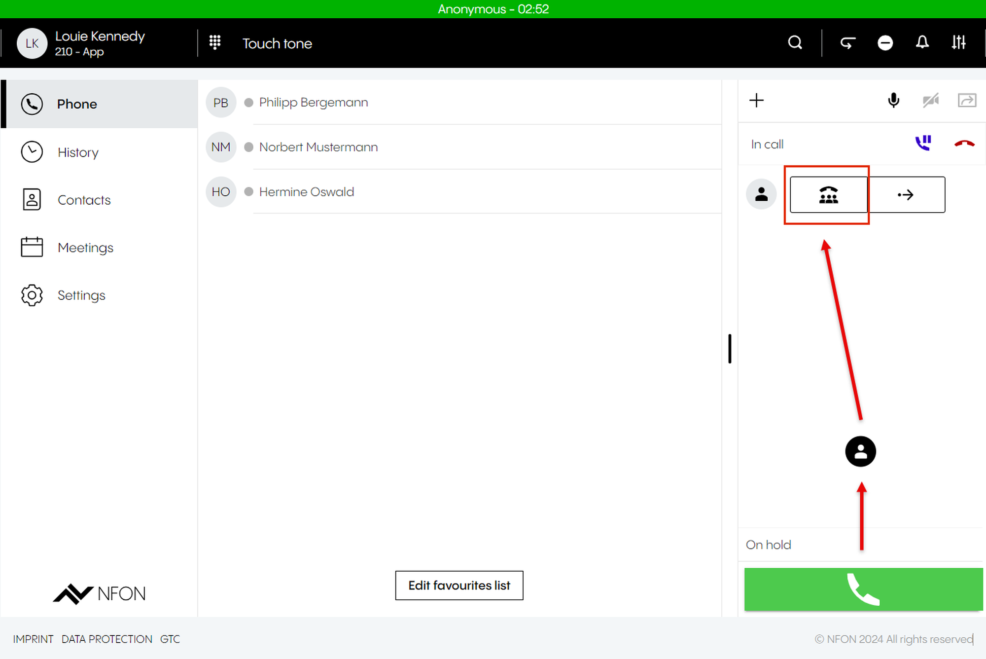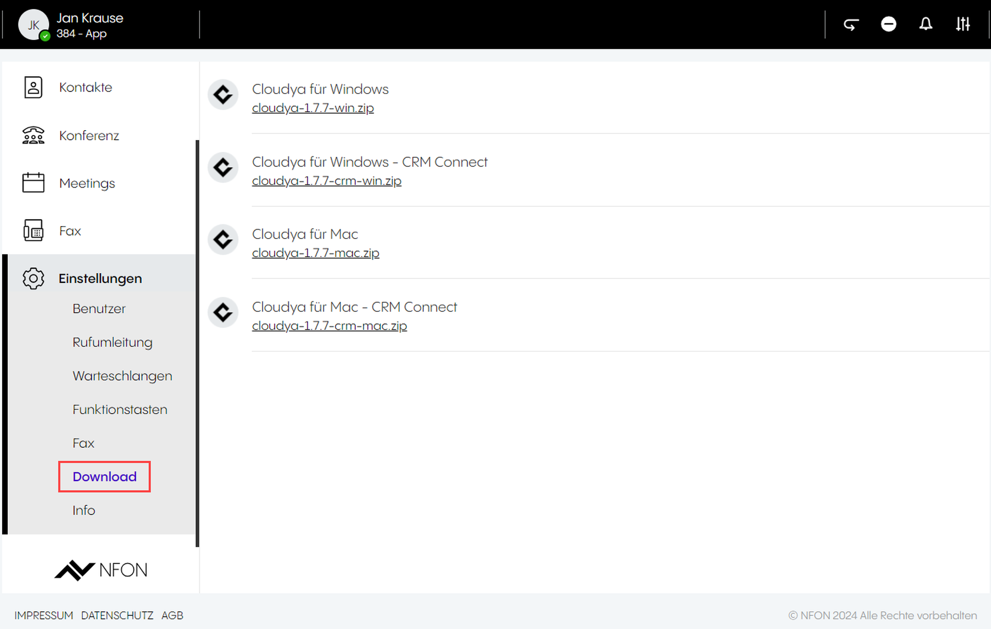 Ist das App-Menü eingeklappt, sehen Sie oben links Ihren Namen und das ausgewählte Endgerät, mit dem Sie telefonieren.