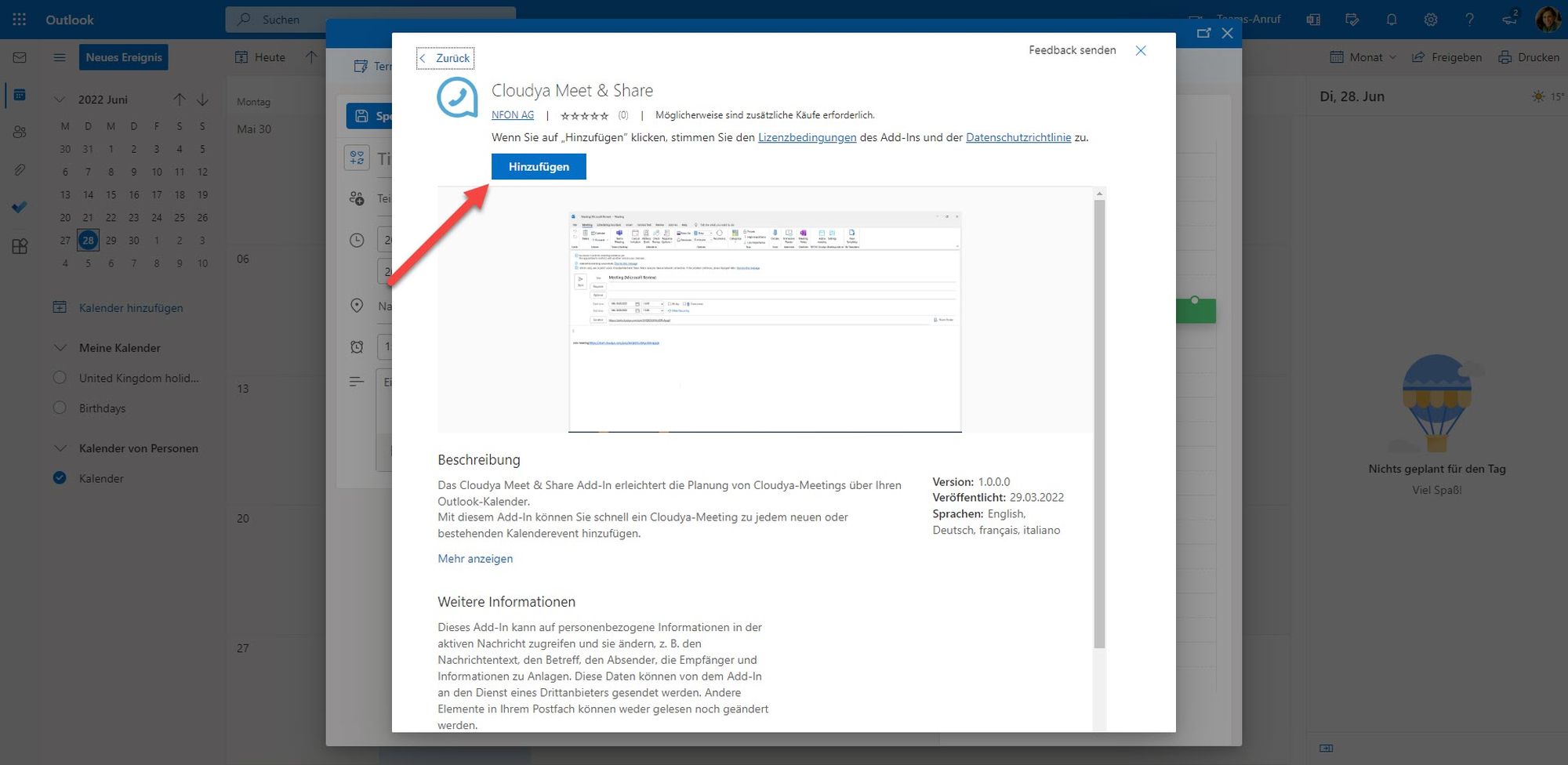5. Suchen Sie im Store nach 1&1 Business Phone Meet & Share und klicken Sie auf Hinzufügen. Um das Add-in zu installieren, müssen Sie den Lizensbedingungen und den Datenschutzrichtlinien zustimmen, indem Sie auf Weiter klicken.