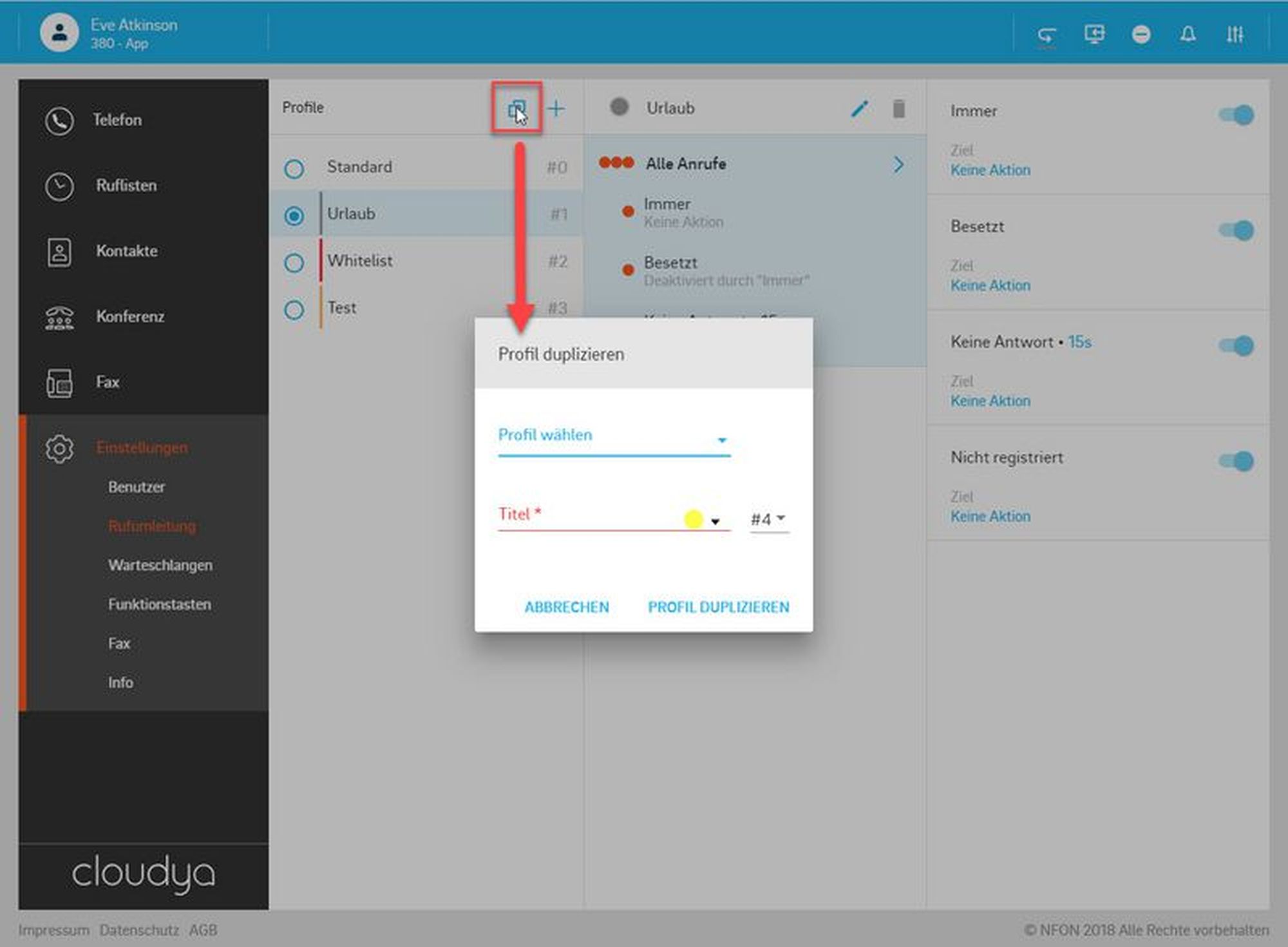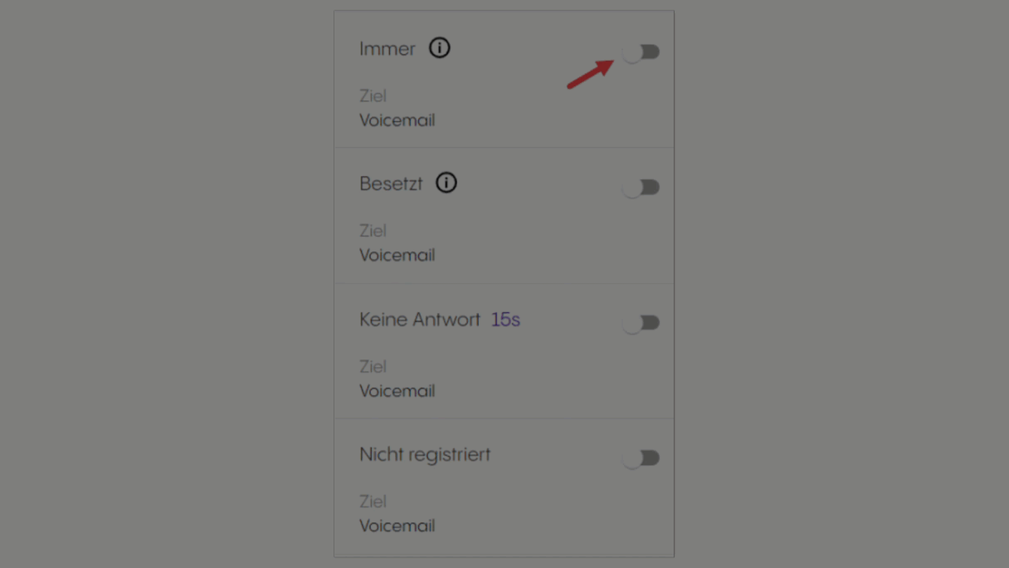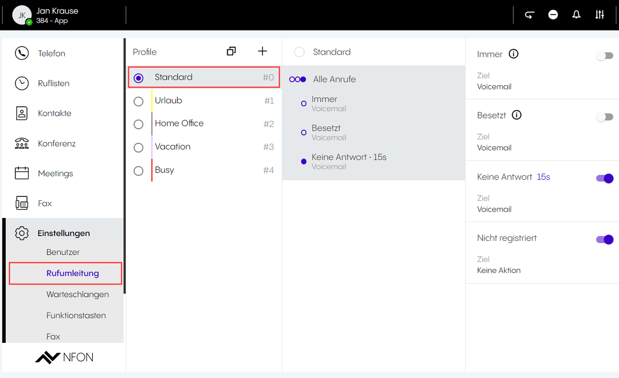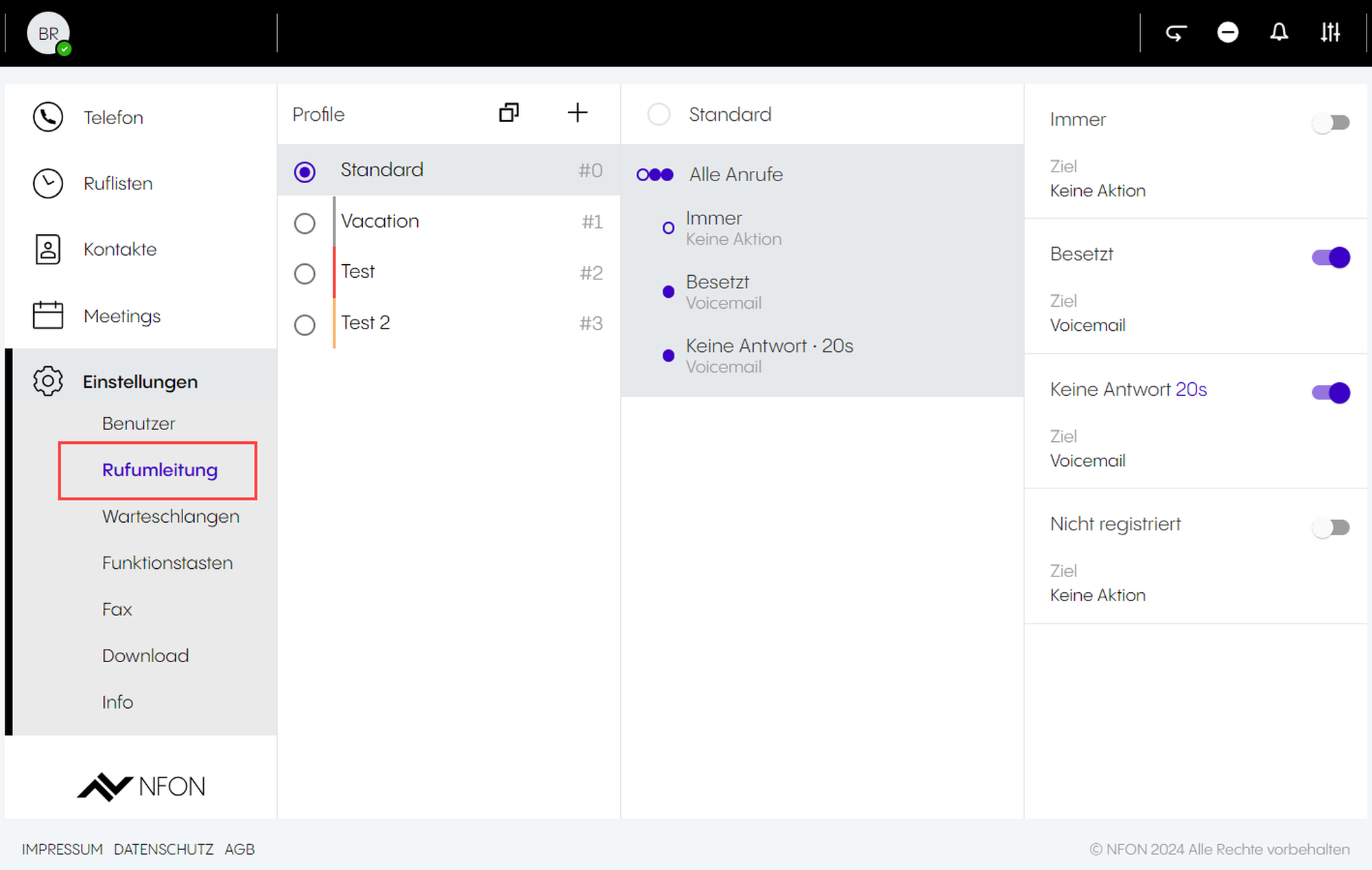 | Rufumleitung: Wählen Sie das Rufumleitungsprofil, das Sie aktivieren möchten. | |