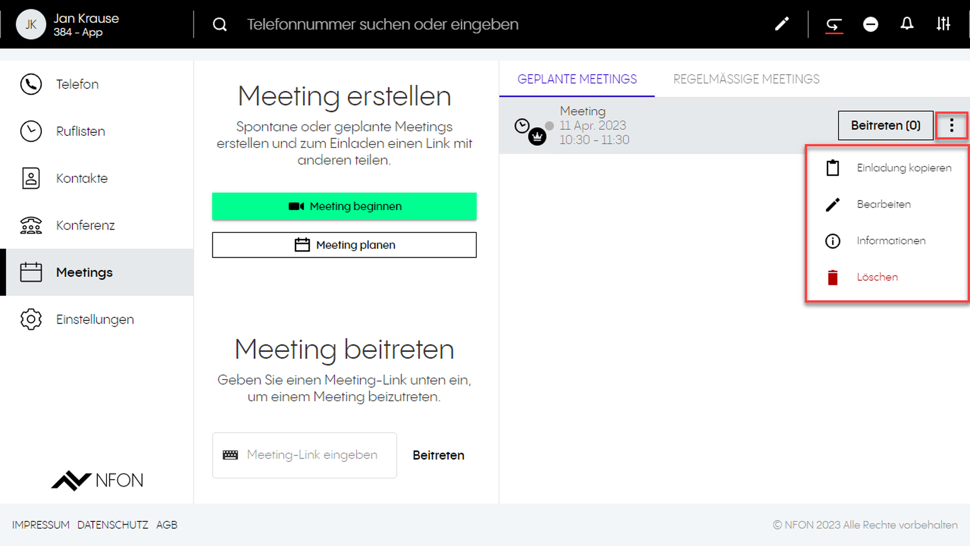 Klicken Sie per Rechtsklick auf die Rufnummer.