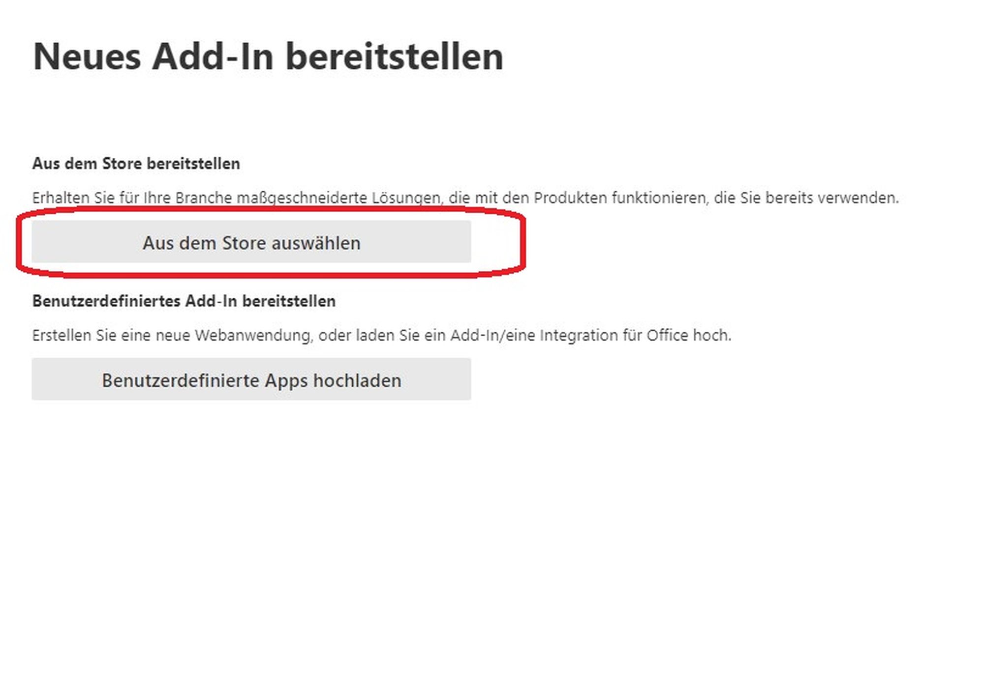 4. Im Fenster Neus Add-in bereitstellen auf Weiter und anschließend auf Aus dem Store auswählen klicken_._