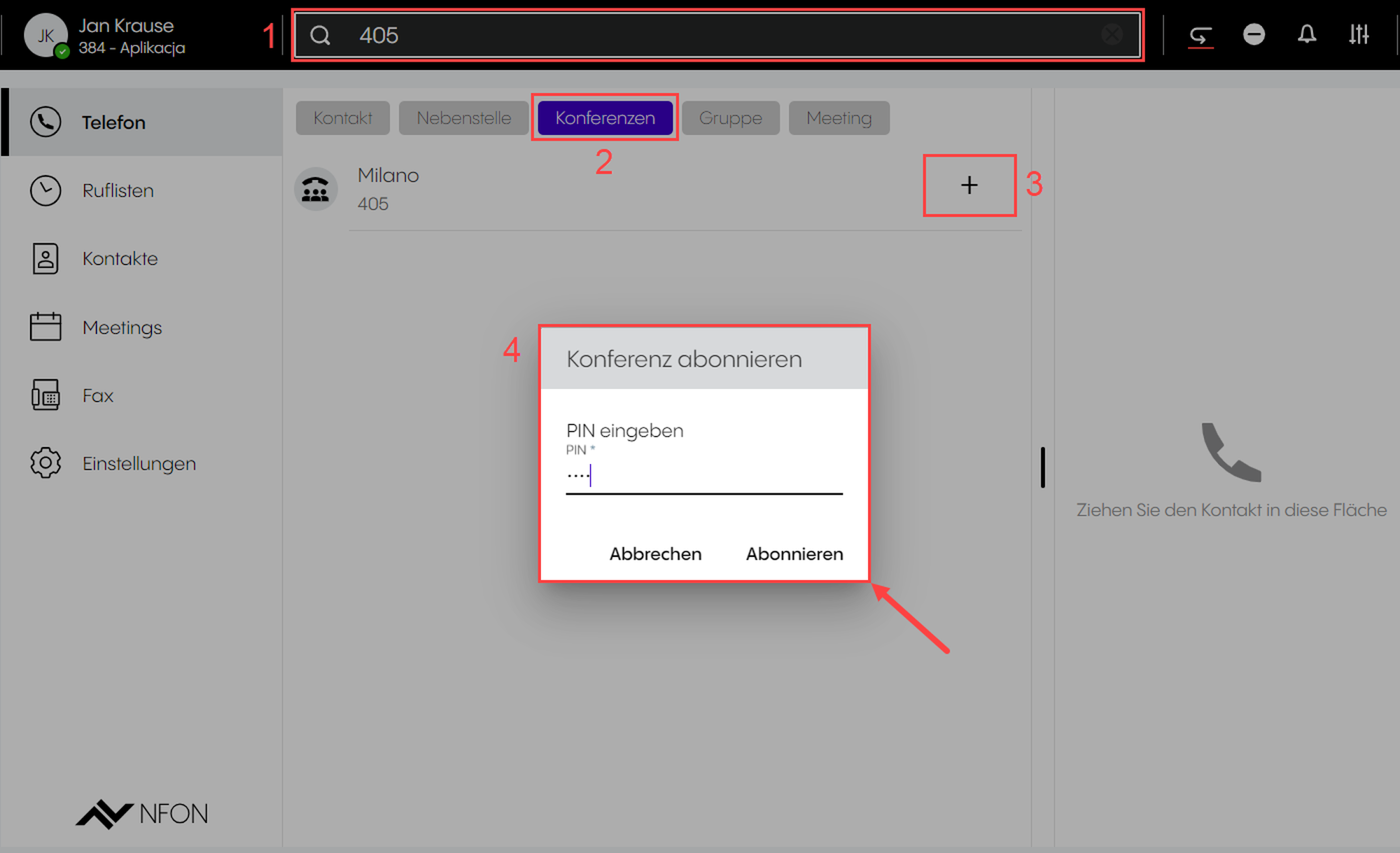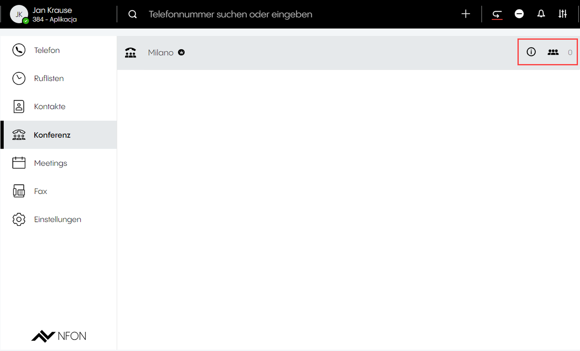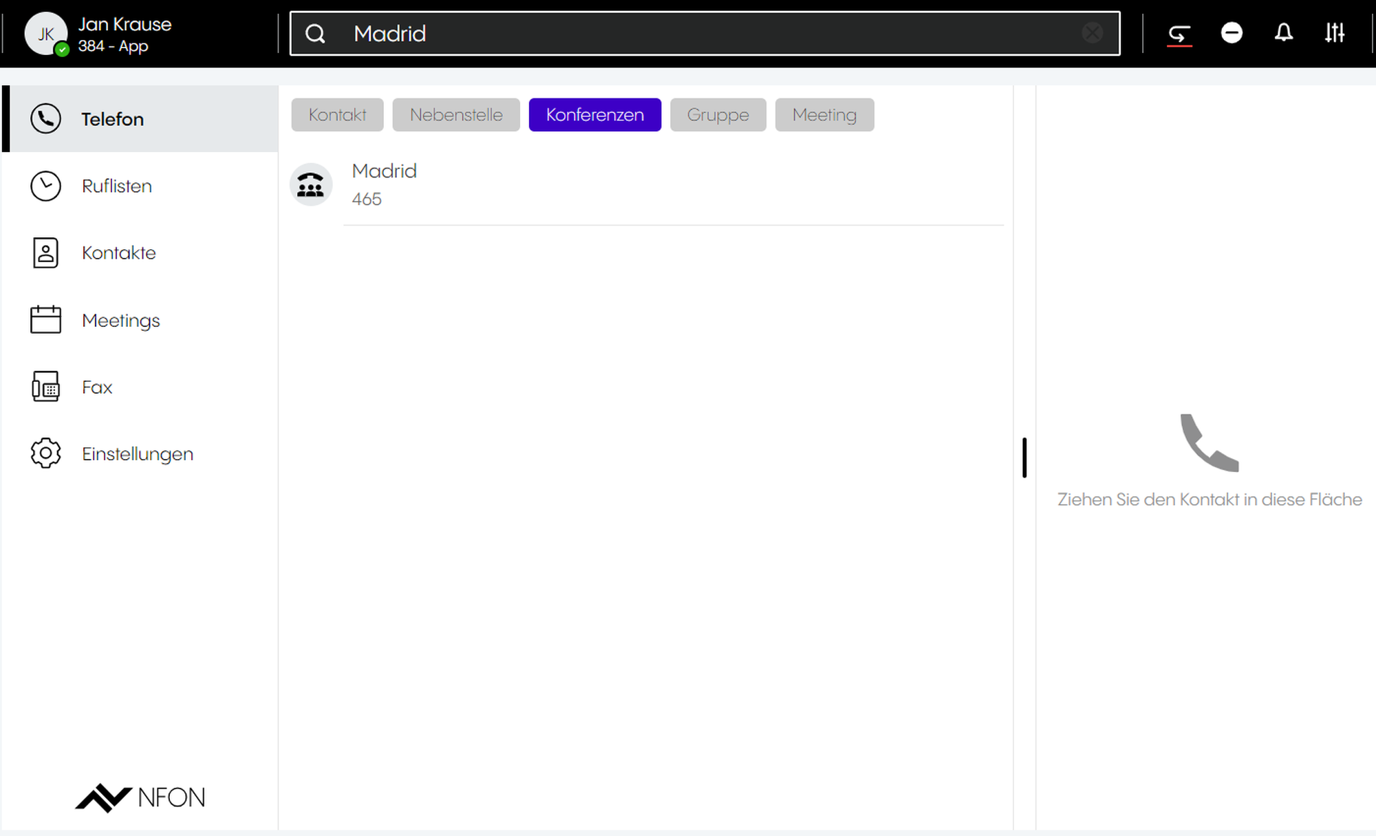 Über die Suchleiste können Sie Kontakte, Nebenstellen, Konferenzen, Meetings und Gruppen durchsuchen. Die Suchergebnisse werden nach diesen Kategorien geclustered dargestellt.