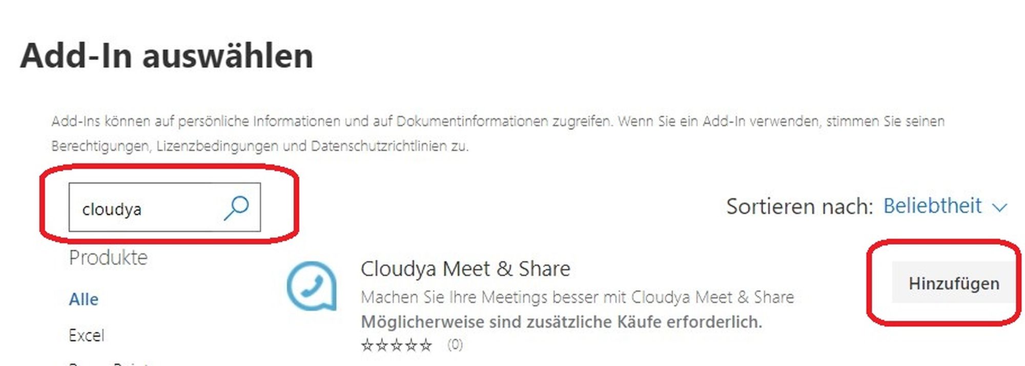 2. Suchen Sie nach 1&1 Business Phone. Wählen Sie das Add-in 1&1 Business PhoneMeet & Share.