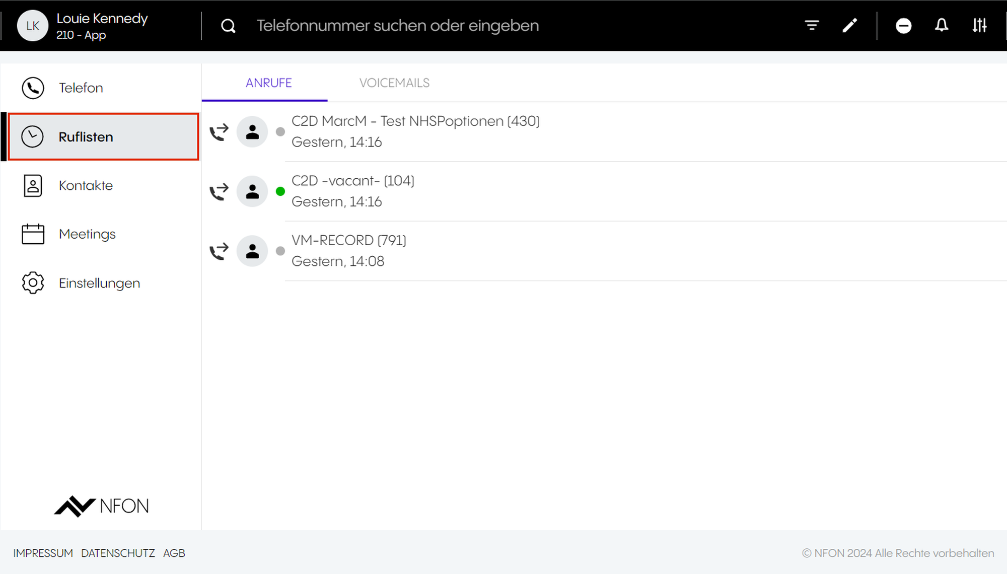 In diesem Bereich können Sie aktuelle Ereignisse einsehen, d. h. eingehende, ausgehende und verpasste Anrufe, sowie Konferenzen und Meetings, an denen Sie teilgenommen haben. Zudem haben Sie hier Zugirff auf Ihre Voicemails.