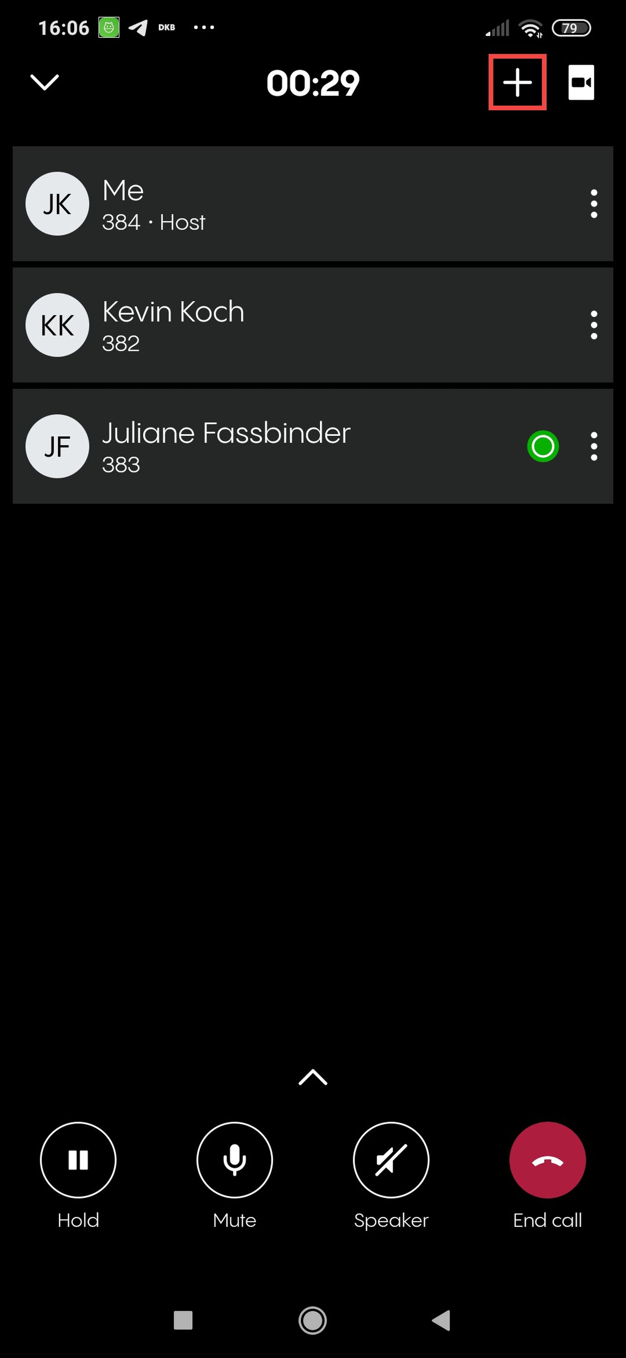 1. Once you have started a conference, you can use the + button in the upper right-hand corner to add new participants.