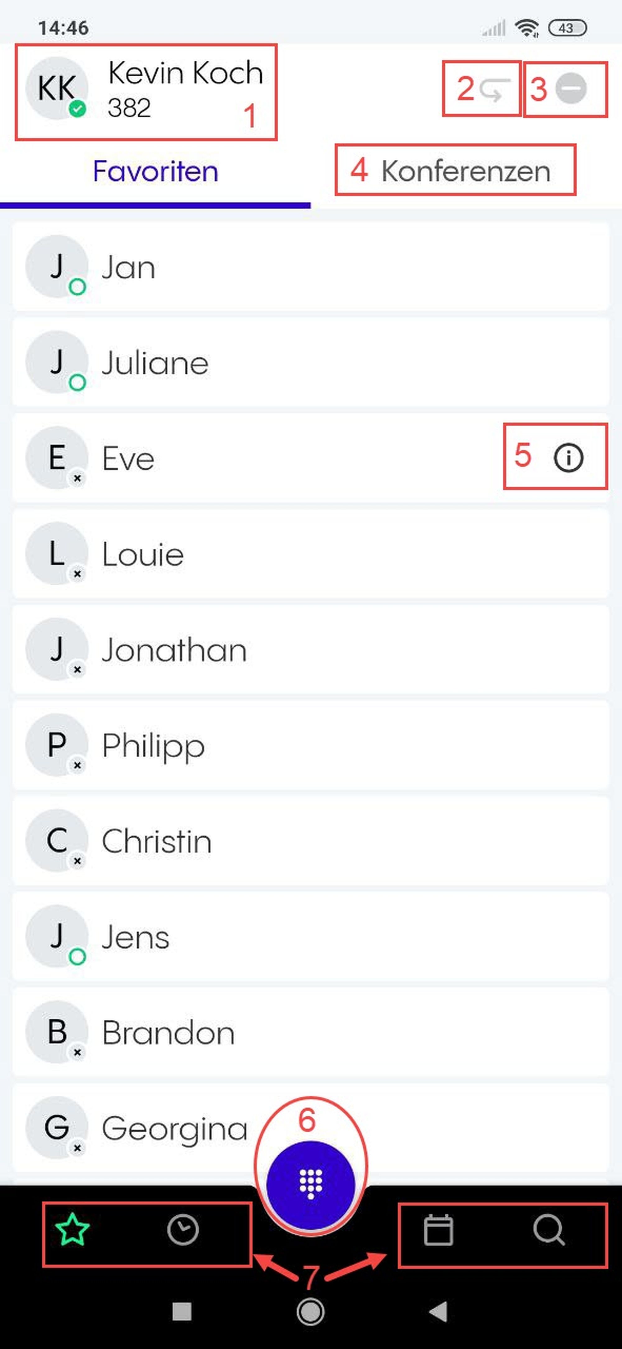 Wenn Sie sich angemeldet haben, ist die erste Ansicht die "Favoriten", die den Funktionstasten Ihrer Nebenstelle entsprechen.