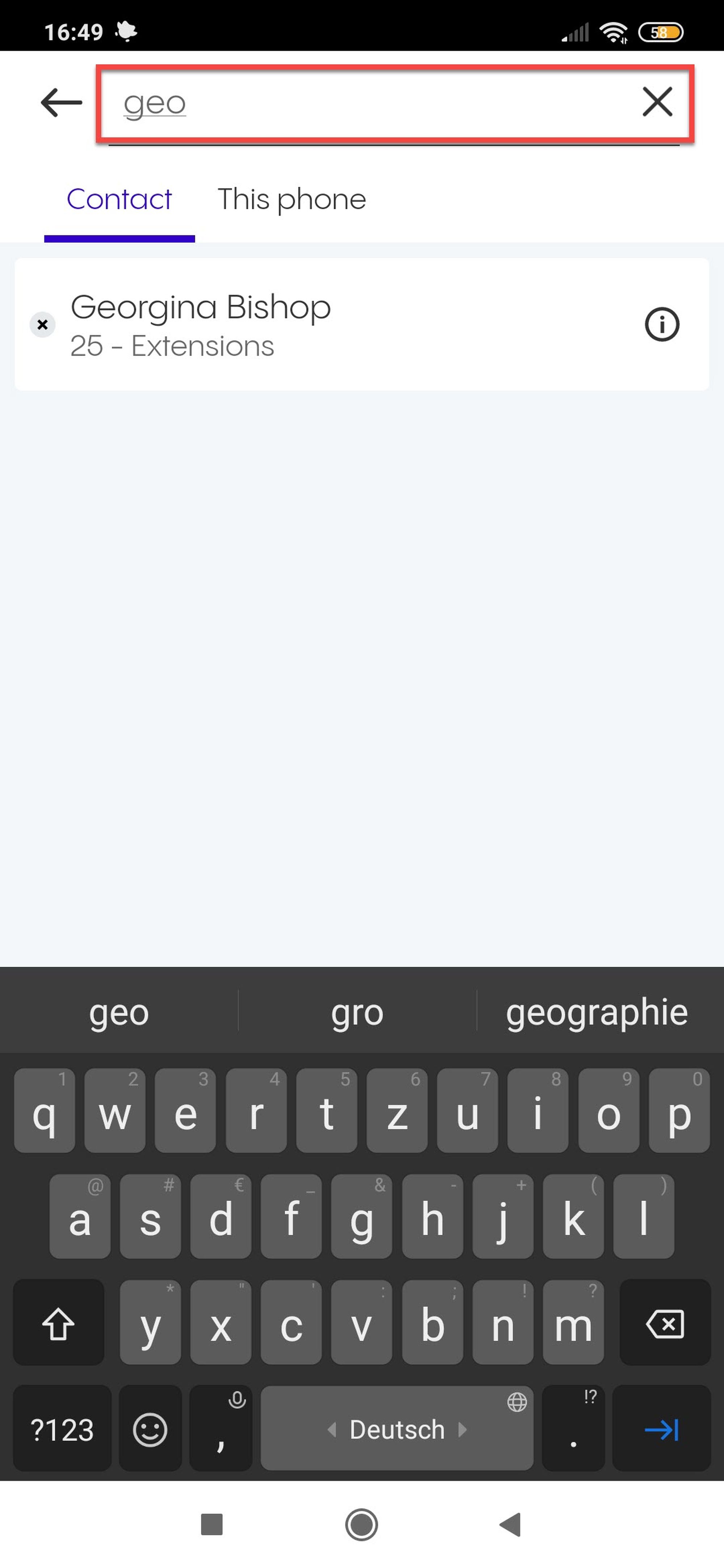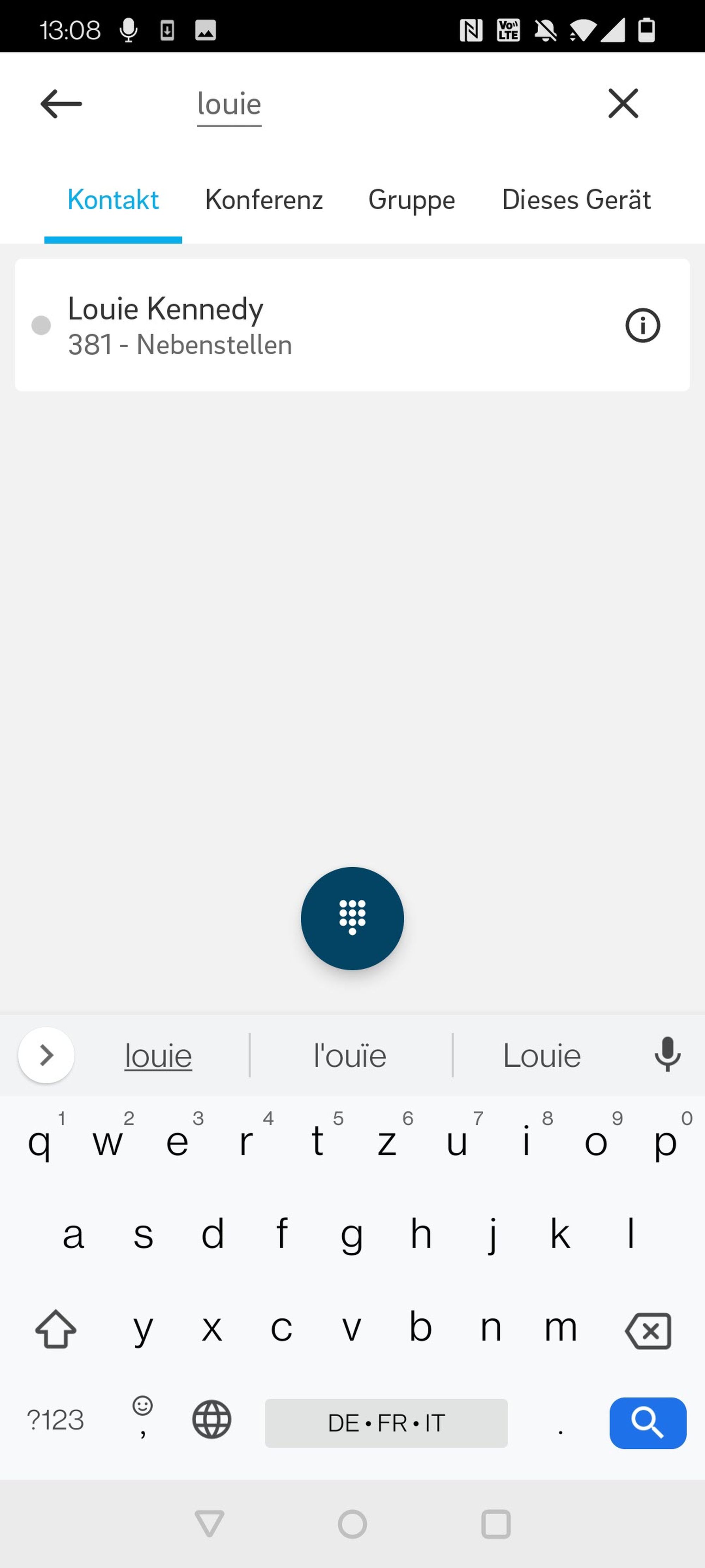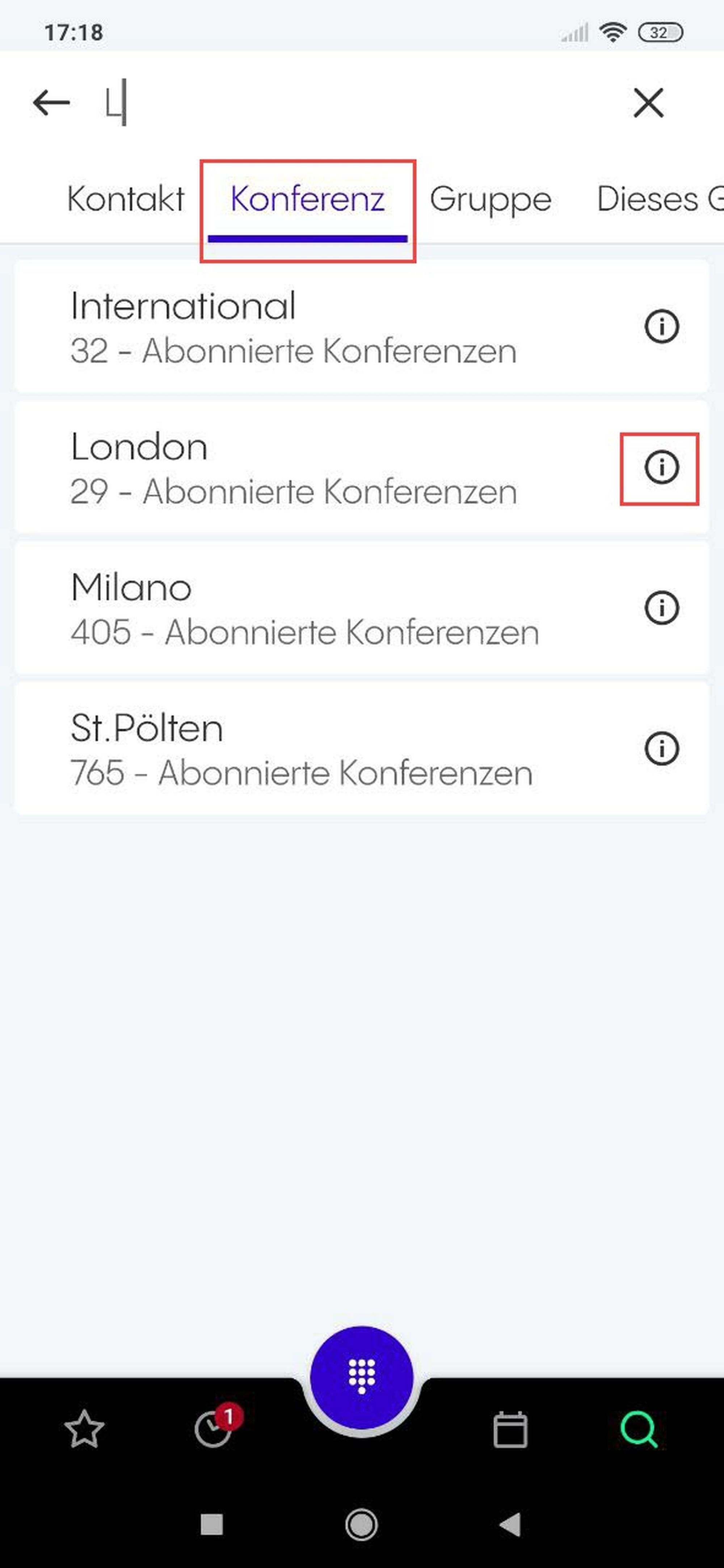 Nach Kontakten, Konferenzen und Gruppen aus Ihrer Telefonanlage suchen. Bitte beachten Sie, dass nur die Kontakte, Konferenzen und Gruppen Ihrer Telefonanlage bei einer Standardsuche berücksichtigt werden.