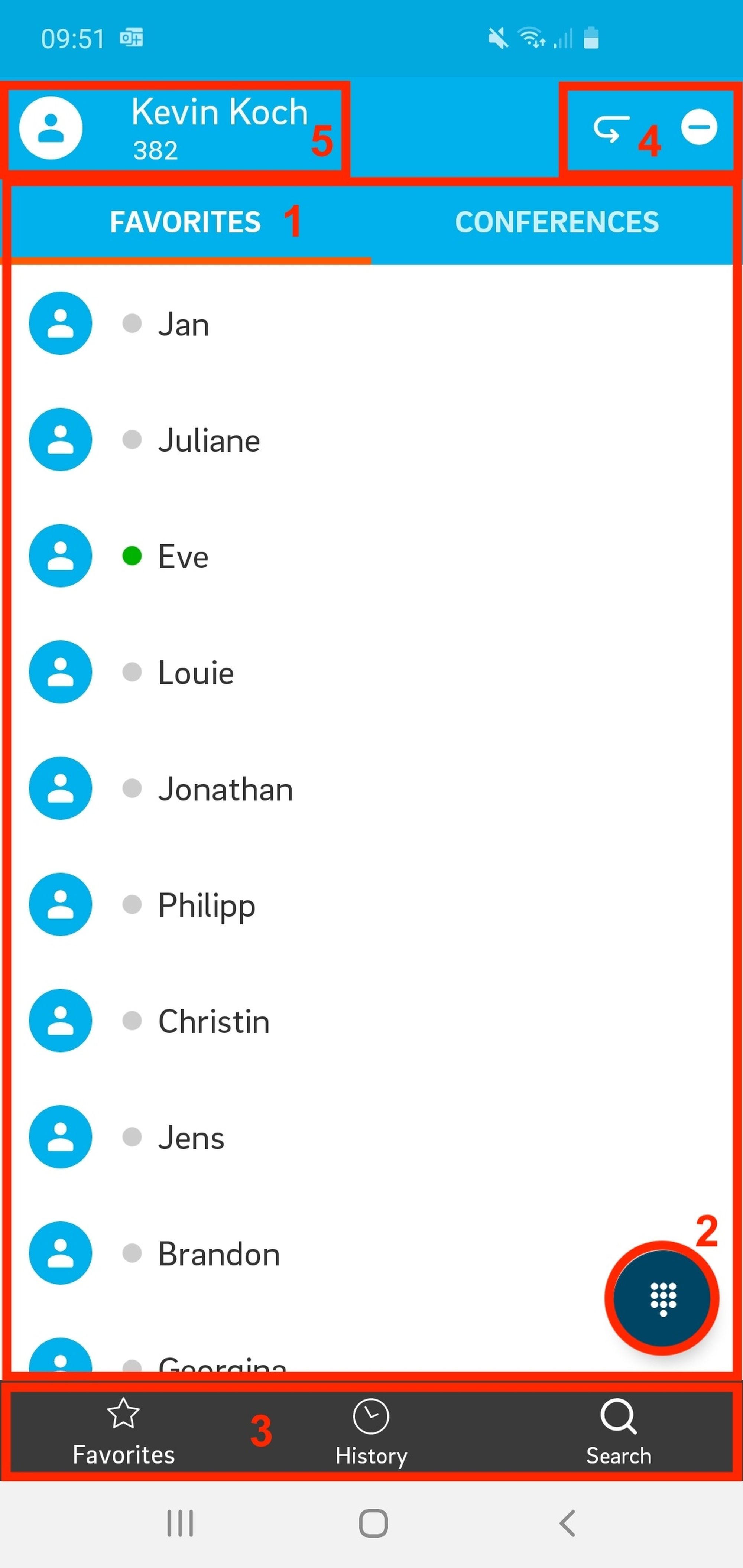 Wenn Sie sich angemeldet haben, ist die erste Ansicht Favoriten, die den Funktionstasten Ihrer Nebenstelle entsprechen.