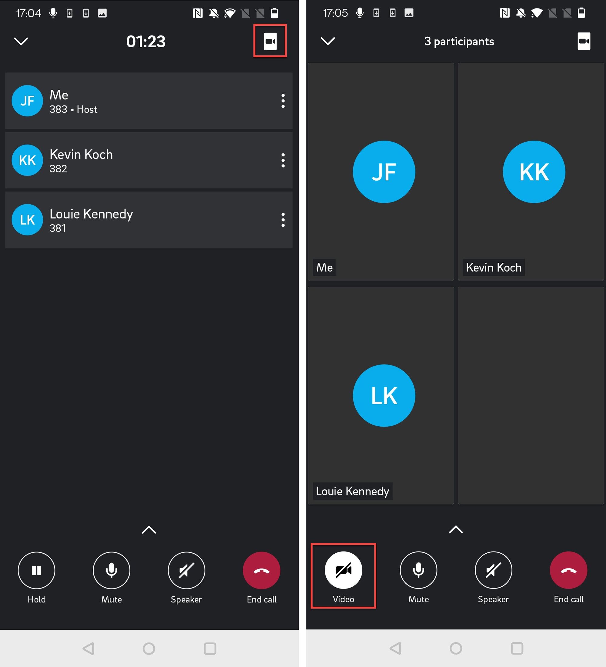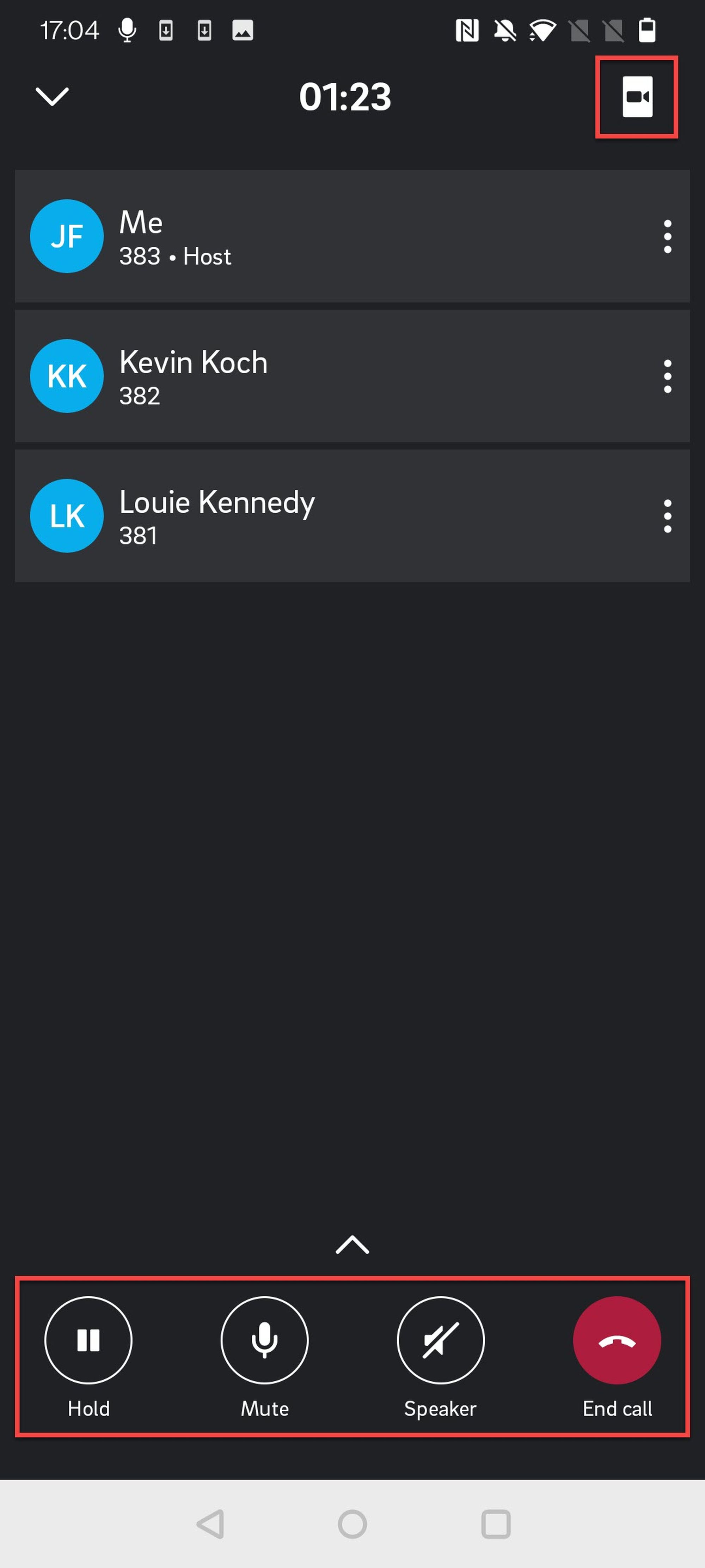 Like on any other call, you can change to the video mode by tipping the camera button in the upper right-hand corner. While in a conference, the video mode is automatically displayed in gallery view.