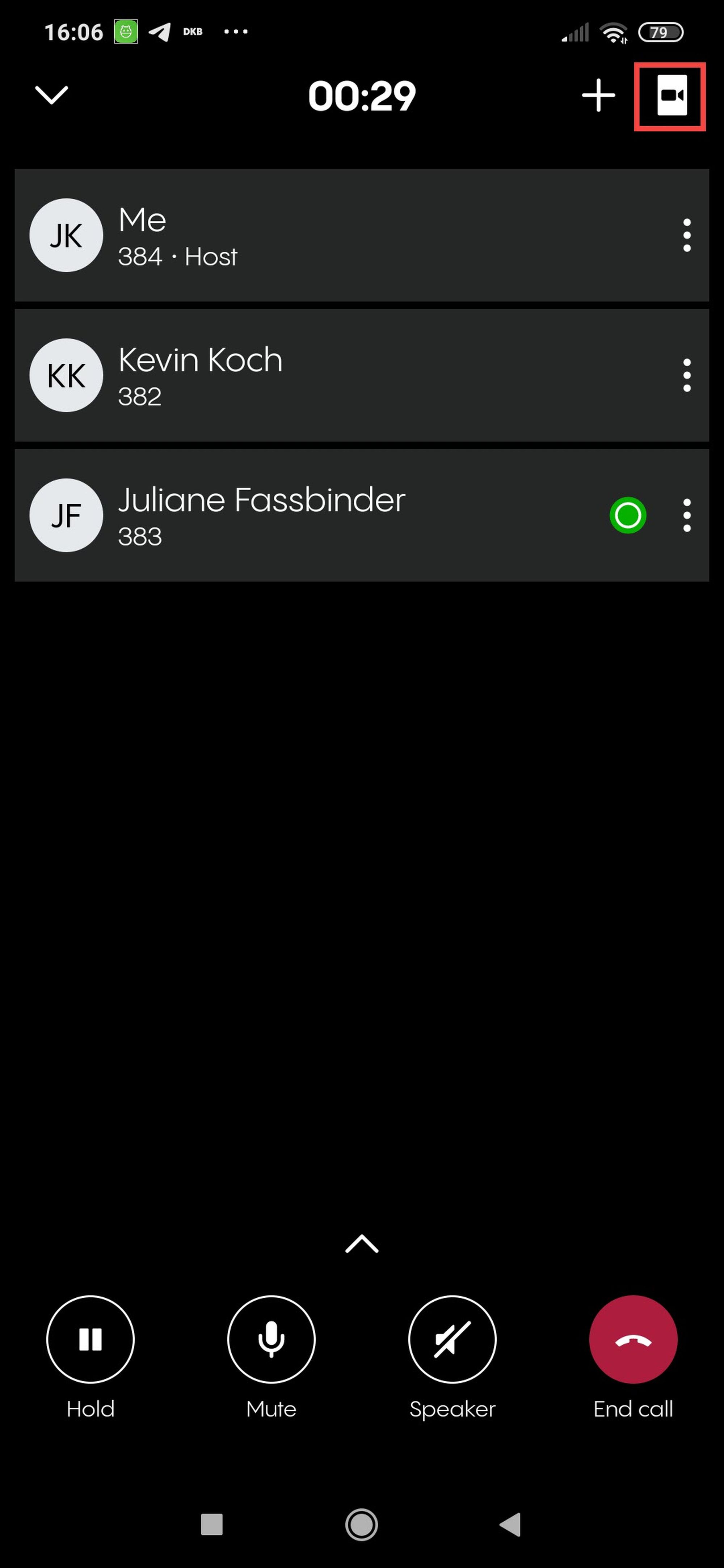 Tippen Sie auf den Pfeil nach oben, um auf die erweiterte Anrufoptionen zuzugreifen. In diesem Menü, als Teilnehmer, können Sie: