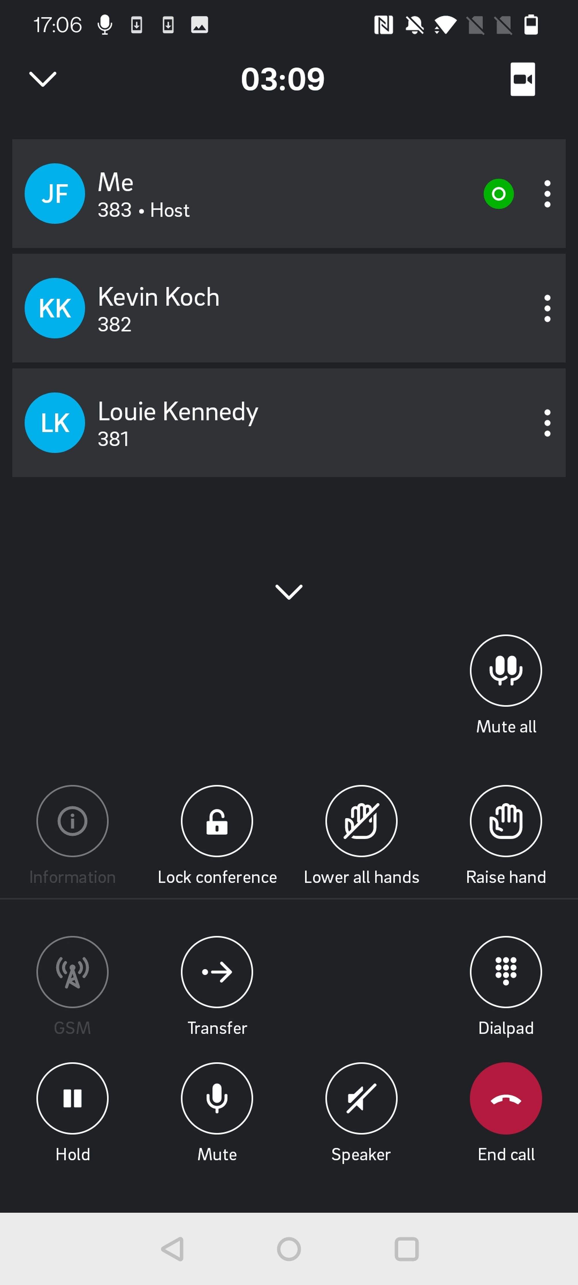 Wenn Sie auf die Optionen zur Verwaltung der Teilnehmer und der Konferenz klicken (drei Punkte in der rechten oberen Ecke), erscheint Folgendes: