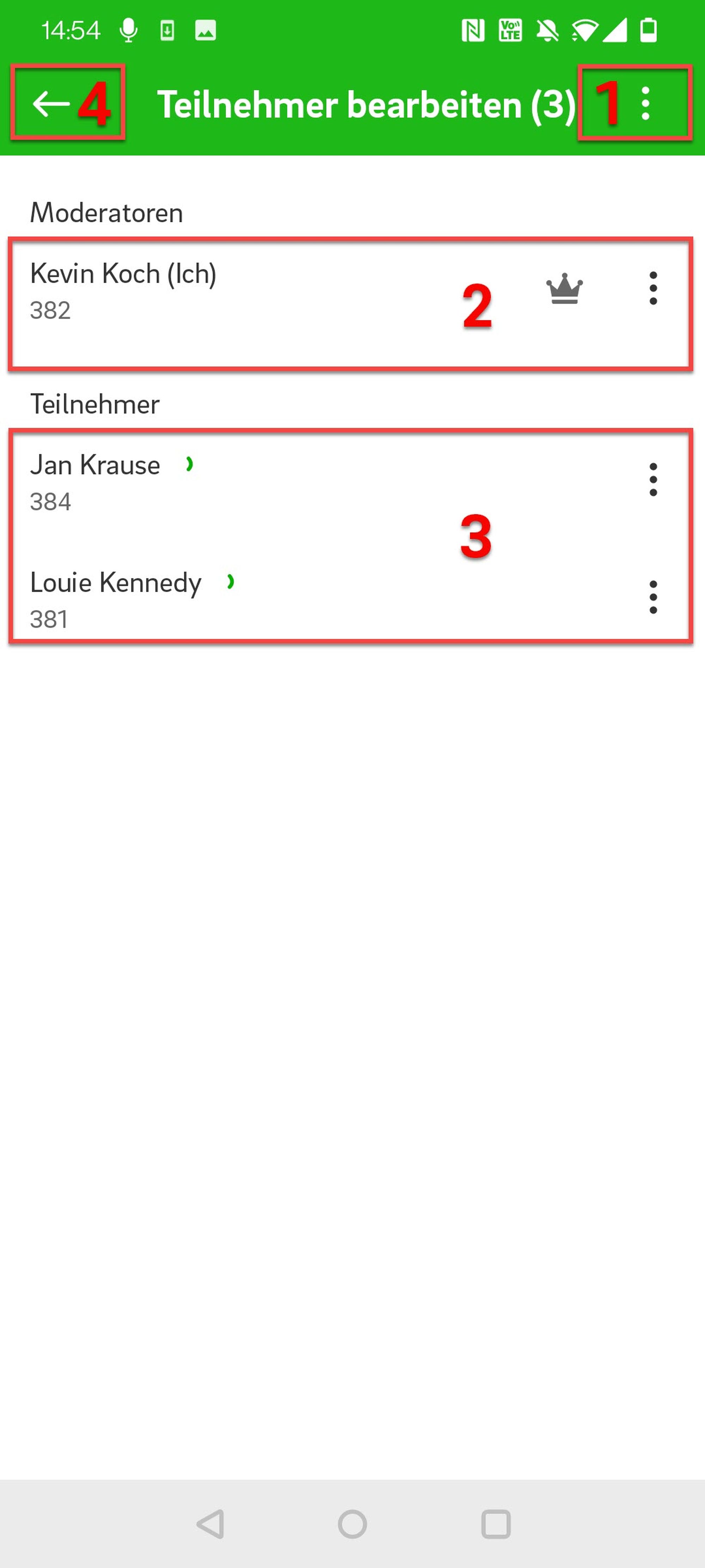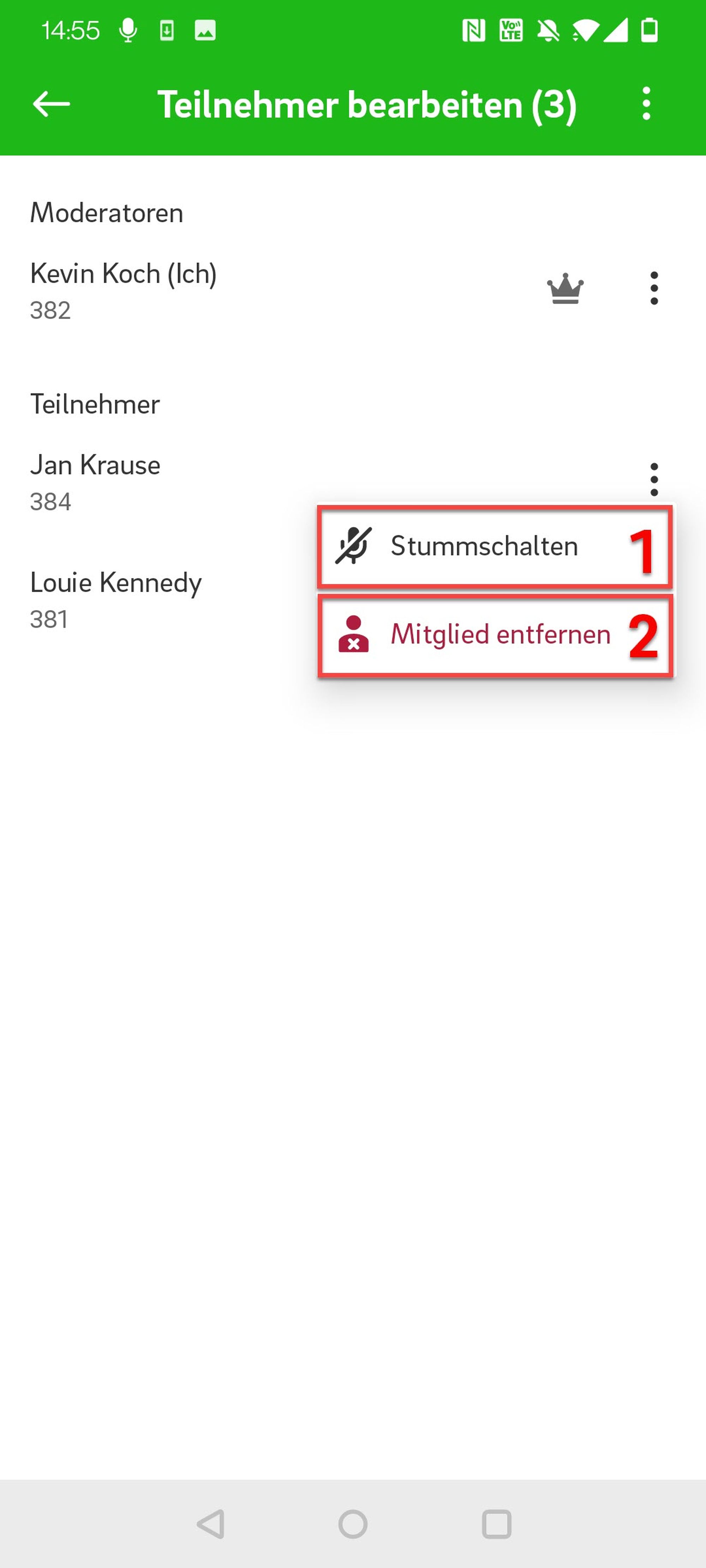 Wenn Sie auf die drei Punkte neben Ihrem Namen (Moderator) tippen, können Sie: