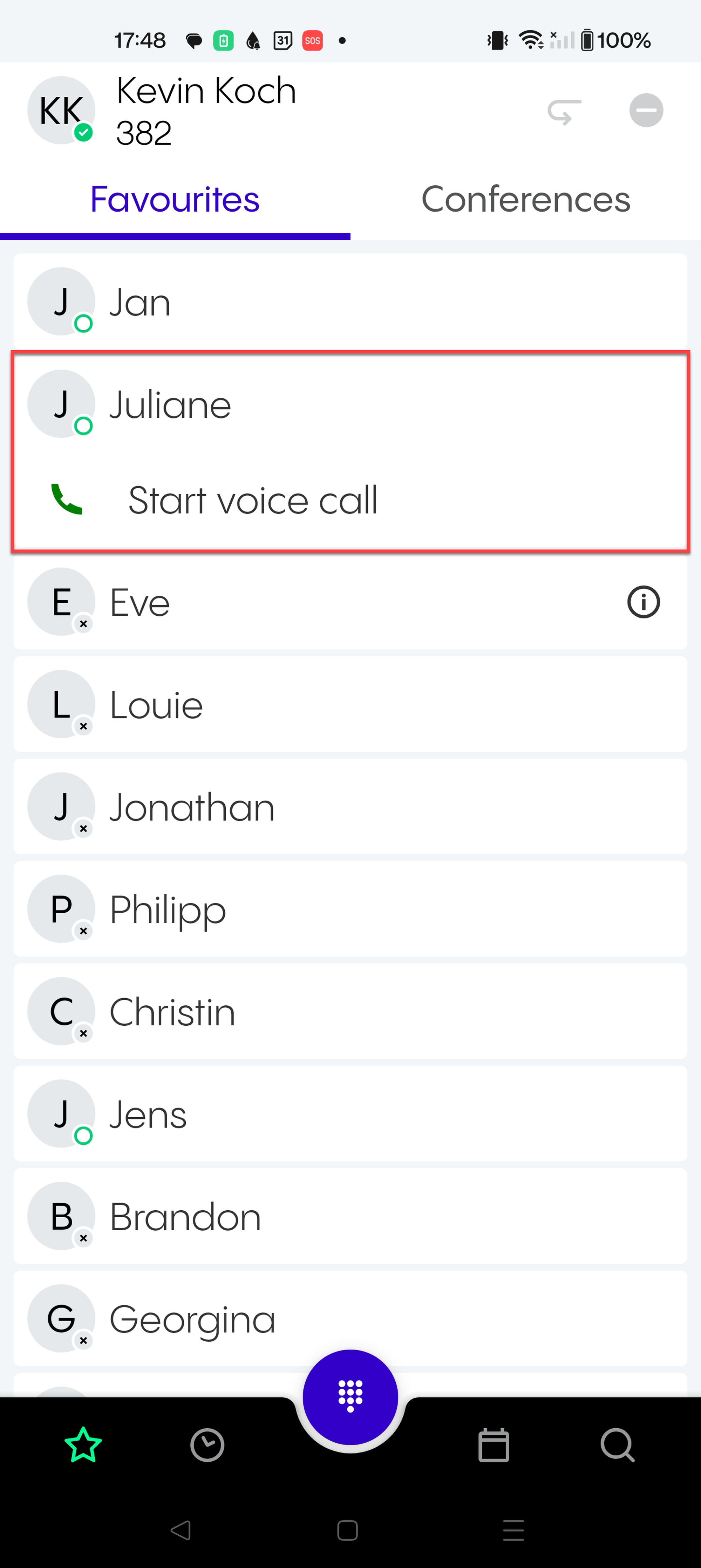 2. A search bar opens. Search your contacts as usual and start a call to the contact you want to add to the conference. Once the call is answered, the new participant automatically joins your conference.