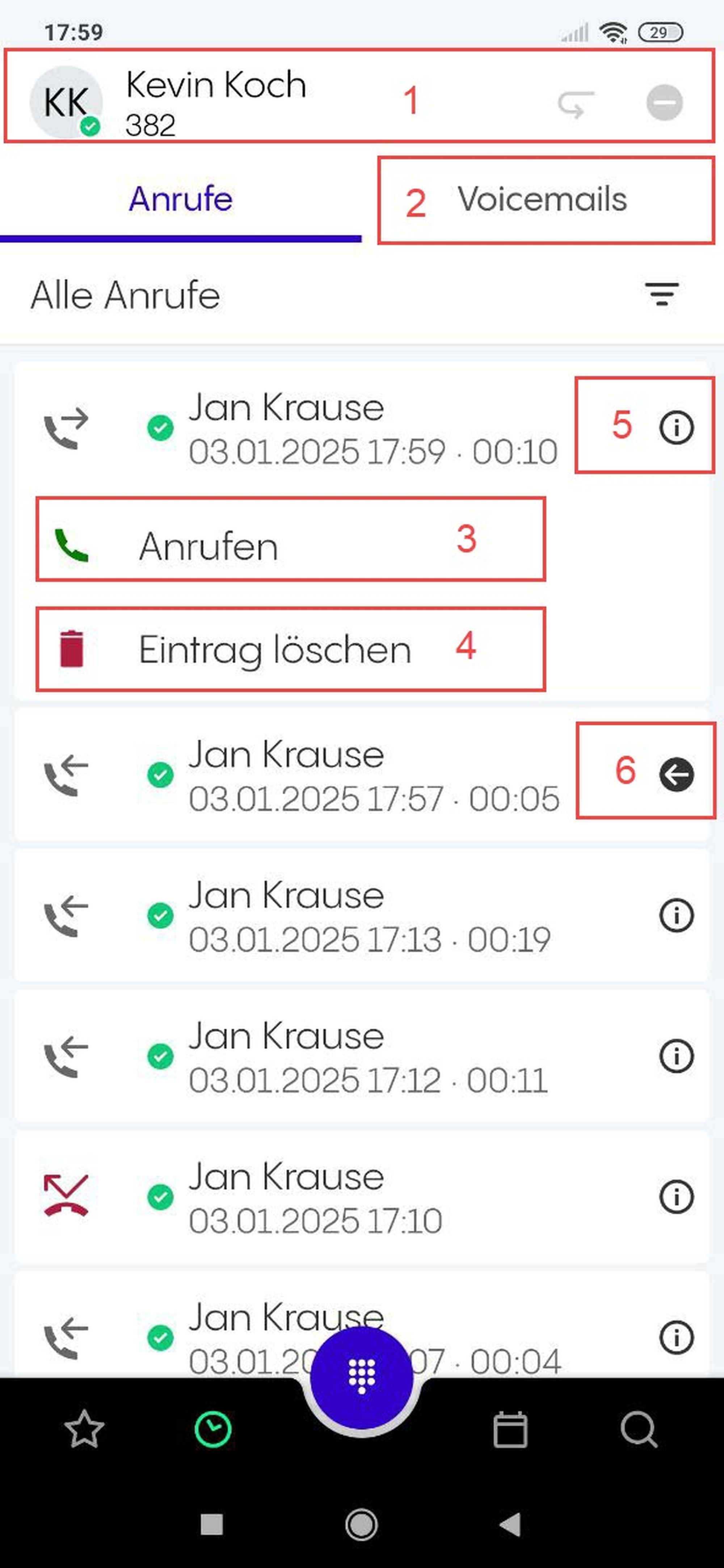 Im Tab Anrufe können Sie die Rufliste der letzten Anrufe einsehen. Die Rufliste wird automatisch aktualisiert; Sie können die Aktualisierung aber auch manuell auslösen, indem Sie von oben nach unten wischen.