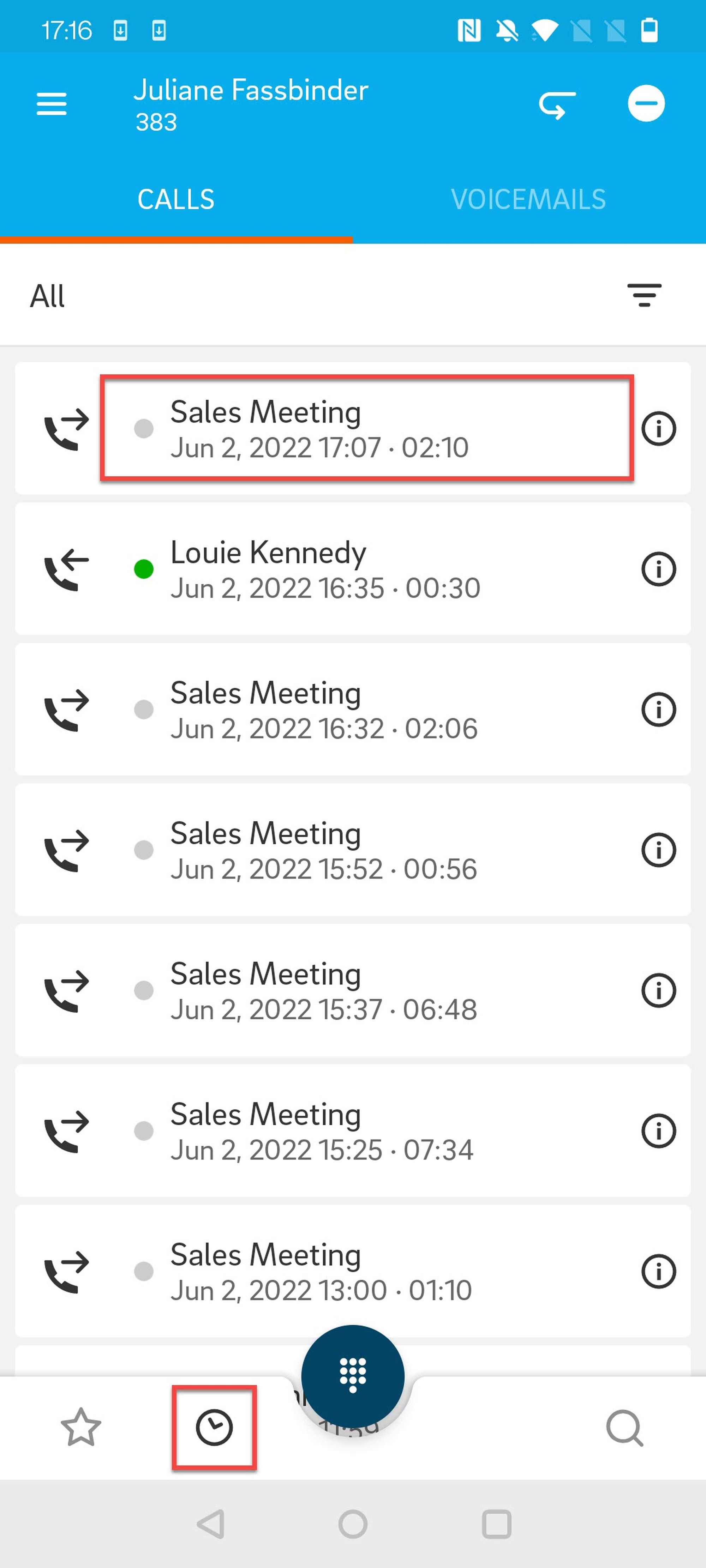 Im Tab Voicemails finden Sie Ihre gespeicherten Voicemails/Sprachnachrichten.