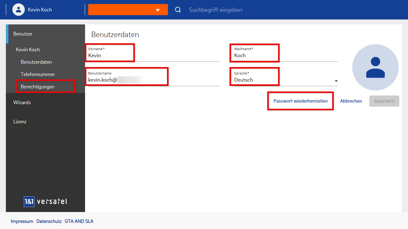 ⇒ Die Seite Benutzerdaten wird geöffnet.