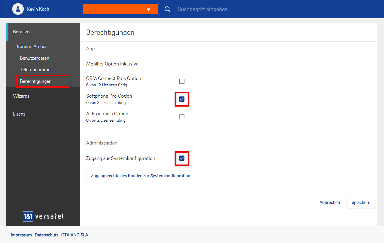 Aktivieren oder deaktivieren Sie das Kontrollkästchen neben Zugang zur Systemkonfiguration, um diesem Benutzer Administratorrechte zuzuweisen oder zu entziehen.