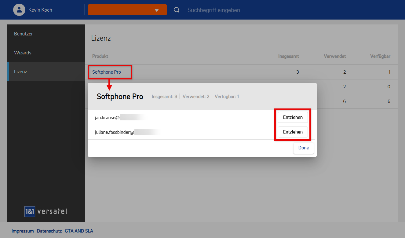 Klicken Sie auf ein Produkt (im Beispiel hier: Softphone Pro), um anzuzeigen, welche Benutzer über Lizenzen verfügen.