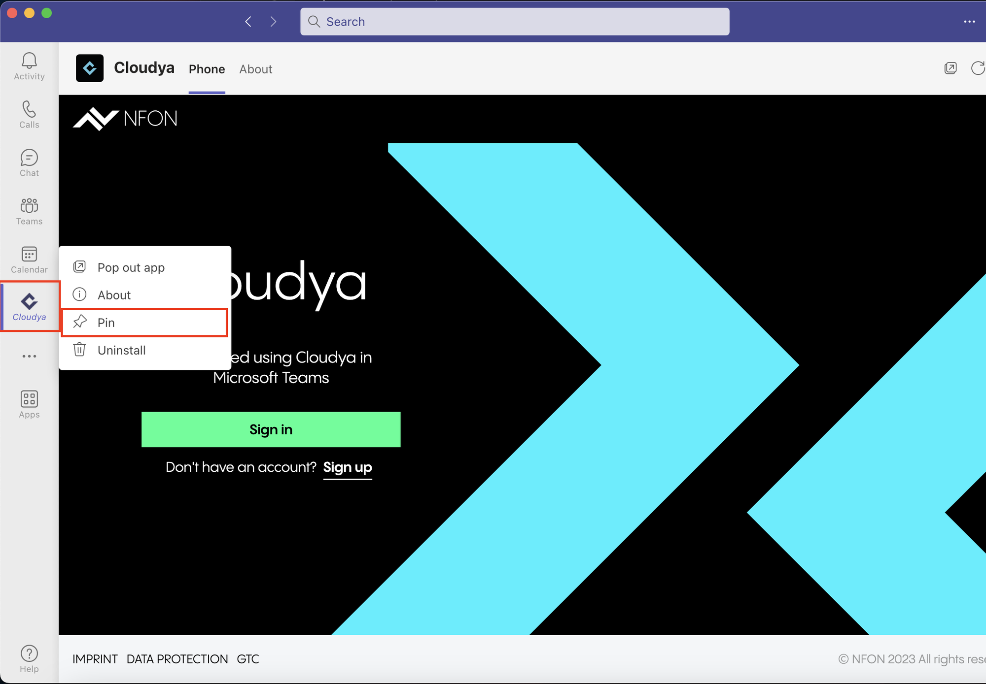 5. Right-click on the 1&1 Business Phone icon in the navigation bar on the left and click on Pin.