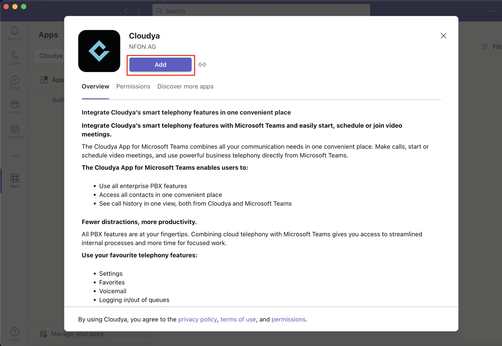 Keep in mind that some features are not available in the 1&1 Business Phone App for MS Teams (e.g. Call forwarding, Fax or Shortcuts). To use these functions, open the Desktop app that is running in the background.