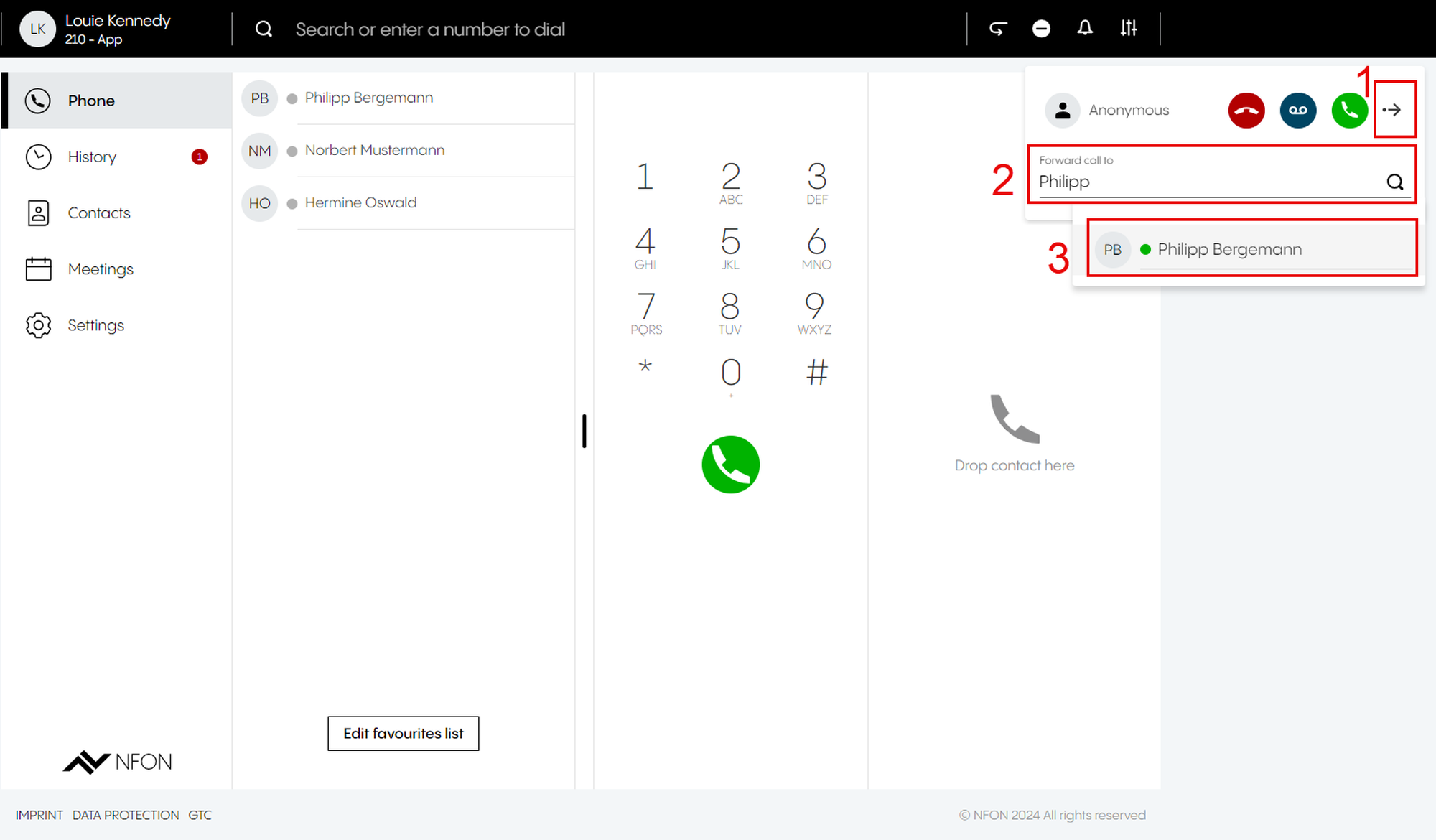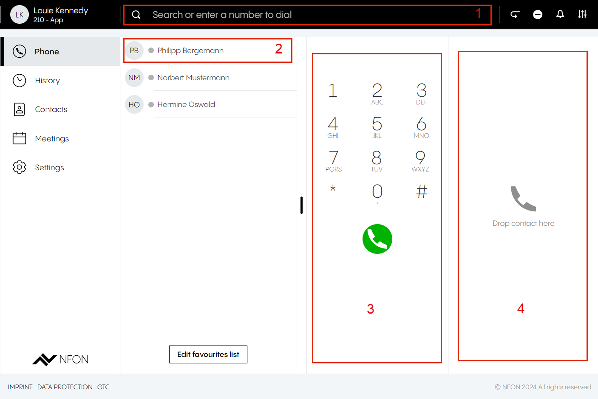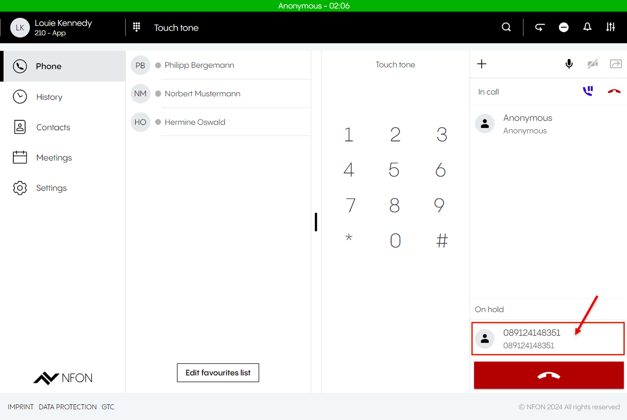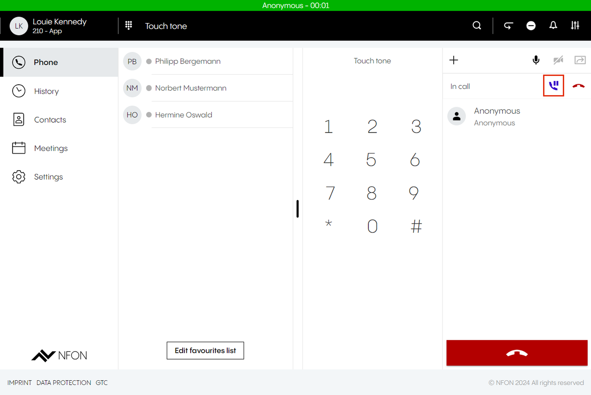 ⇒ The new device (here, the hotel room phone) is now selected as the device to make calls with.Dial the number you would like to call.