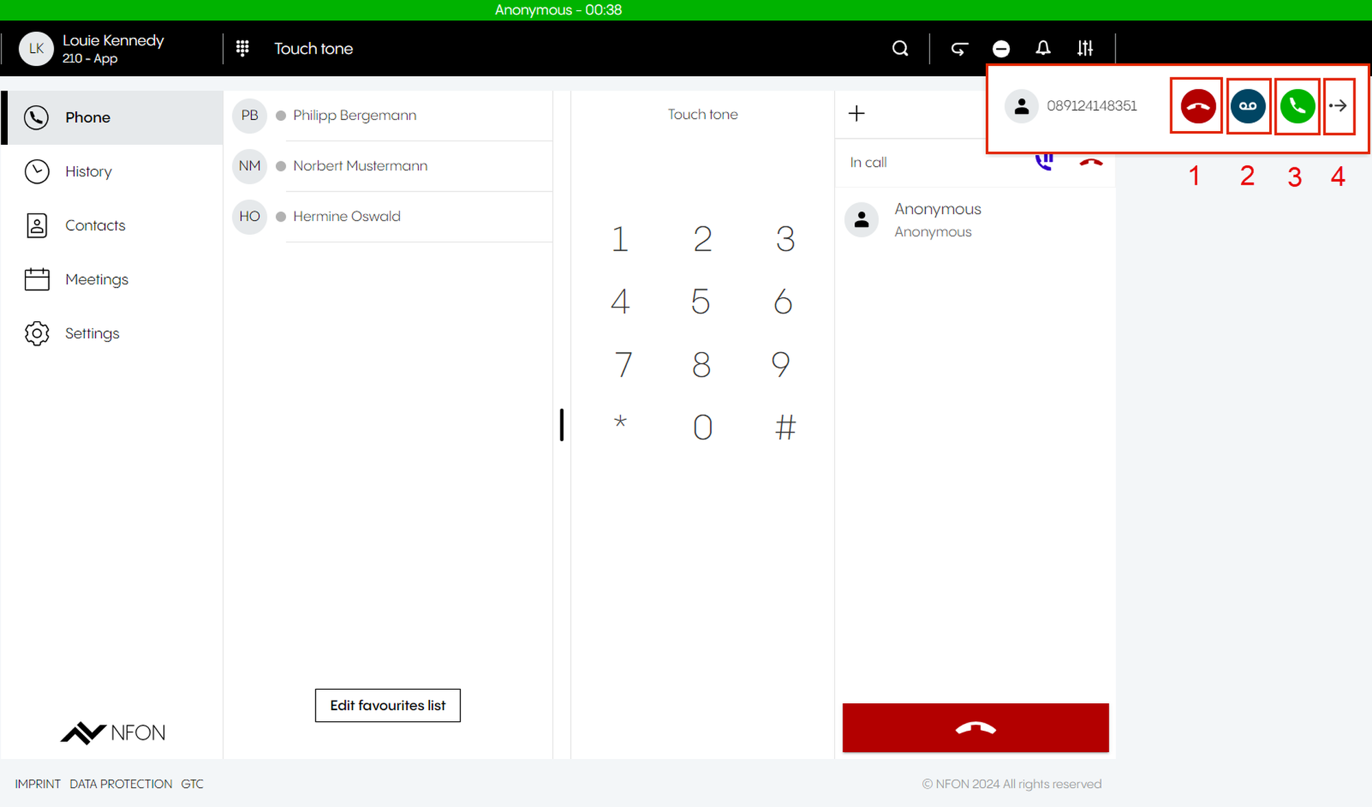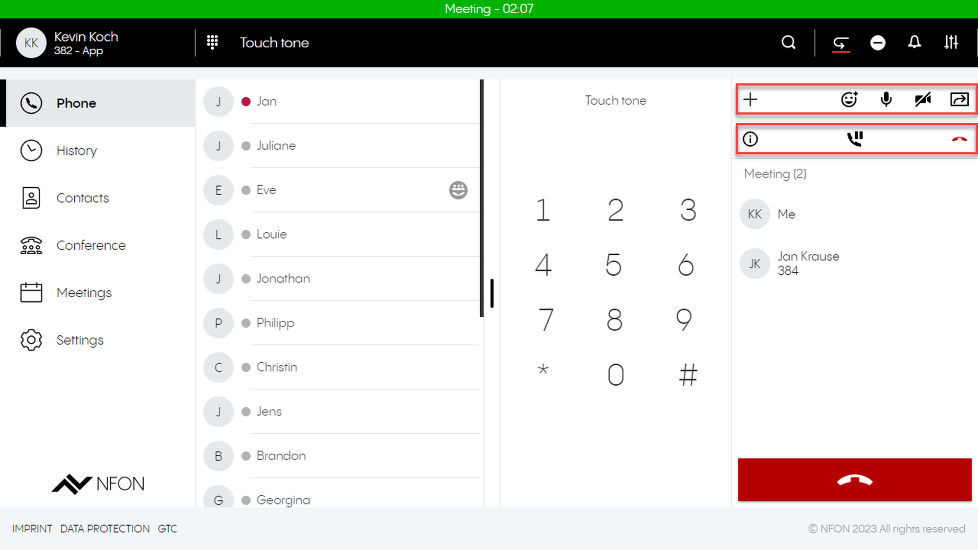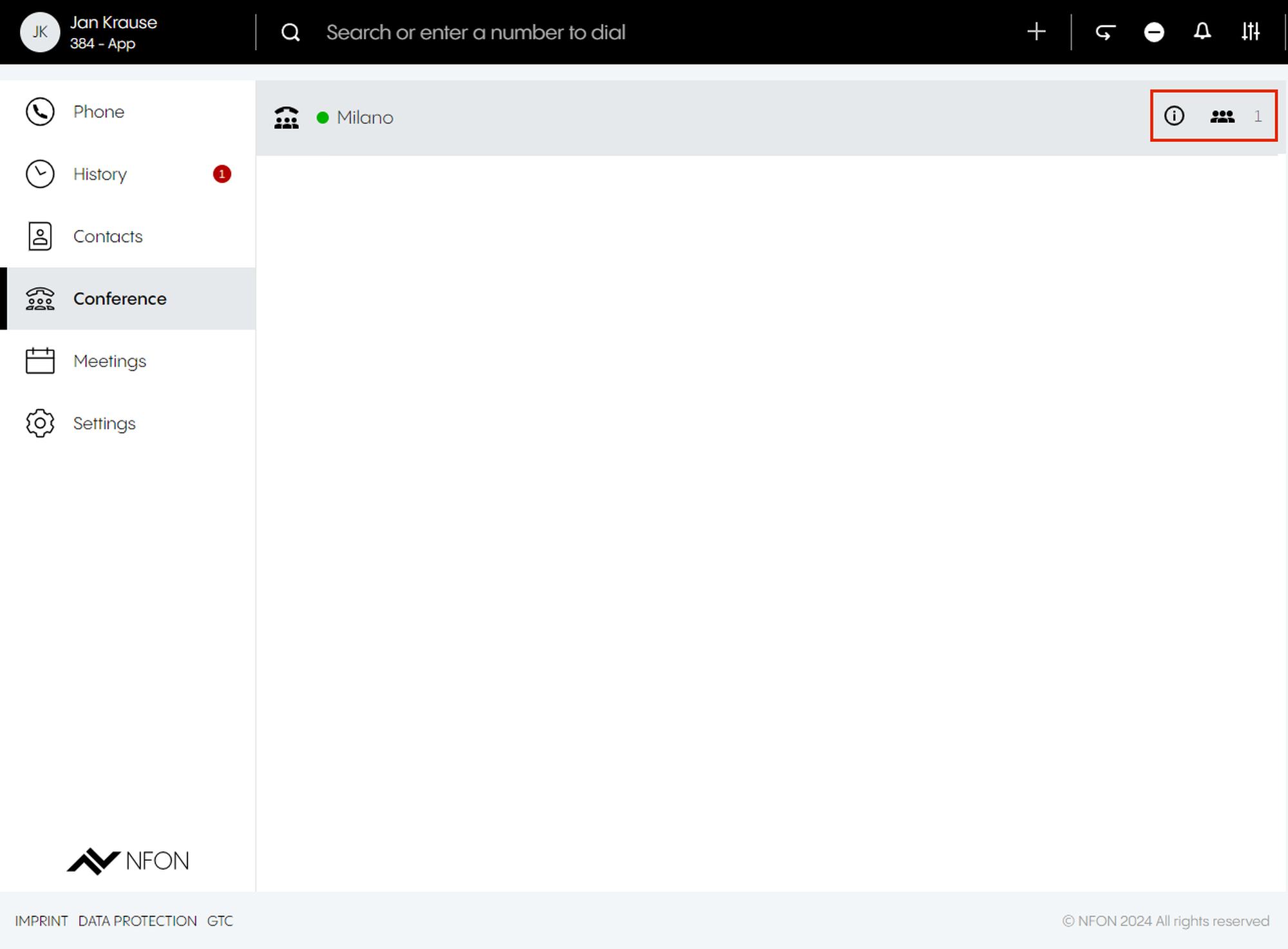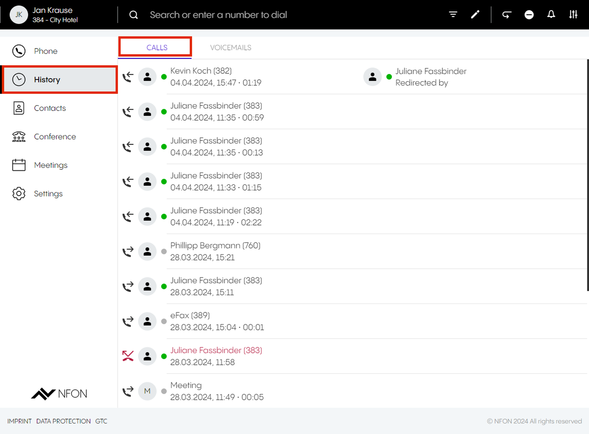 In this section, you can see your recent events, i.e. incoming, outgoing and missed calls, conferences and meetings that you have attended, as well as access your voicemails.