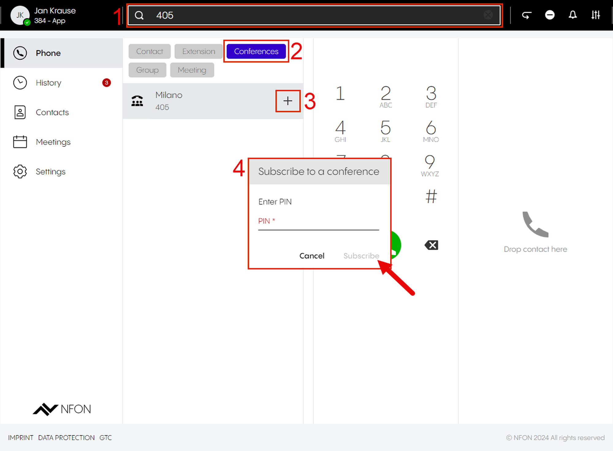 The search bar is used to browse contacts, extensions, conferences, meetings and groups. Search results are clustered into these categories.