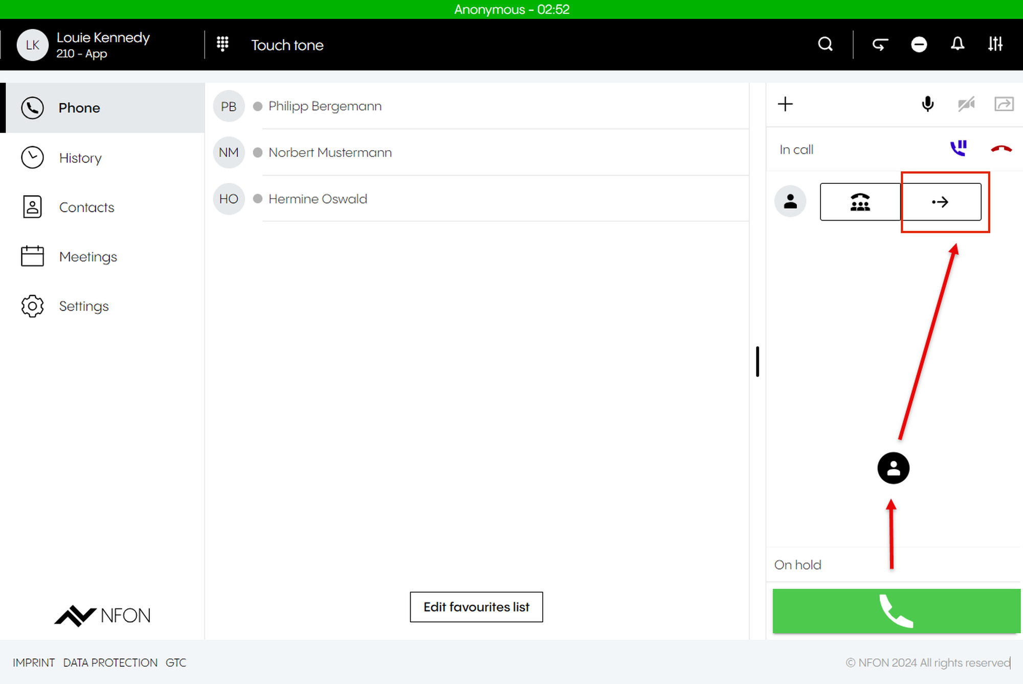 ⇒ The selected device (here, the hotel room phone) will ring.Accept the call.