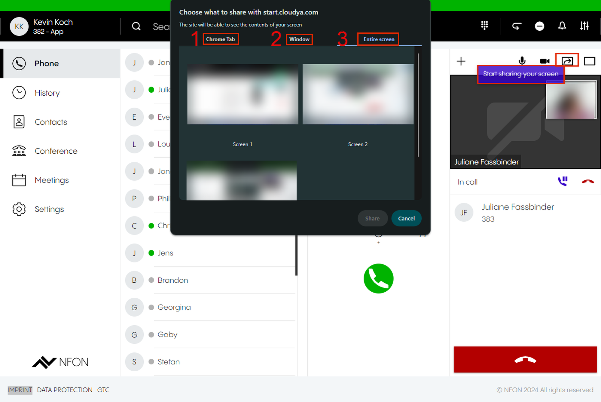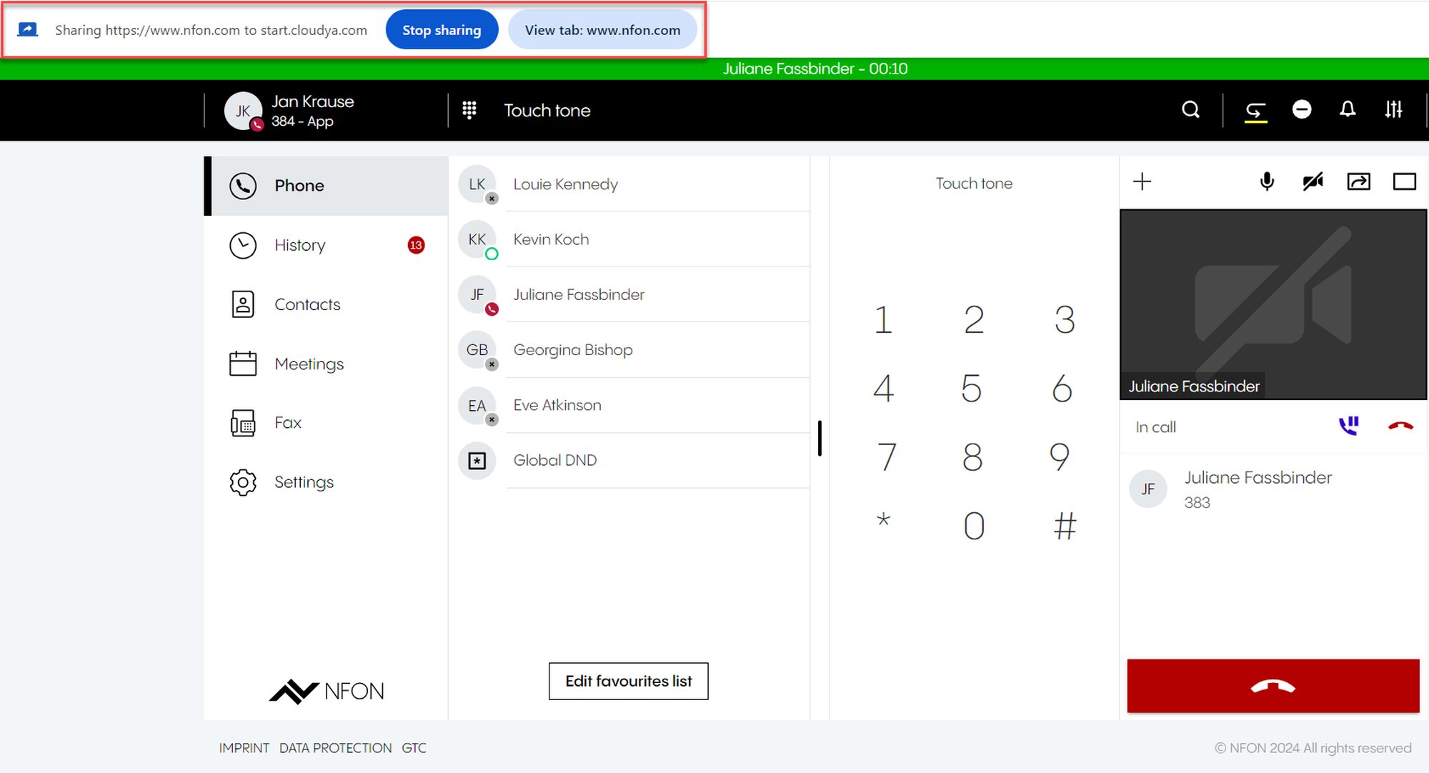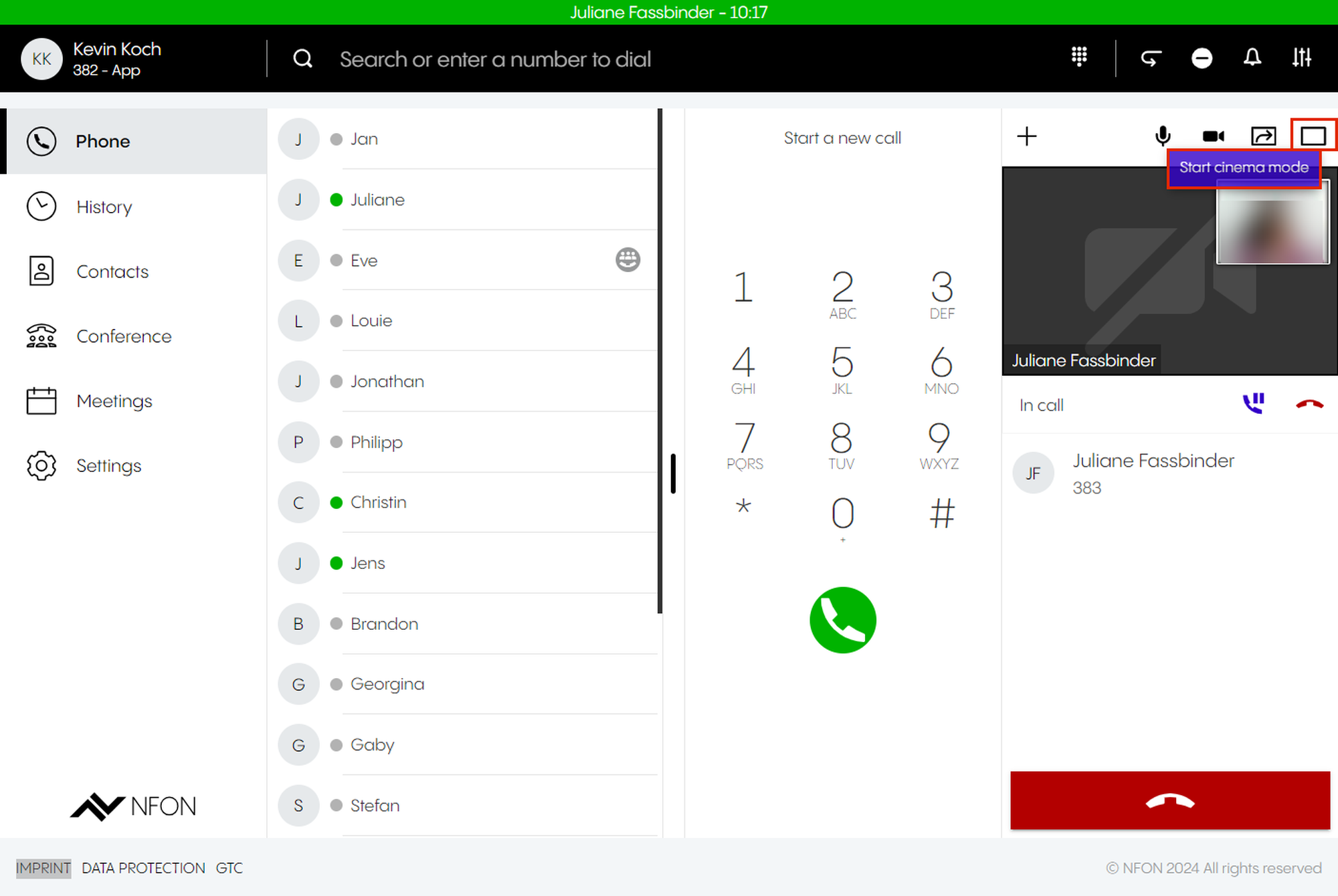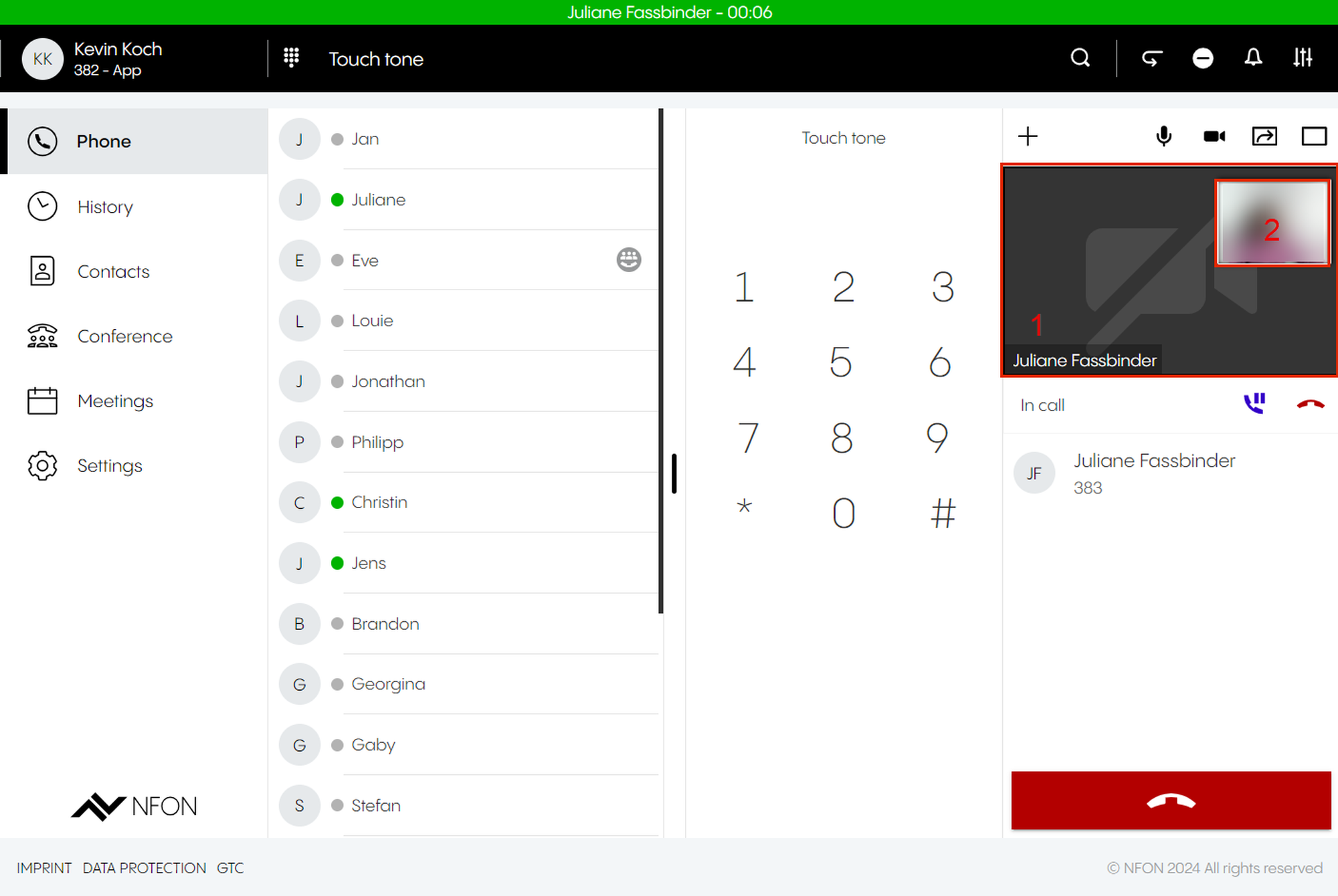 When the app menu is closed, you can see your name and the device you are calling with in the top-left corner.
