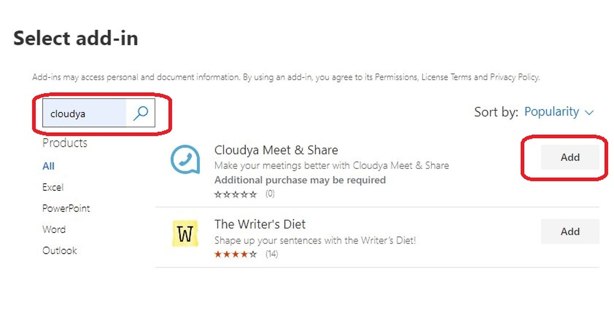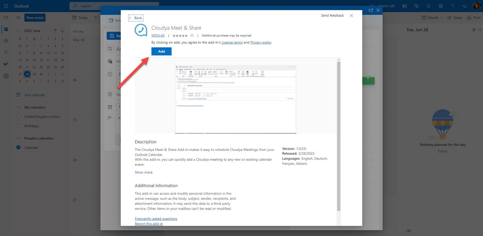 5. Search for 1&1 Business PhoneMeet & Share in the store and click on Add. To install the add-in, you have to agree the license terms and privacy policy by clicking on Continue.