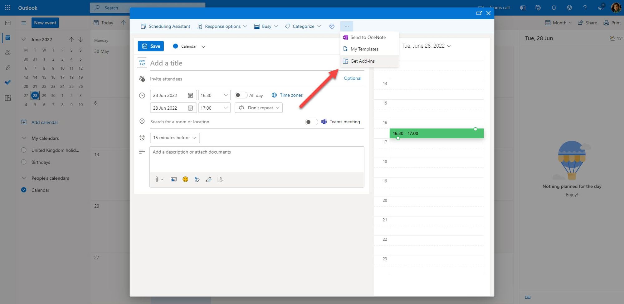 3. To open the the options menu in this window, click on the three dots in the upper right corner. Open the options menu and click on Get Add-ins.
