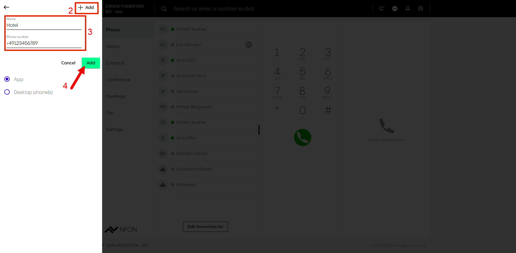 ⇒ An input field opens up.Enter a name and telephone number for the external number, e.g. Hotel.