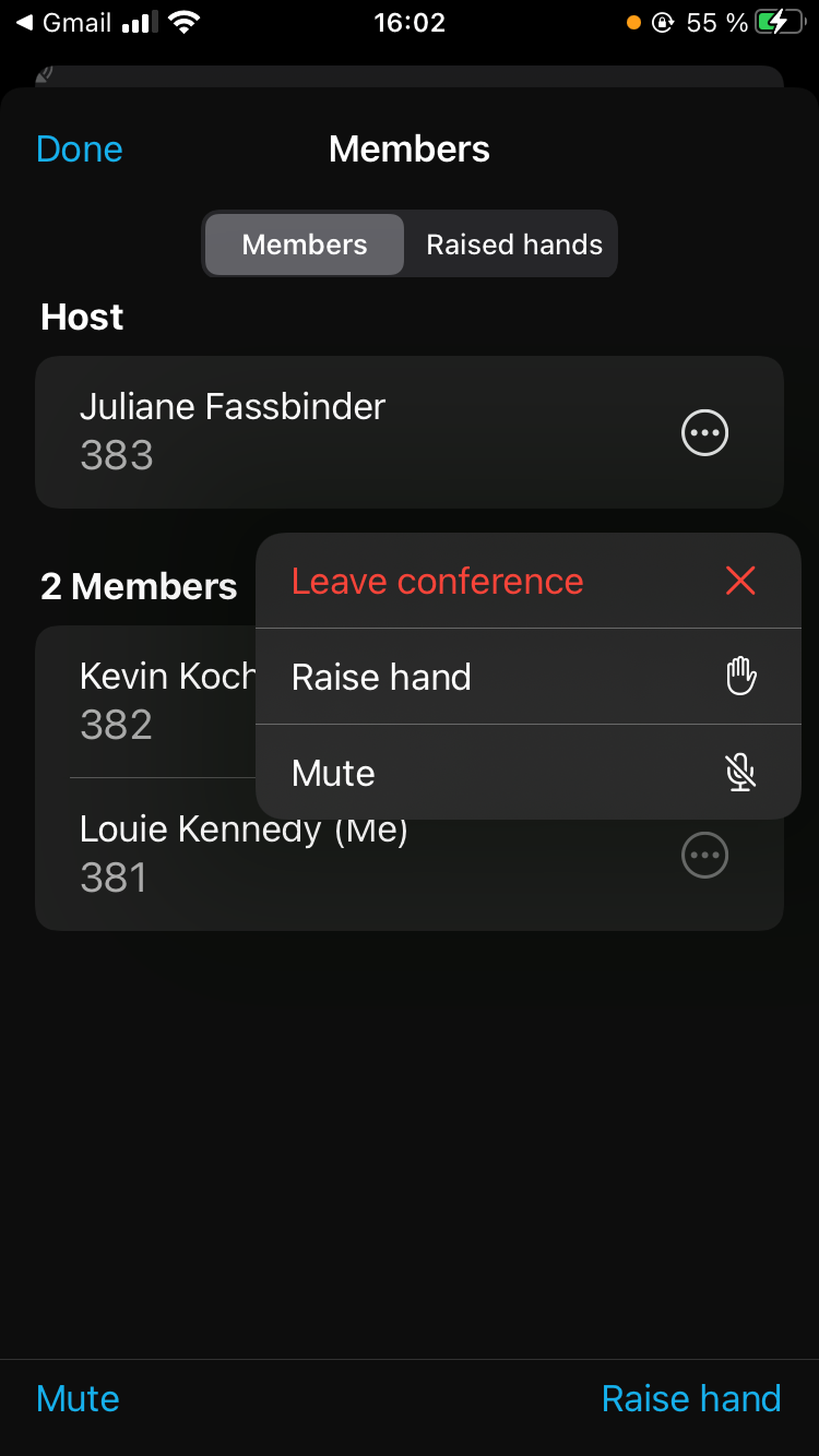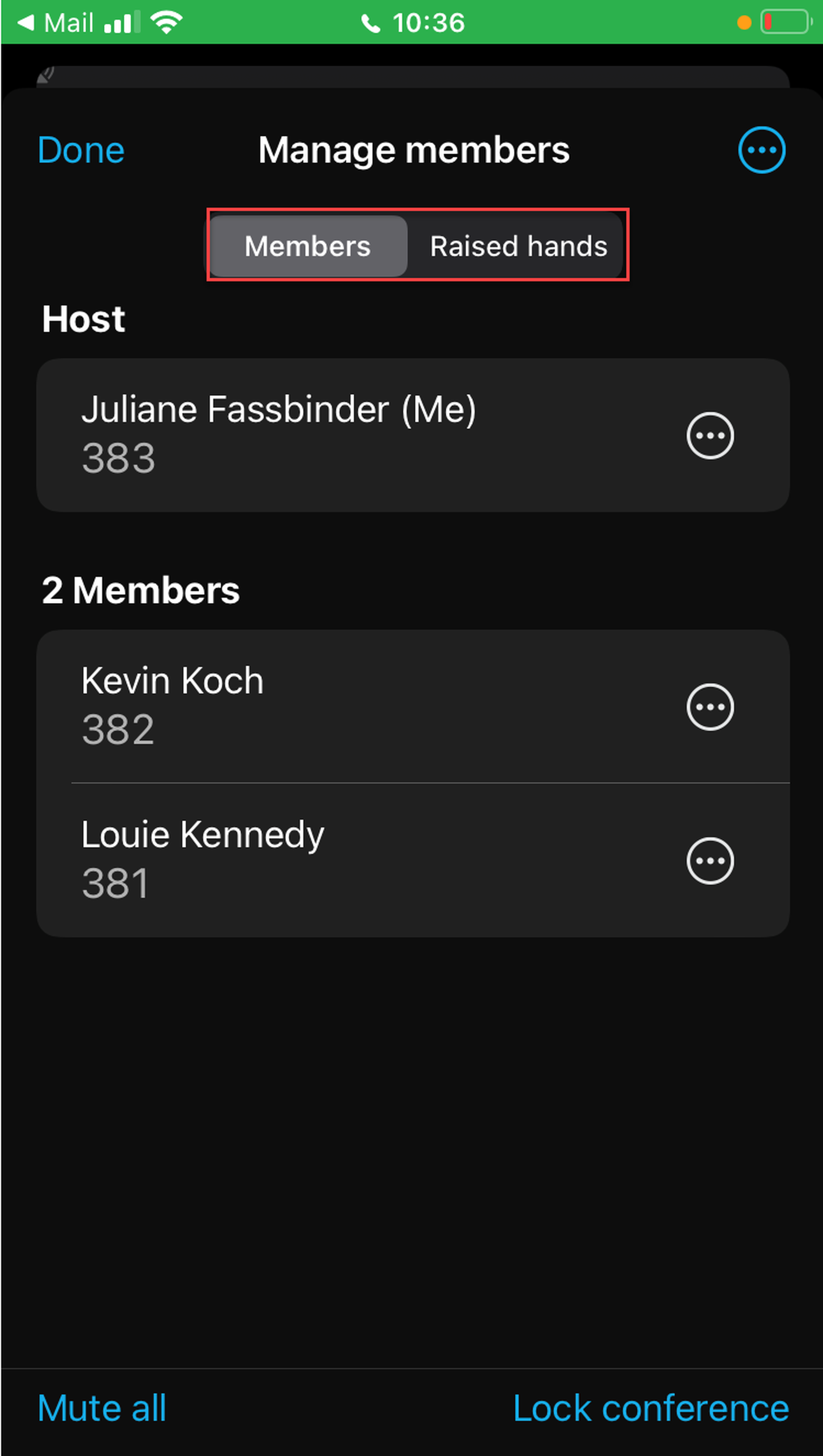 When in the audio mode, tap in the middle of the screen. You will see two tabs, Members and Raised hands.