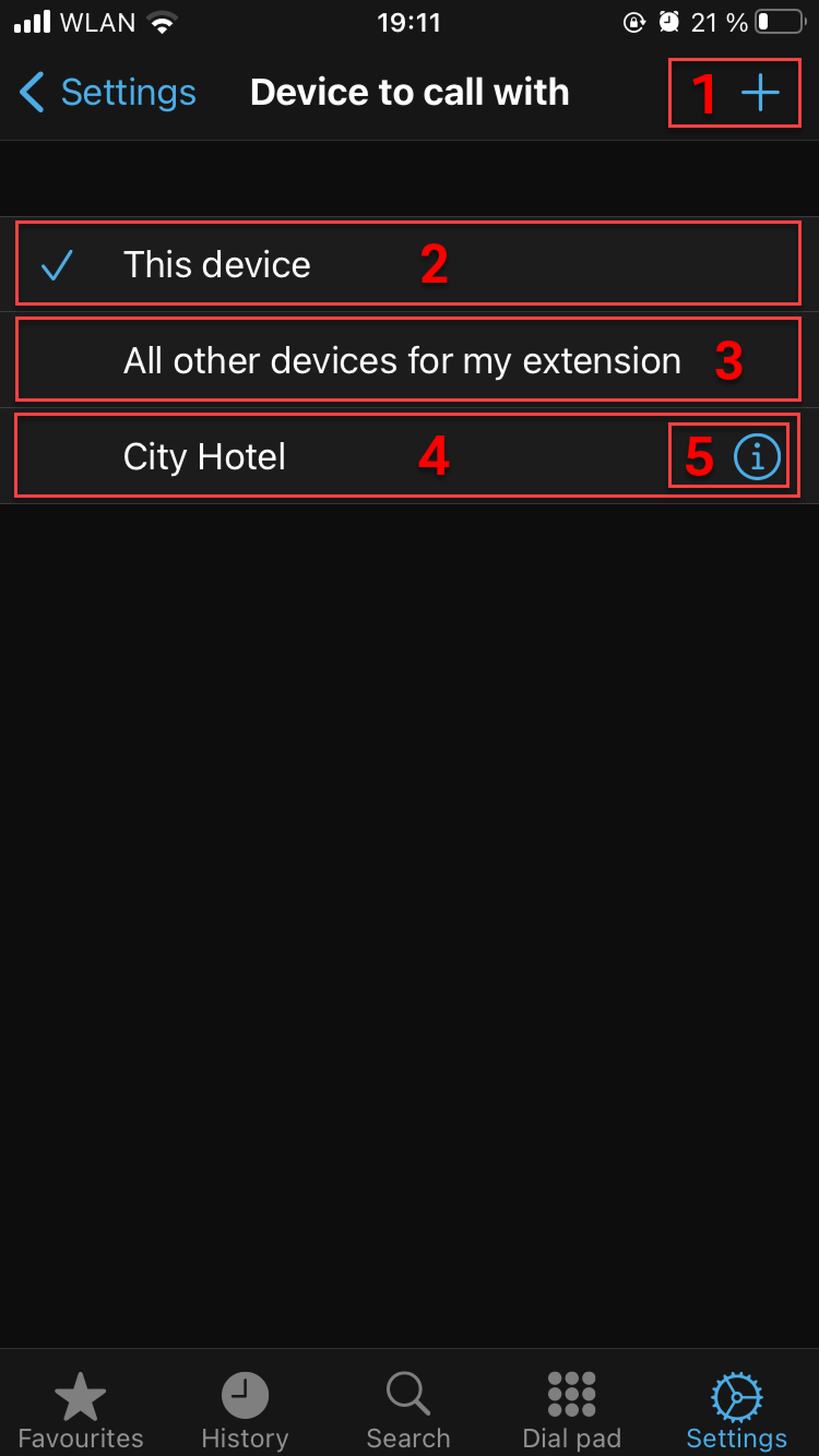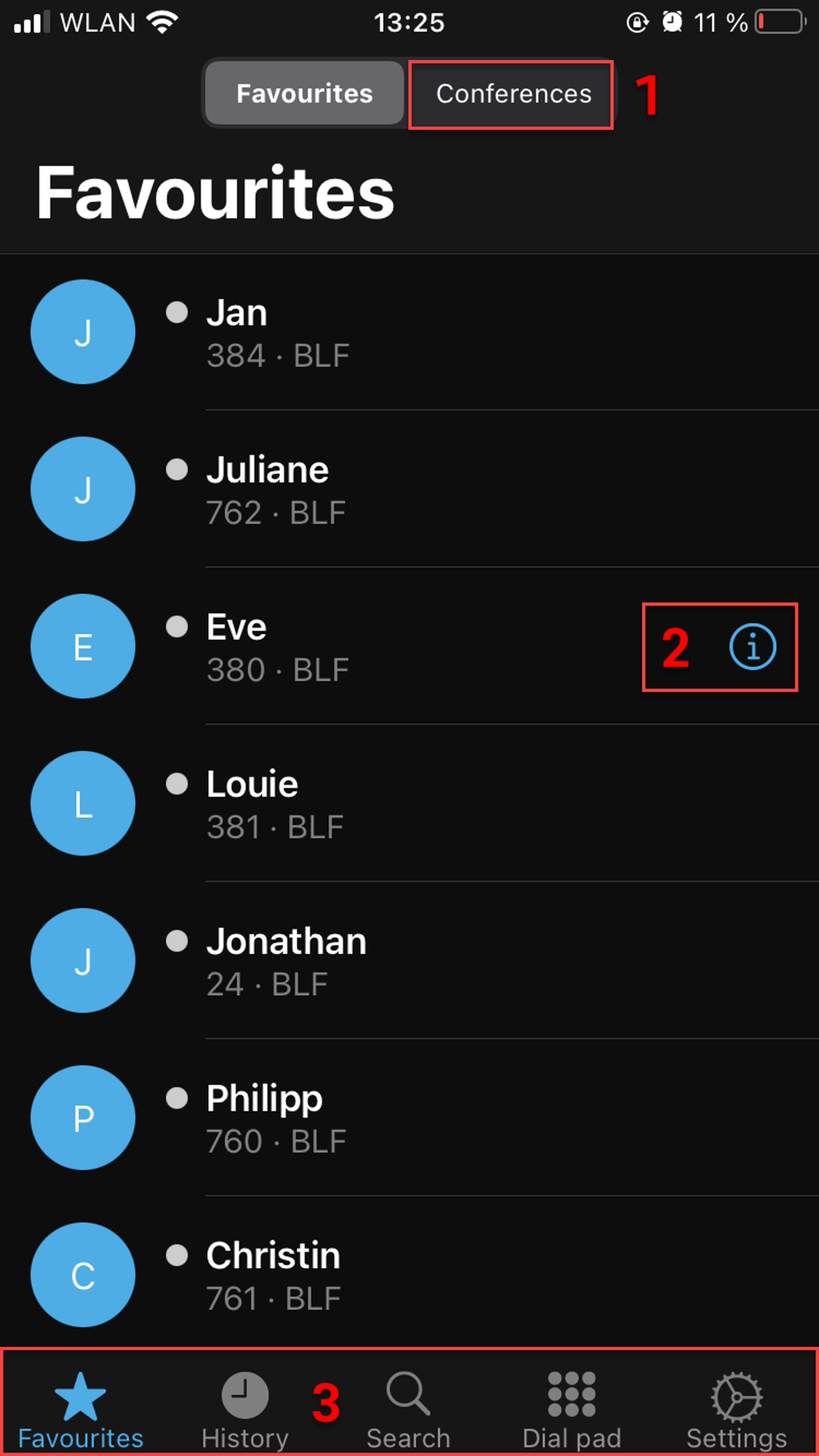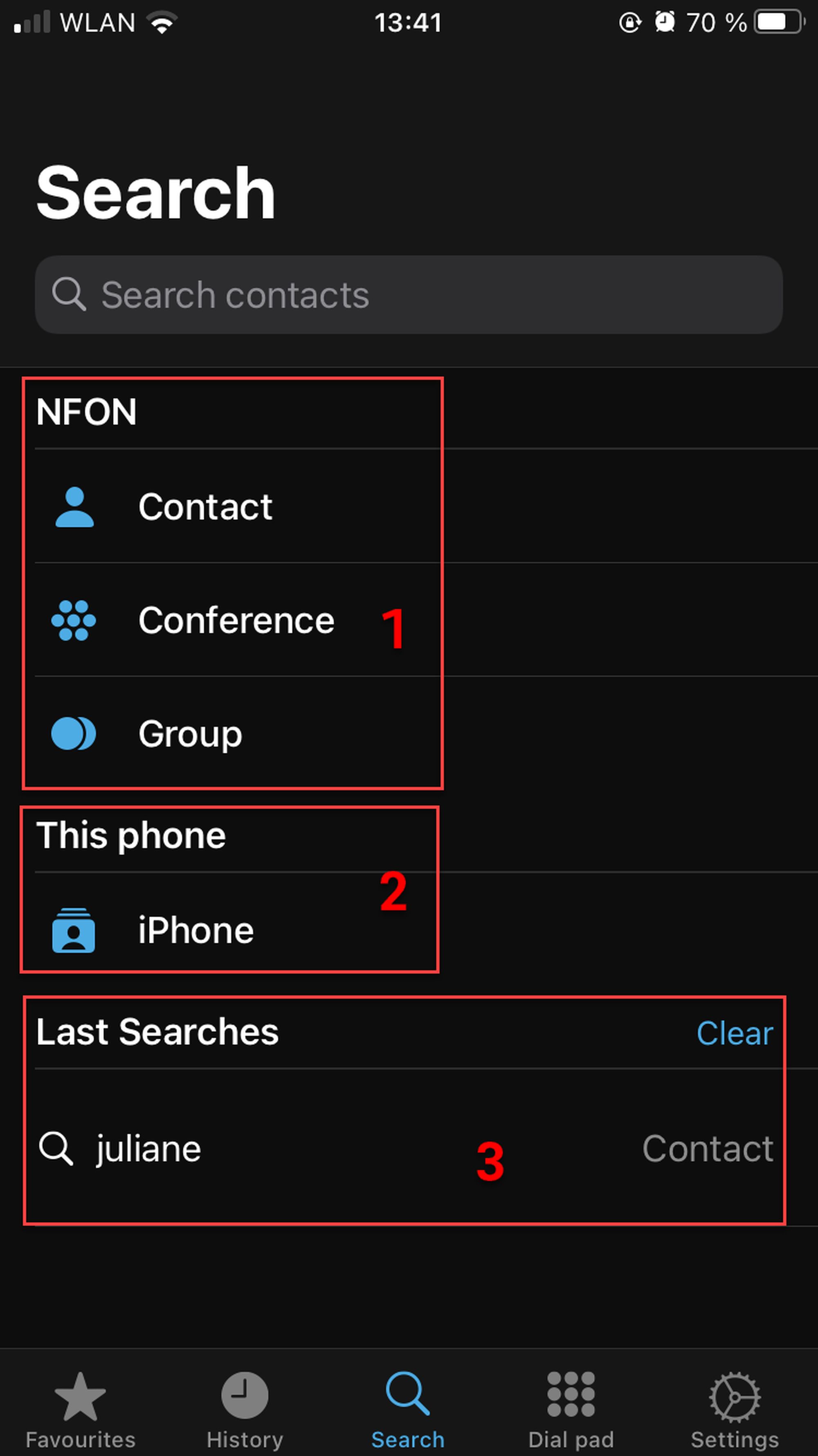 Switch to Favourites, Search, Dial pad or Settings tabs