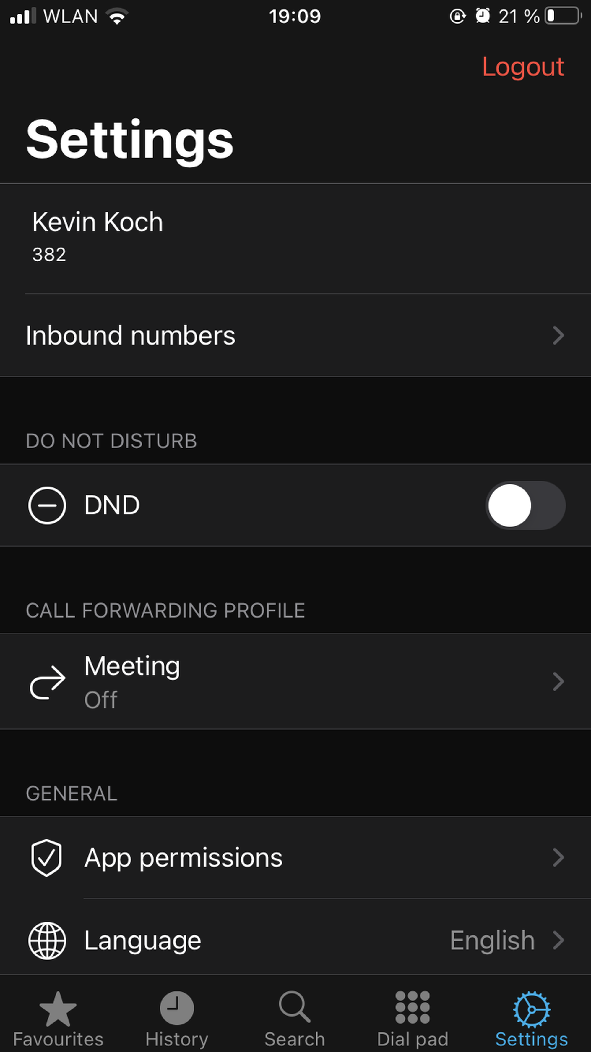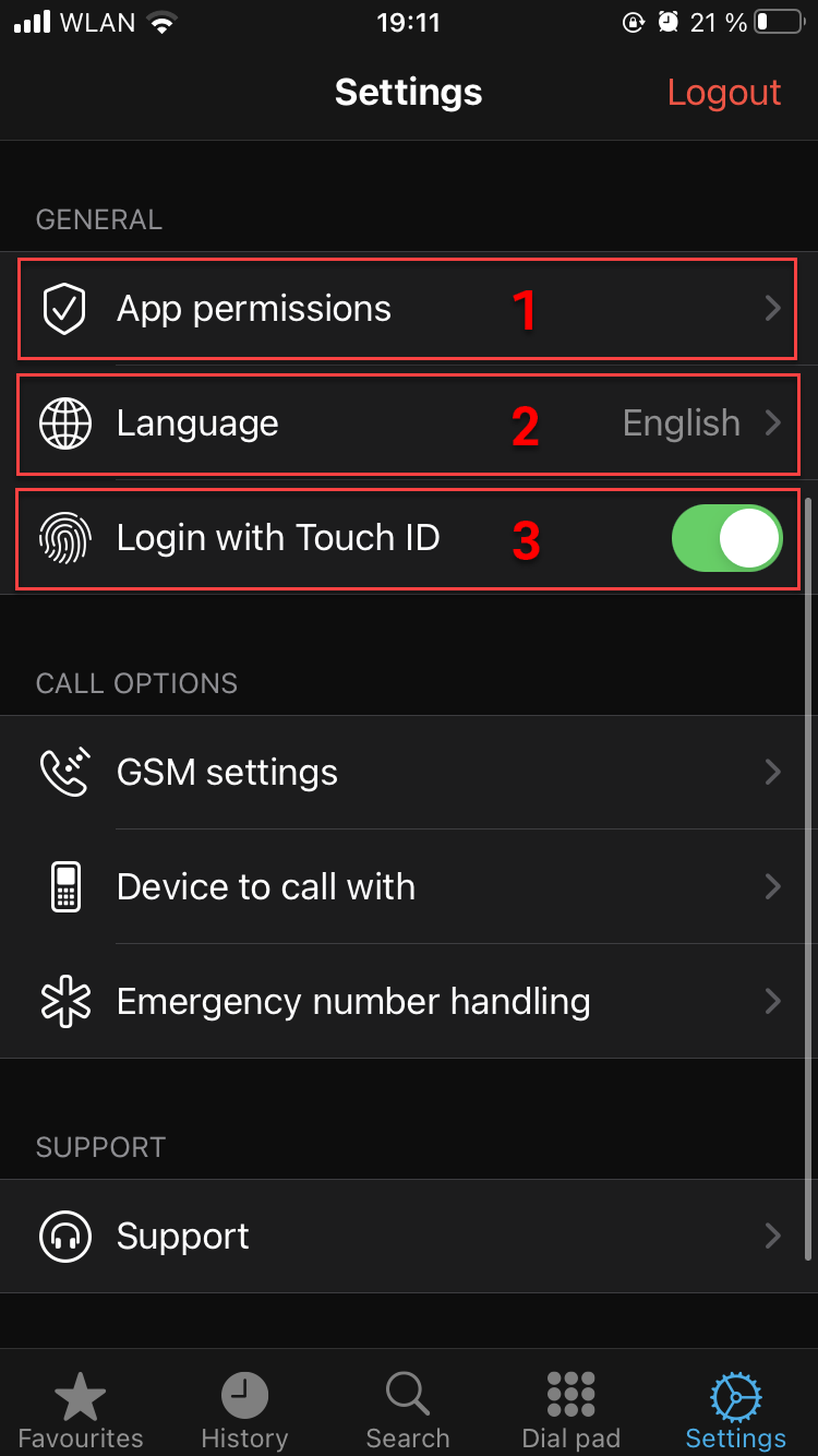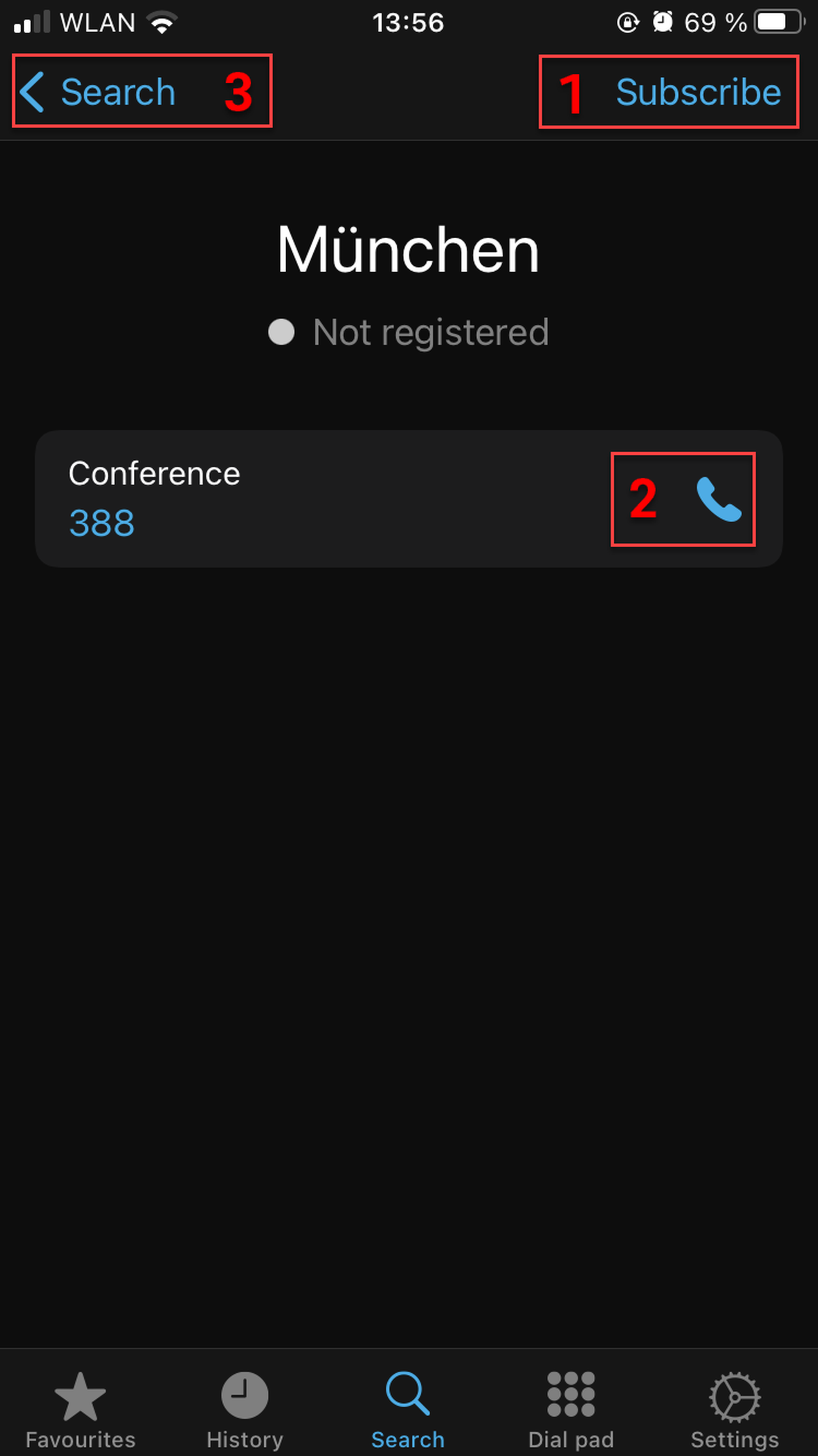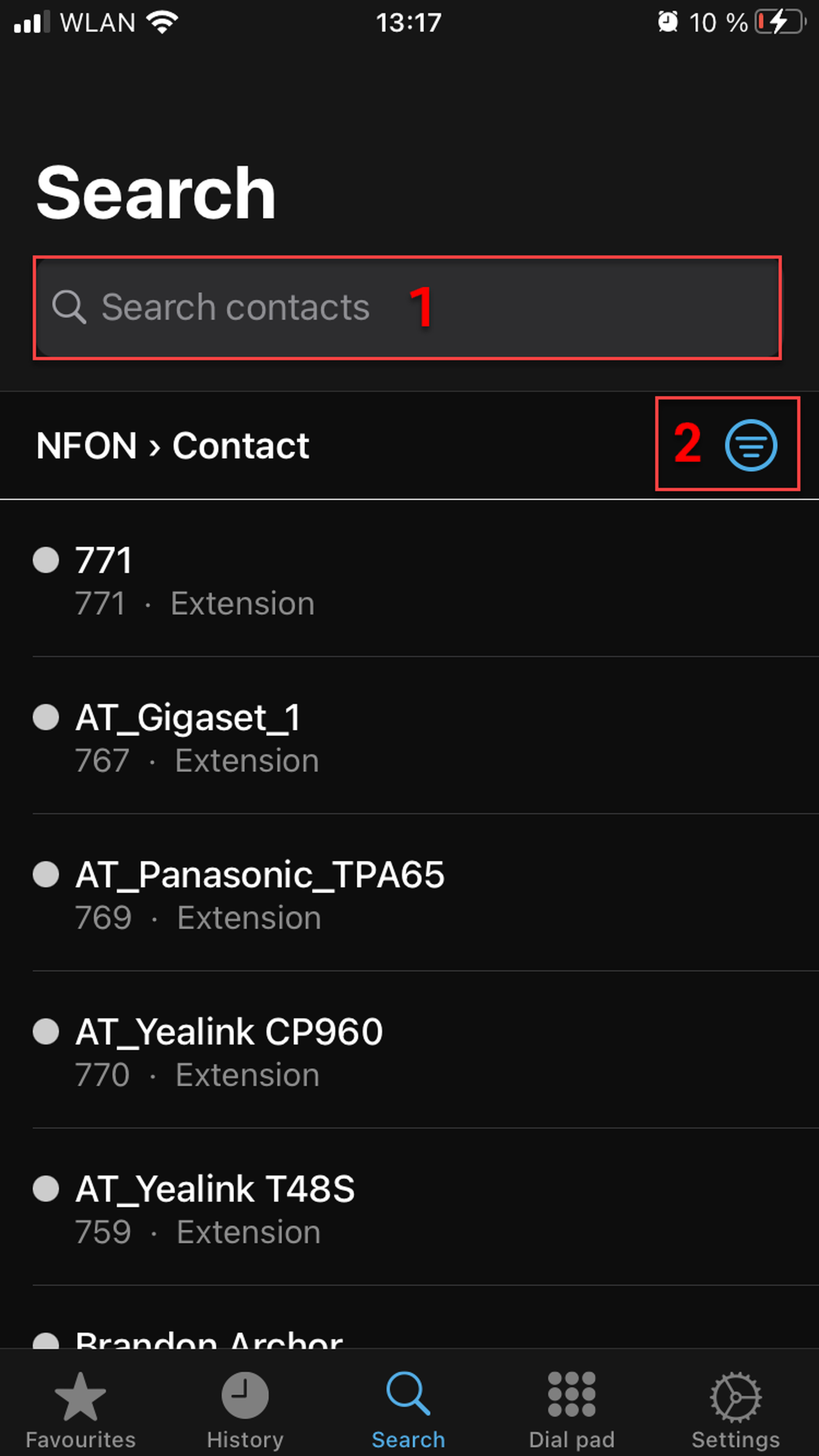 Switch to Favourites, Search, Dial pad or Settings tabs