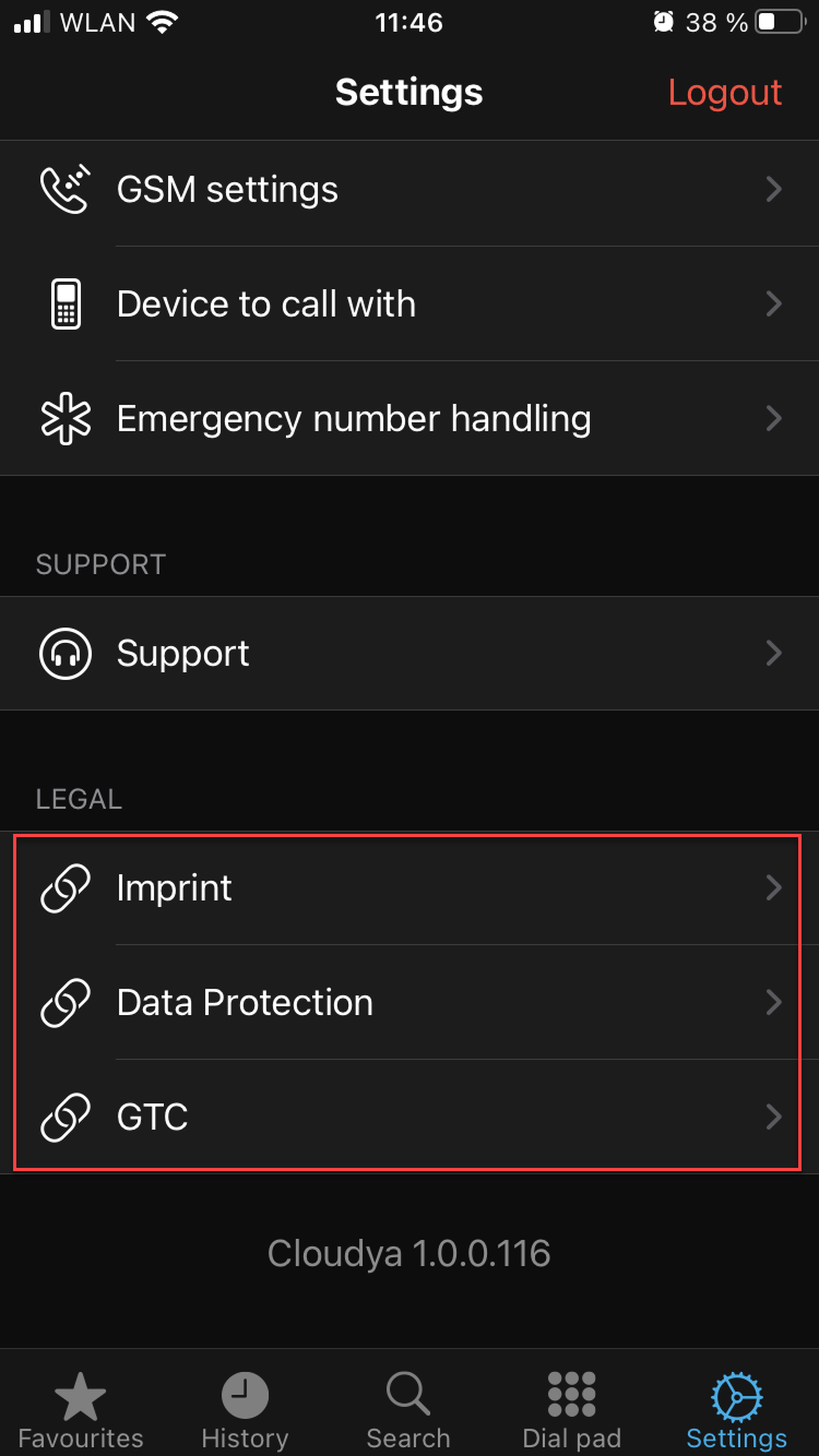 Tapping on Imprint, Data Protection or GTC will take you to the 1&1 Versatel website with the respective documents.